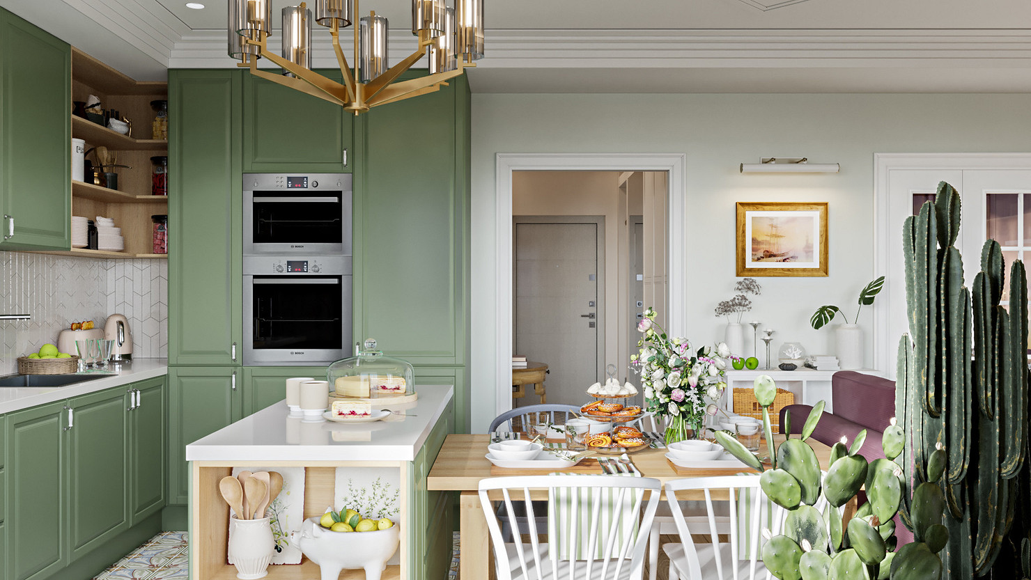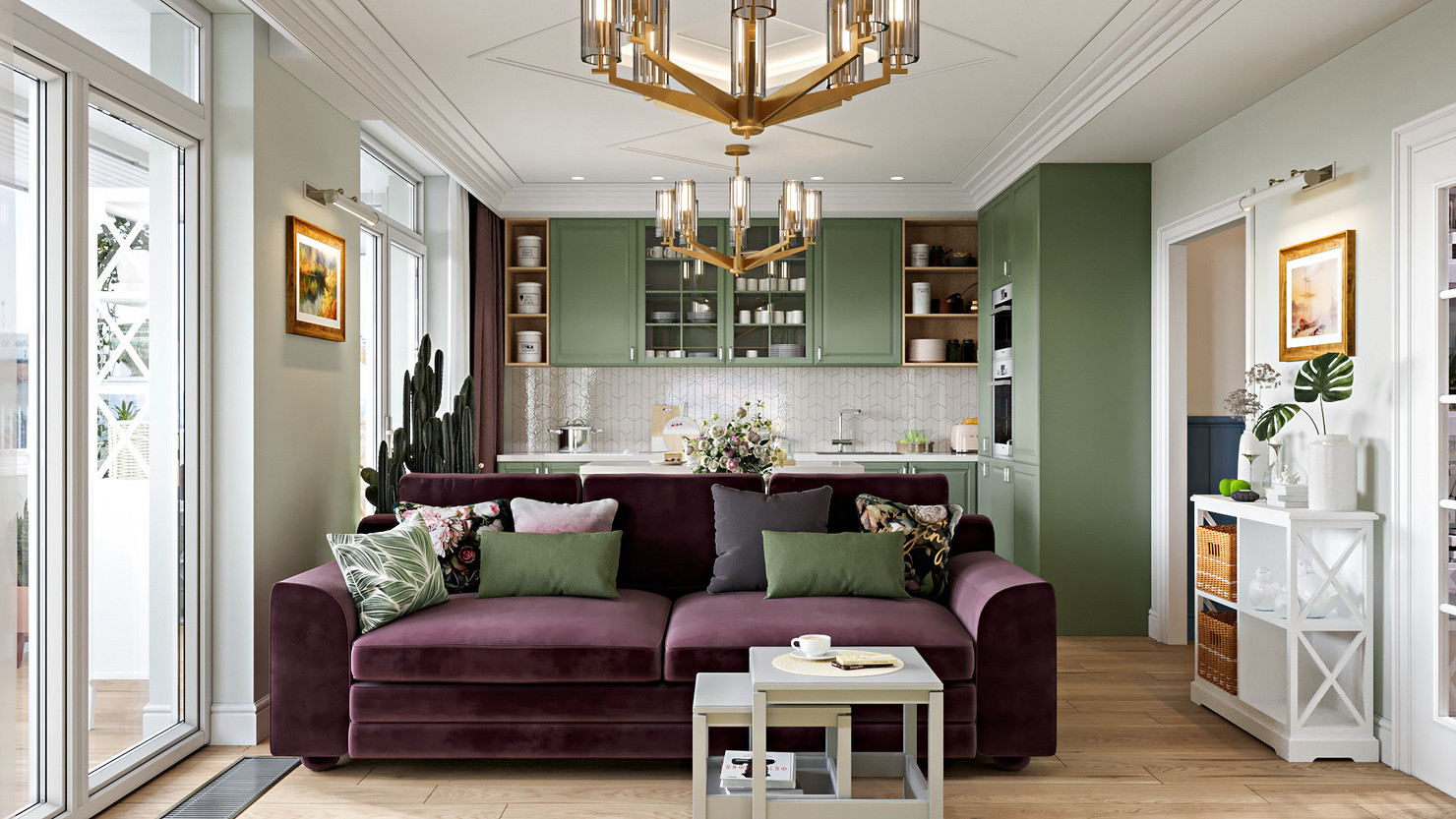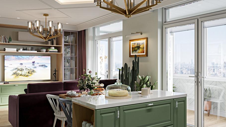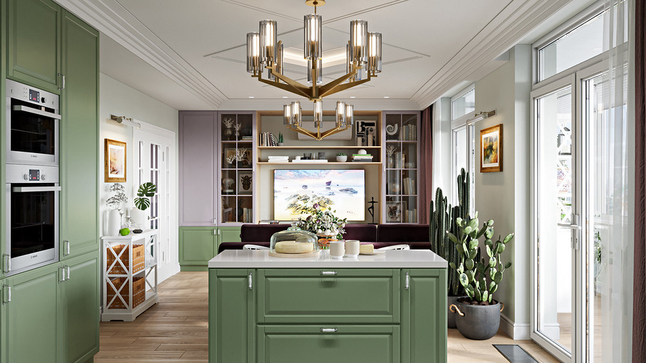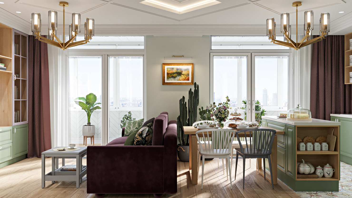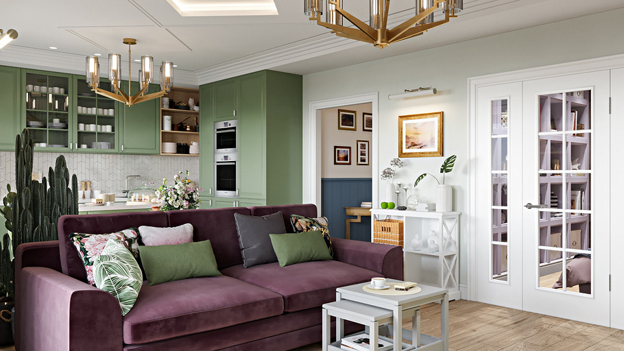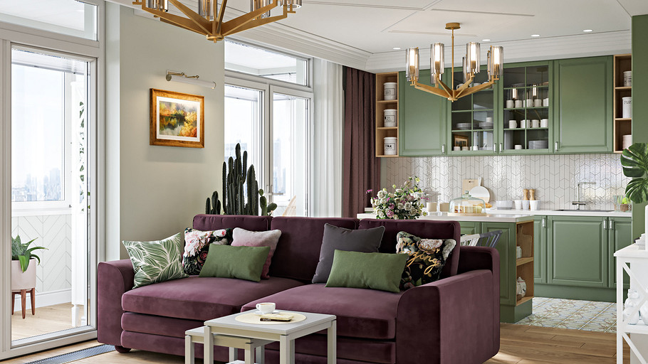 Дизайн проект этой квартиры был создан для обворожительной дамы. Легкой, интеллигентной и очень приятной в общении. Задача была создать удобное, комфортное пространство, наполненное цветами и шармом, где хозяйка могла бы с легкостью готовить чудесные блюда, отдыхать в кресле качалке на просторном балконе с котом на руках в окружение множества орхидей. Гостиная объединена с кухней и имеет большое панорамное остекление, образованное двумя большими стеклянными балконными дверьми, что придает пространству свободу и торжественность. В темное время суток, комнату освещают две шикарные латунные люстры. Плоскость потолка выстлана орнаментом из молдингов – эта геометрическая динамика орнамента задает темп всему пространству. Ненавязчивые орнаменты прослеживаются также в форме плитки и рисунках на ней. Хозяйка очень любит цветы и поэтому мятная зелень окутывает пространство, становясь фоном-поляной для множества цветов. Лиловый цвет также появился не случайно — хозяйка его обожает и я отдала этому цвету спальную комнату. Выбранный лиловый прекрасно подошел к мятному зеленому! Спальная комната небольшая, но при этом имеет множество различных мест хранения. Легкая гардеробная, отделенная текстильной шторой от основного пространства, а также моя задумка — открытый стеллаж из обычного ГКЛ. Комод, тумба и просторная кровать завершают композицию. У хозяйки имелась целая коллекция картин, что позволило нам обогатить интерьер утонченным вкусом. Для спальной комнаты прекрасно подошла картина с букетом сирени. В гостиной разместились пара картин с морскими пейзажами, а в прихожей — небольшие зарисовки городов, привезенные из путешествий. Входная группа получилась не менее интересной. Наличие антресольных ниш и просто открытых полок позволило оригинальным образом расположить плетеные короба и различные дамские мелочи. Картины, привезенные из разных путешествий, в сочетание с декором на стенах и потолке, а также латунные ретро светильники и зеркала — создают первое дыхание этого пространства. Несмотря на компактность квартиры, нам удалось разместить все необходимое и даже немного с запасом. При таком грамотном подходе — результат превзошел ожидание хозяйки, что не может не радовать меня!