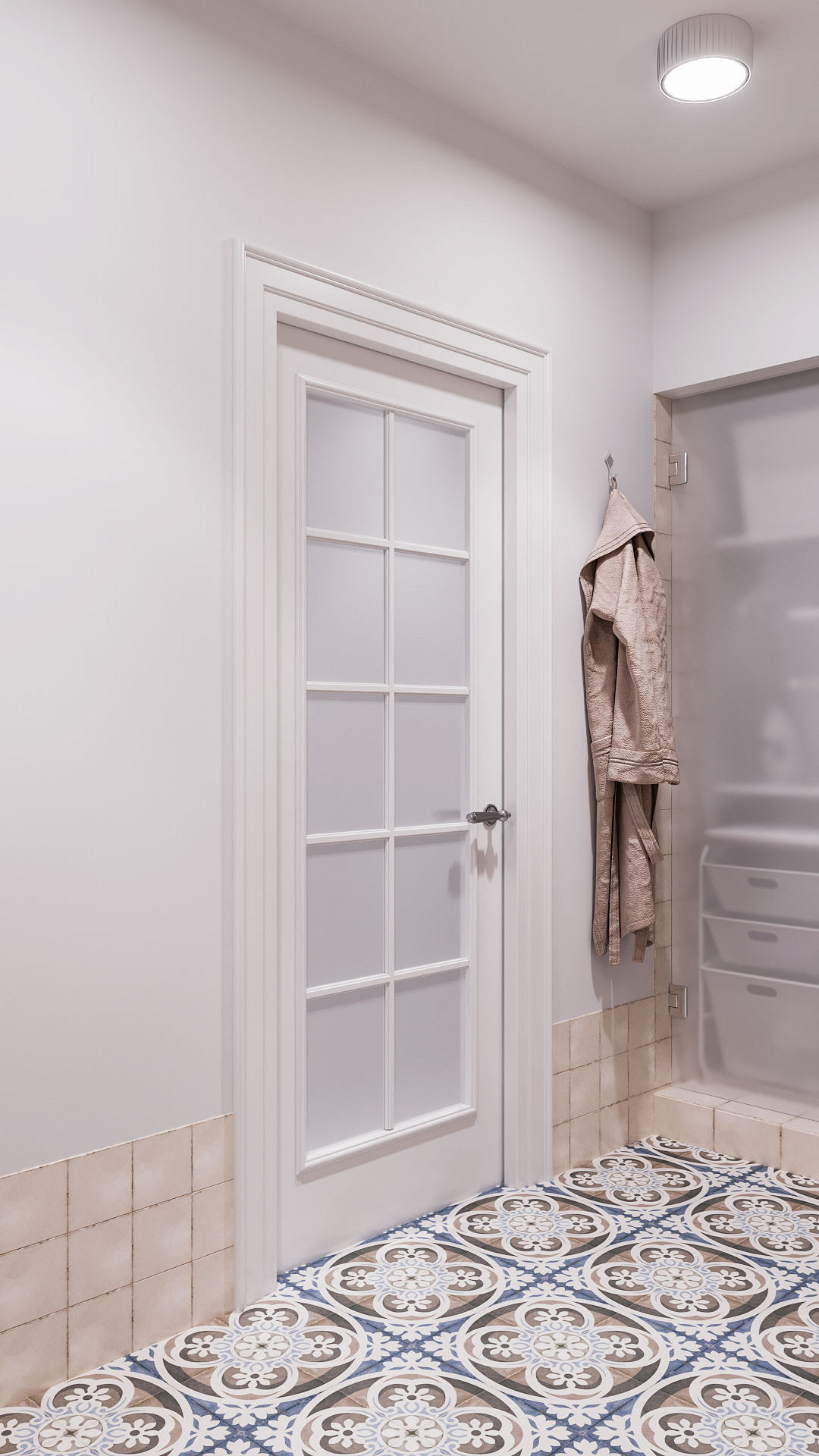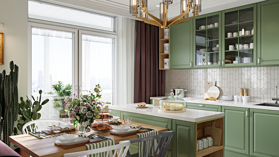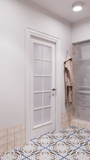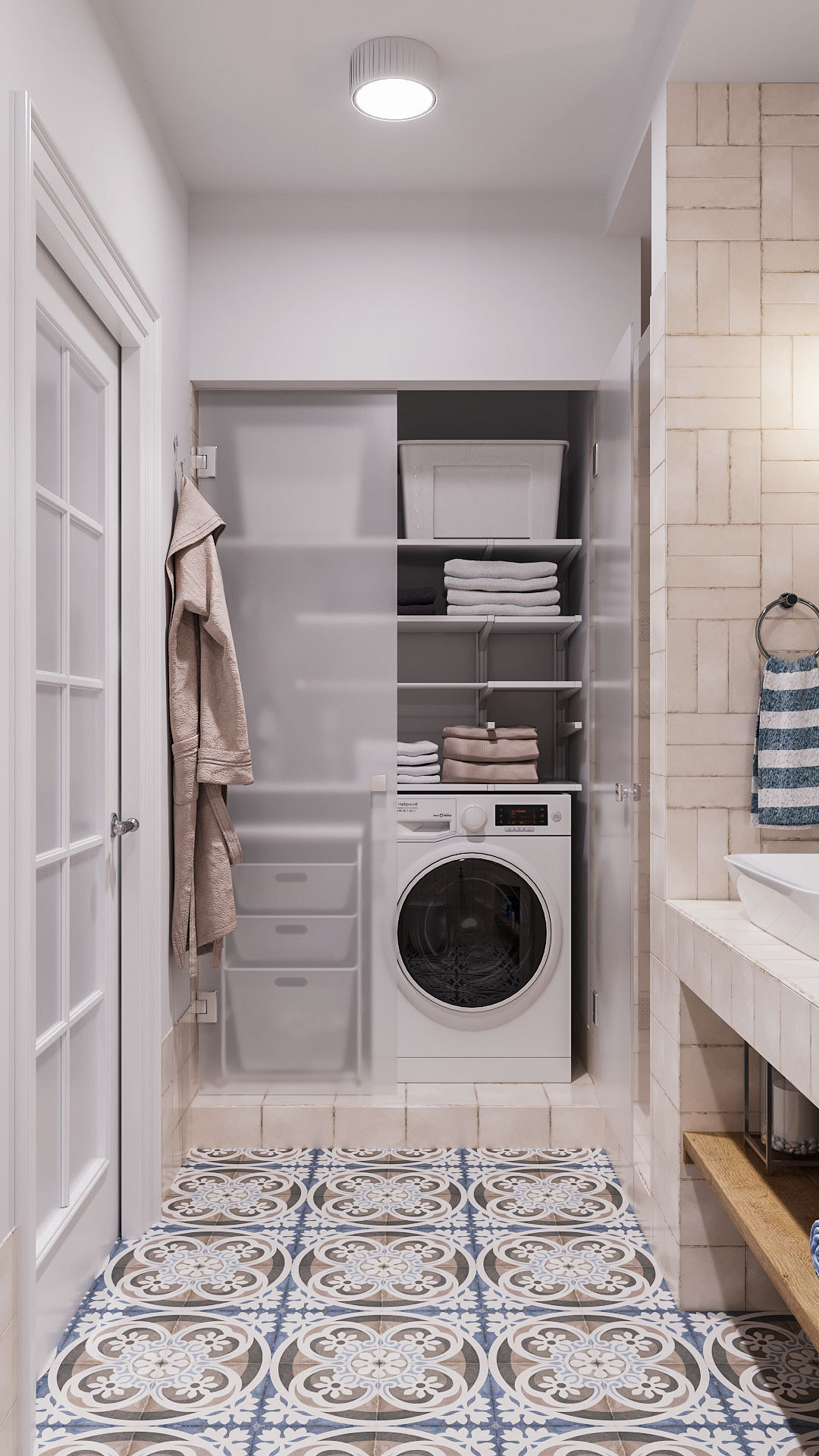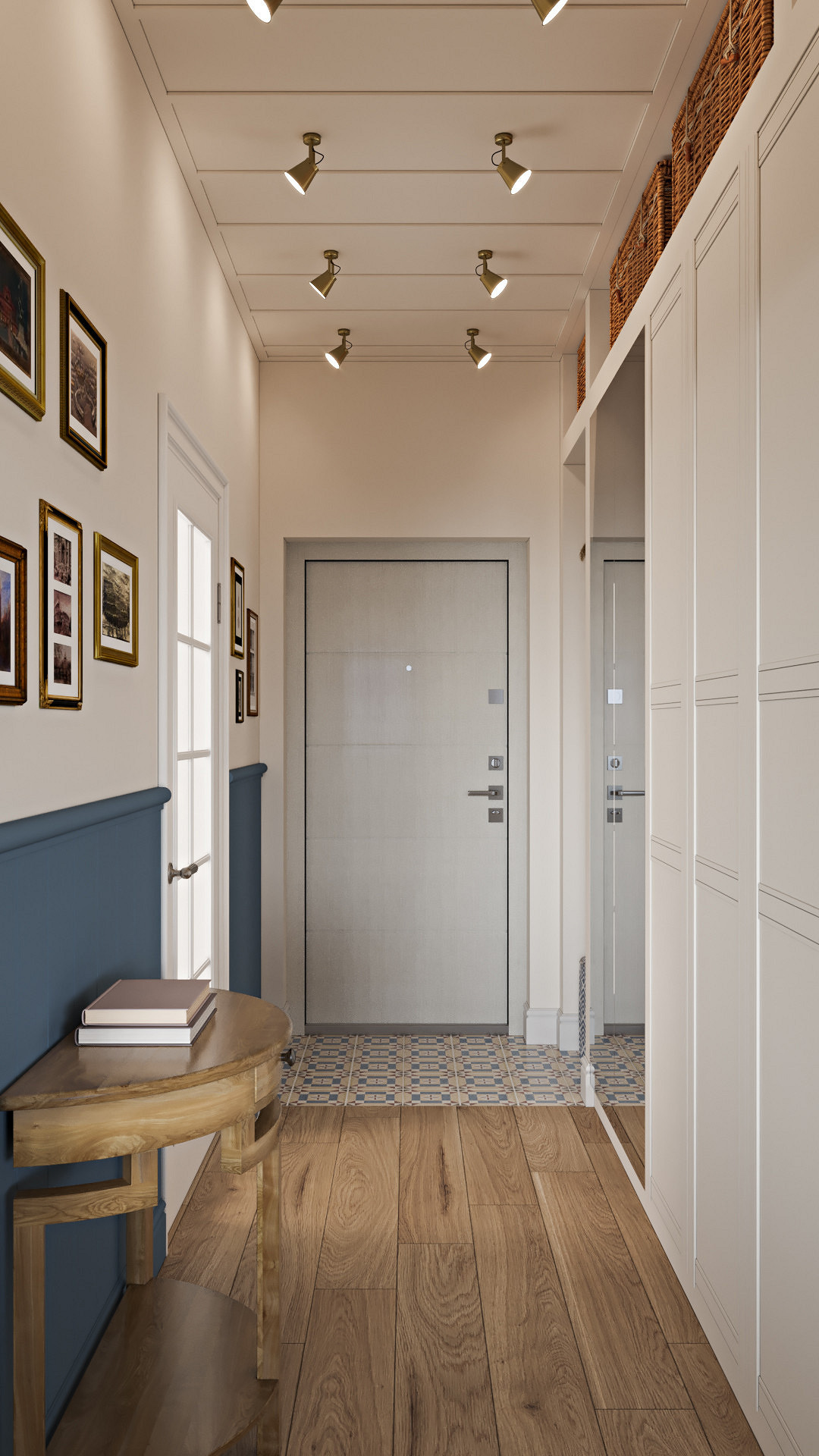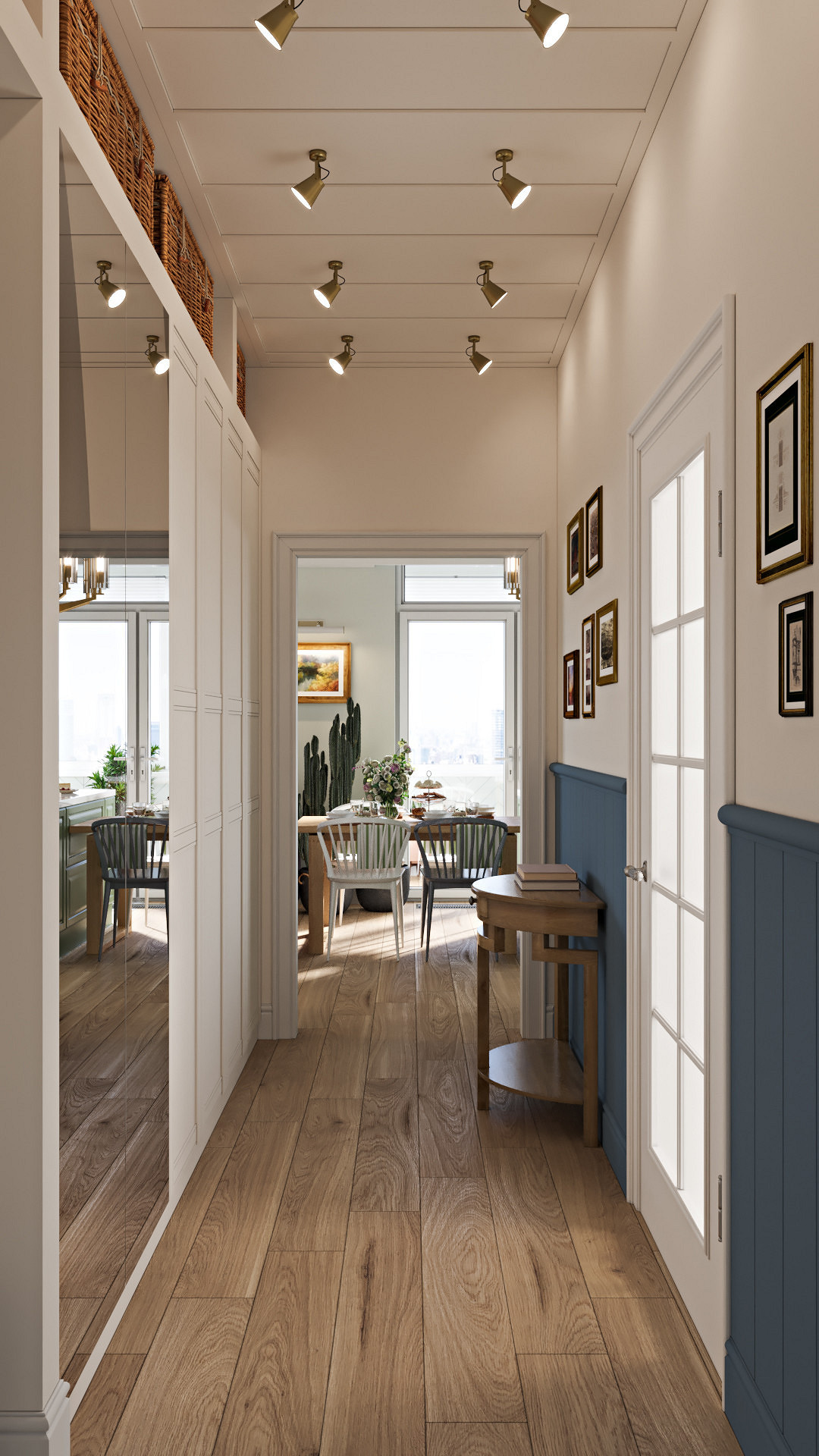 Дизайн проект этой квартиры был создан для обворожительной дамы. Легкой, интеллигентной и очень приятной в общении. Задача была создать удобное, комфортное пространство, наполненное цветами и шармом, где хозяйка могла бы с легкостью готовить чудесные блюда, отдыхать в кресле качалке на просторном балконе с котом на руках в окружение множества орхидей. Гостиная объединена с кухней и имеет большое панорамное остекление, образованное двумя большими стеклянными балконными дверьми, что придает пространству свободу и торжественность. В темное время суток, комнату освещают две шикарные латунные люстры. Плоскость потолка выстлана орнаментом из молдингов – эта геометрическая динамика орнамента задает темп всему пространству. Ненавязчивые орнаменты прослеживаются также в форме плитки и рисунках на ней. Хозяйка очень любит цветы и поэтому мятная зелень окутывает пространство, становясь фоном-поляной для множества цветов. Лиловый цвет также появился не случайно — хозяйка его обожает и я отдала этому цвету спальную комнату. Выбранный лиловый прекрасно подошел к мятному зеленому! Спальная комната небольшая, но при этом имеет множество различных мест хранения. Легкая гардеробная, отделенная текстильной шторой от основного пространства, а также моя задумка — открытый стеллаж из обычного ГКЛ. Комод, тумба и просторная кровать завершают композицию. У хозяйки имелась целая коллекция картин, что позволило нам обогатить интерьер утонченным вкусом. Для спальной комнаты прекрасно подошла картина с букетом сирени. В гостиной разместились пара картин с морскими пейзажами, а в прихожей — небольшие зарисовки городов, привезенные из путешествий. Входная группа получилась не менее интересной. Наличие антресольных ниш и просто открытых полок позволило оригинальным образом расположить плетеные короба и различные дамские мелочи. Картины, привезенные из разных путешествий, в сочетание с декором на стенах и потолке, а также латунные ретро светильники и зеркала — создают первое дыхание этого пространства. Несмотря на компактность квартиры, нам удалось разместить все необходимое и даже немного с запасом. При таком грамотном подходе — результат превзошел ожидание хозяйки, что не может не радовать меня!