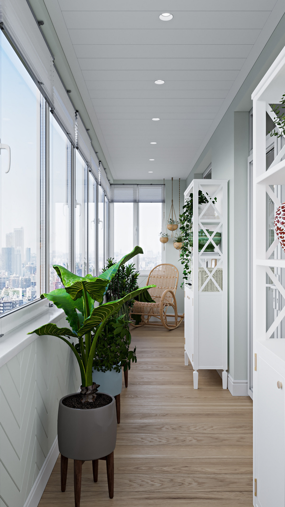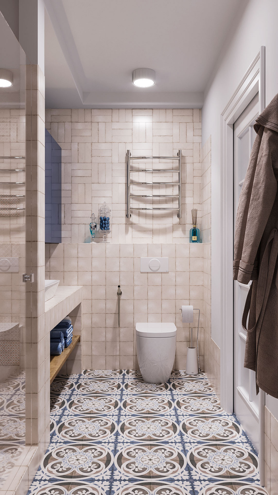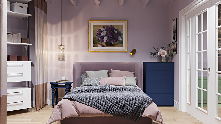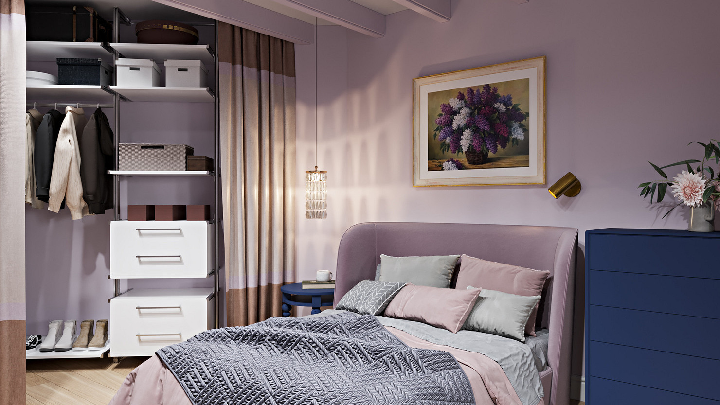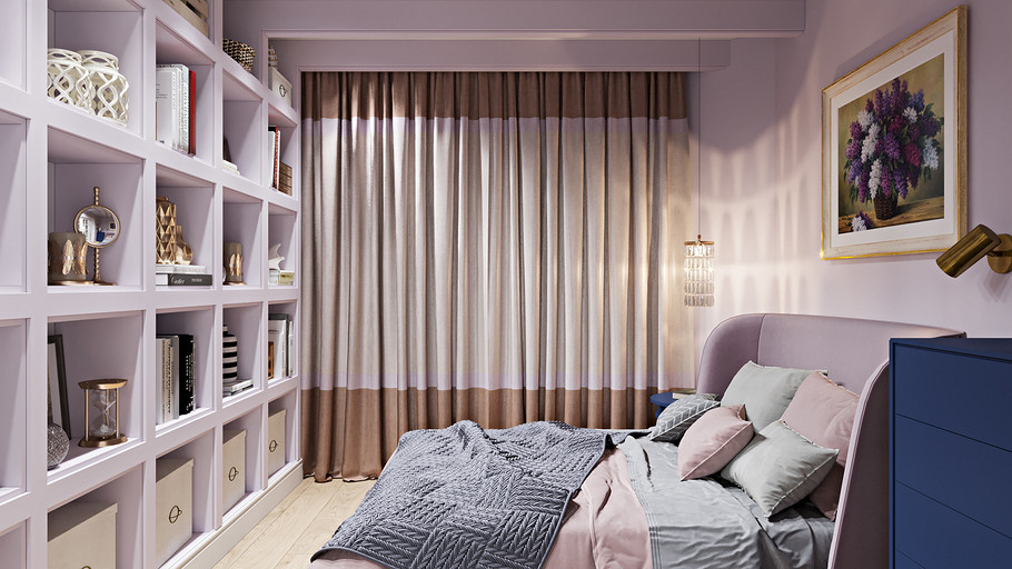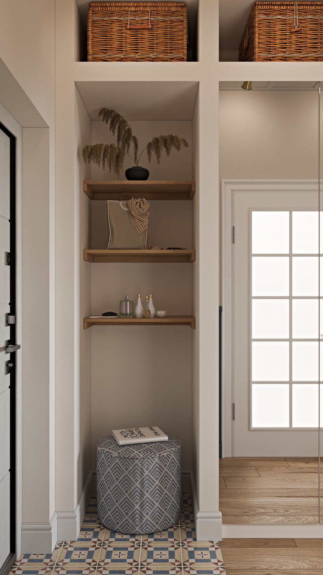 Дизайн проект этой квартиры был создан для обворожительной дамы. Легкой, интеллигентной и очень приятной в общении. Задача была создать удобное, комфортное пространство, наполненное цветами и шармом, где хозяйка могла бы с легкостью готовить чудесные блюда, отдыхать в кресле качалке на просторном балконе с котом на руках в окружение множества орхидей. Гостиная объединена с кухней и имеет большое панорамное остекление, образованное двумя большими стеклянными балконными дверьми, что придает пространству свободу и торжественность. В темное время суток, комнату освещают две шикарные латунные люстры. Плоскость потолка выстлана орнаментом из молдингов – эта геометрическая динамика орнамента задает темп всему пространству. Ненавязчивые орнаменты прослеживаются также в форме плитки и рисунках на ней. Хозяйка очень любит цветы и поэтому мятная зелень окутывает пространство, становясь фоном-поляной для множества цветов. Лиловый цвет также появился не случайно — хозяйка его обожает и я отдала этому цвету спальную комнату. Выбранный лиловый прекрасно подошел к мятному зеленому! Спальная комната небольшая, но при этом имеет множество различных мест хранения. Легкая гардеробная, отделенная текстильной шторой от основного пространства, а также моя задумка — открытый стеллаж из обычного ГКЛ. Комод, тумба и просторная кровать завершают композицию. У хозяйки имелась целая коллекция картин, что позволило нам обогатить интерьер утонченным вкусом. Для спальной комнаты прекрасно подошла картина с букетом сирени. В гостиной разместились пара картин с морскими пейзажами, а в прихожей — небольшие зарисовки городов, привезенные из путешествий. Входная группа получилась не менее интересной. Наличие антресольных ниш и просто открытых полок позволило оригинальным образом расположить плетеные короба и различные дамские мелочи. Картины, привезенные из разных путешествий, в сочетание с декором на стенах и потолке, а также латунные ретро светильники и зеркала — создают первое дыхание этого пространства. Несмотря на компактность квартиры, нам удалось разместить все необходимое и даже немного с запасом. При таком грамотном подходе — результат превзошел ожидание хозяйки, что не может не радовать меня!