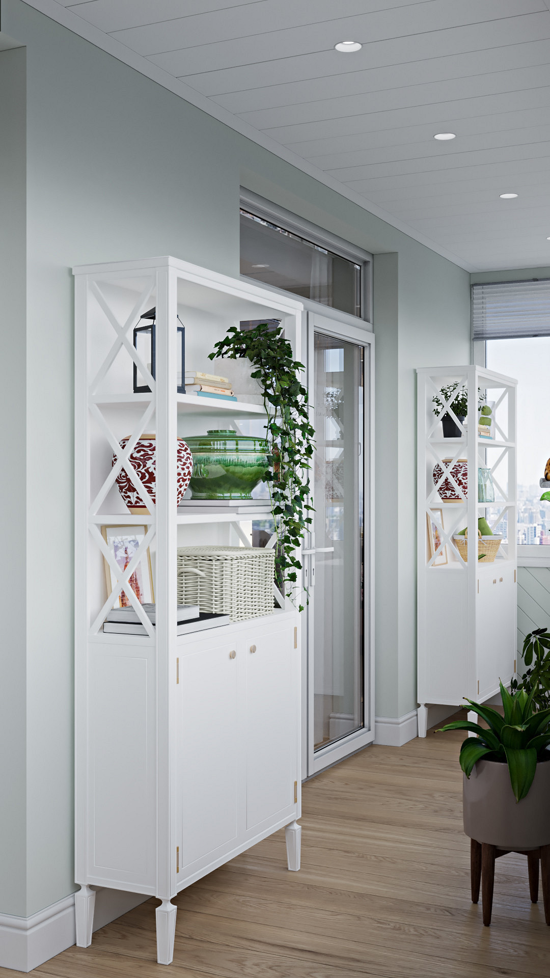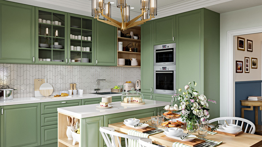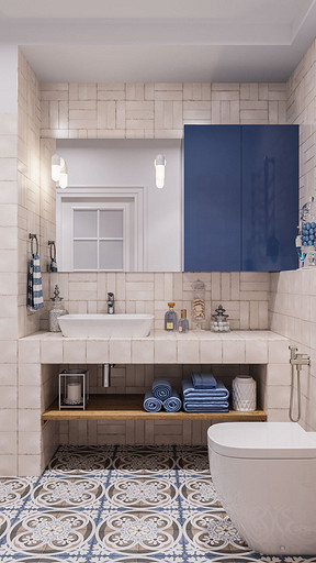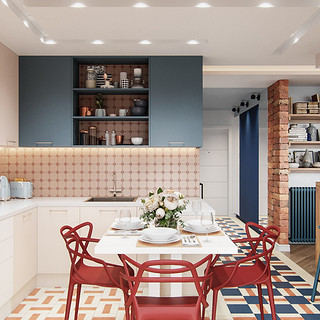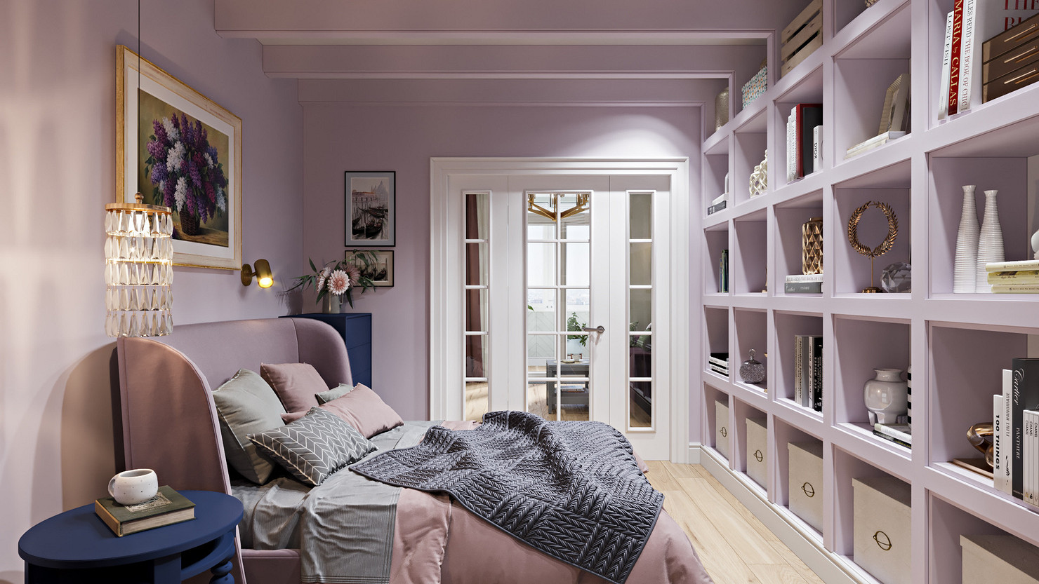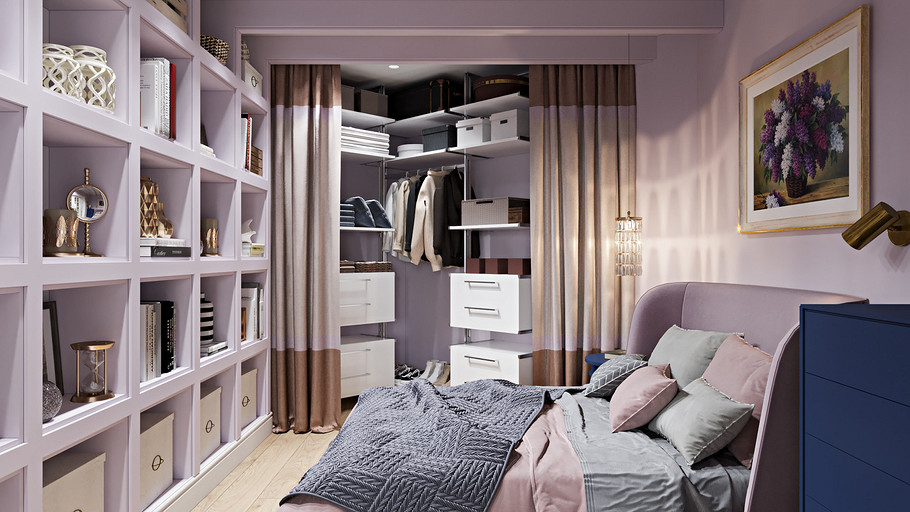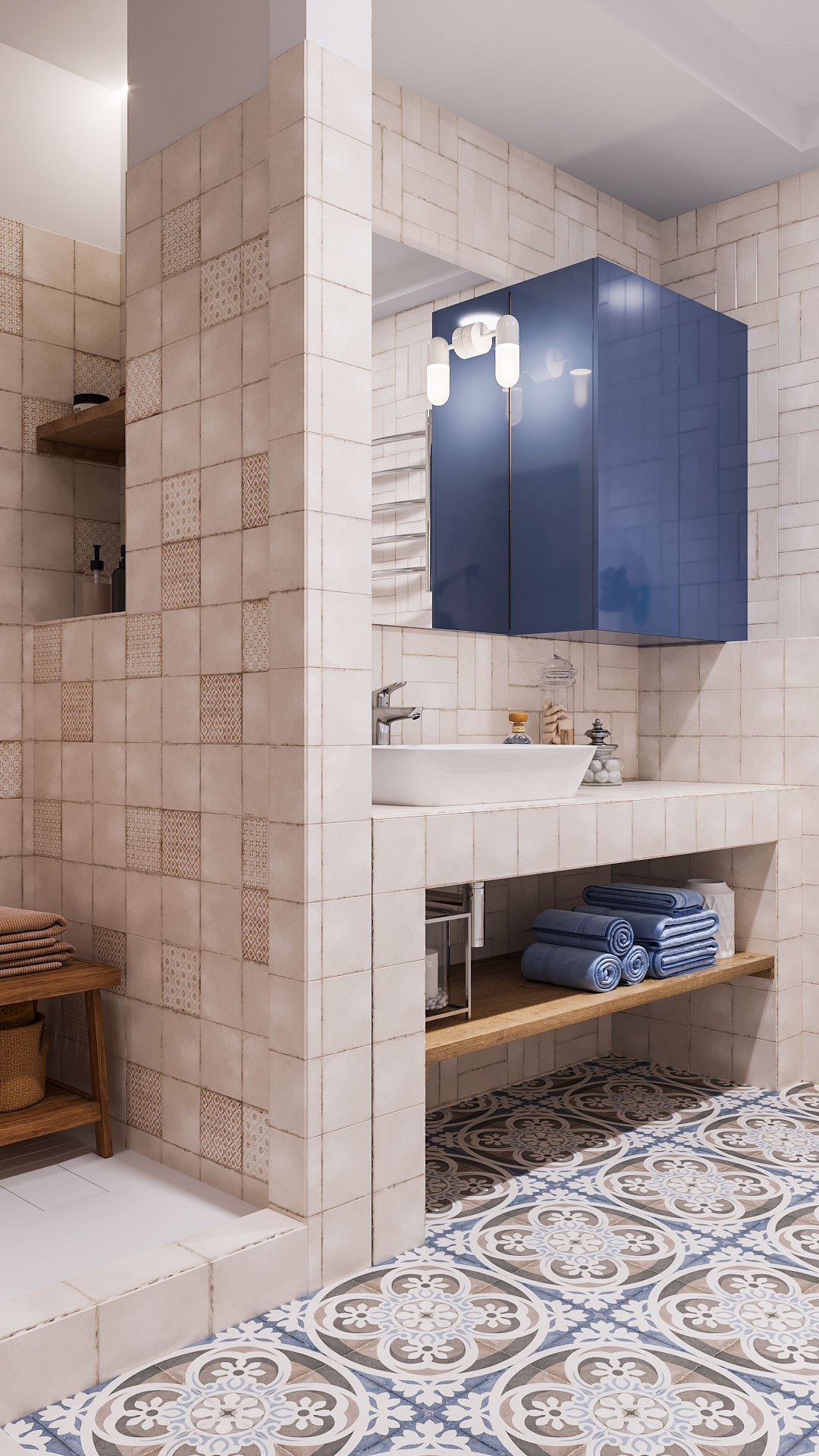 Дизайн проект этой квартиры был создан для обворожительной дамы. Легкой, интеллигентной и очень приятной в общении. Задача была создать удобное, комфортное пространство, наполненное цветами и шармом, где хозяйка могла бы с легкостью готовить чудесные блюда, отдыхать в кресле качалке на просторном балконе с котом на руках в окружение множества орхидей. Гостиная объединена с кухней и имеет большое панорамное остекление, образованное двумя большими стеклянными балконными дверьми, что придает пространству свободу и торжественность. В темное время суток, комнату освещают две шикарные латунные люстры. Плоскость потолка выстлана орнаментом из молдингов – эта геометрическая динамика орнамента задает темп всему пространству. Ненавязчивые орнаменты прослеживаются также в форме плитки и рисунках на ней. Хозяйка очень любит цветы и поэтому мятная зелень окутывает пространство, становясь фоном-поляной для множества цветов. Лиловый цвет также появился не случайно — хозяйка его обожает и я отдала этому цвету спальную комнату. Выбранный лиловый прекрасно подошел к мятному зеленому! Спальная комната небольшая, но при этом имеет множество различных мест хранения. Легкая гардеробная, отделенная текстильной шторой от основного пространства, а также моя задумка — открытый стеллаж из обычного ГКЛ. Комод, тумба и просторная кровать завершают композицию. У хозяйки имелась целая коллекция картин, что позволило нам обогатить интерьер утонченным вкусом. Для спальной комнаты прекрасно подошла картина с букетом сирени. В гостиной разместились пара картин с морскими пейзажами, а в прихожей — небольшие зарисовки городов, привезенные из путешествий. Входная группа получилась не менее интересной. Наличие антресольных ниш и просто открытых полок позволило оригинальным образом расположить плетеные короба и различные дамские мелочи. Картины, привезенные из разных путешествий, в сочетание с декором на стенах и потолке, а также латунные ретро светильники и зеркала — создают первое дыхание этого пространства. Несмотря на компактность квартиры, нам удалось разместить все необходимое и даже немного с запасом. При таком грамотном подходе — результат превзошел ожидание хозяйки, что не может не радовать меня!