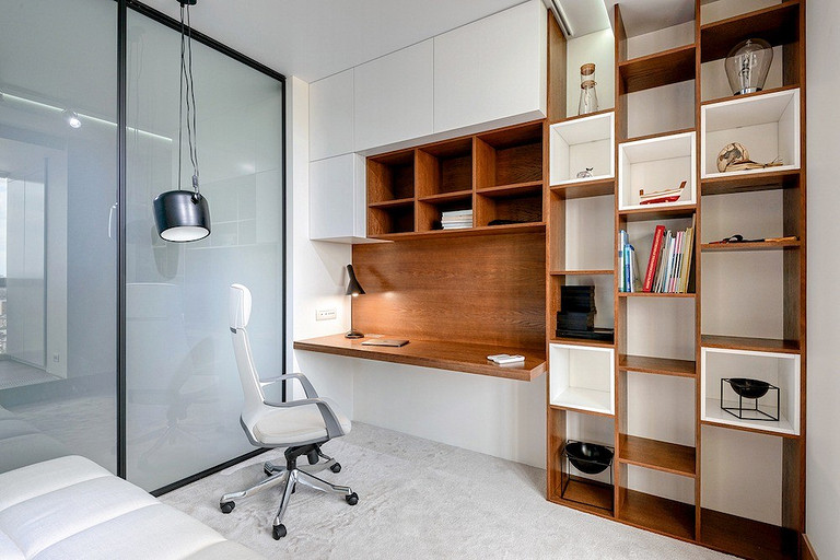 - Мебель: диван Voyage Immobile, композиция рабочей зоны, стеллаж Raum