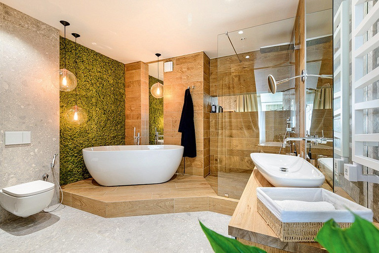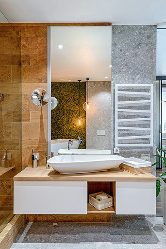 - Стены: штукатурка декоративная Derufa, плитка керамогранитная Equipe