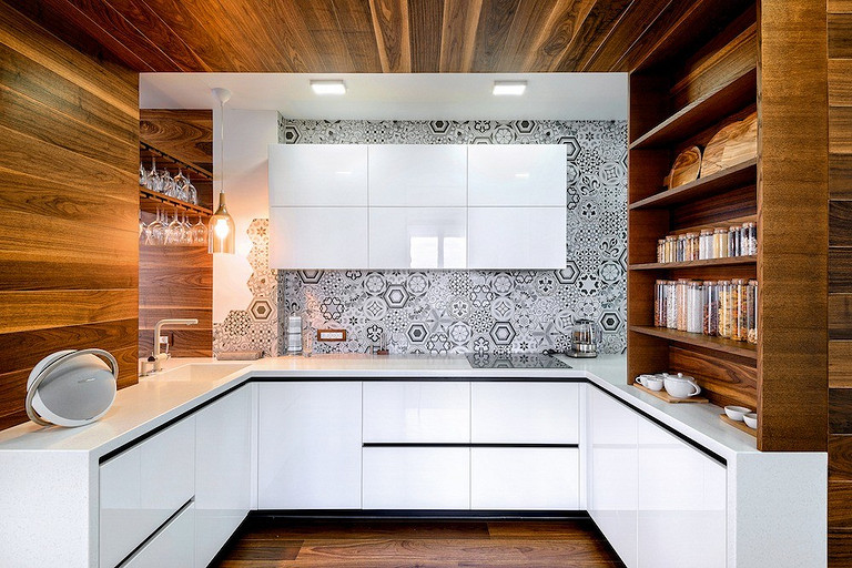 - Стены: панели — паркетная доска Miester, кухонный «фартук» Equipe