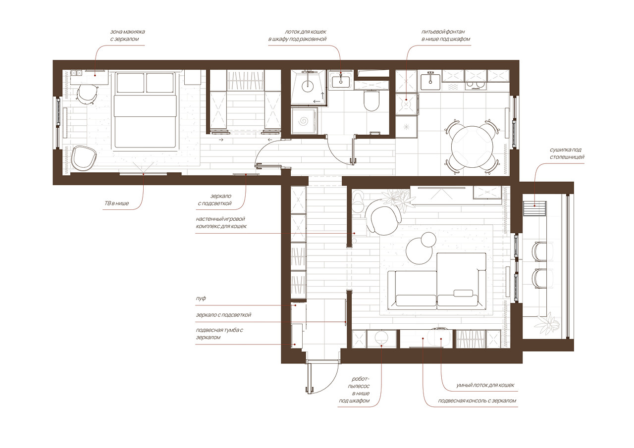 - Мебель: SK Design, Lavsit, «Светоч», Inmyroom, La Redoute, корпусная «Омега» (на заказ)