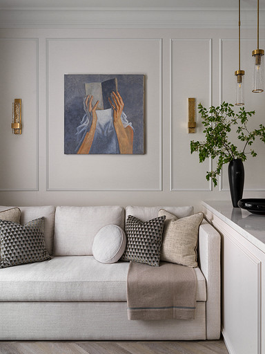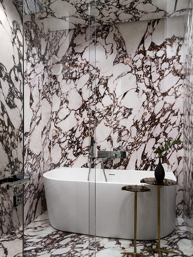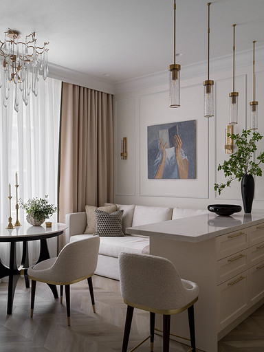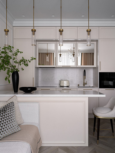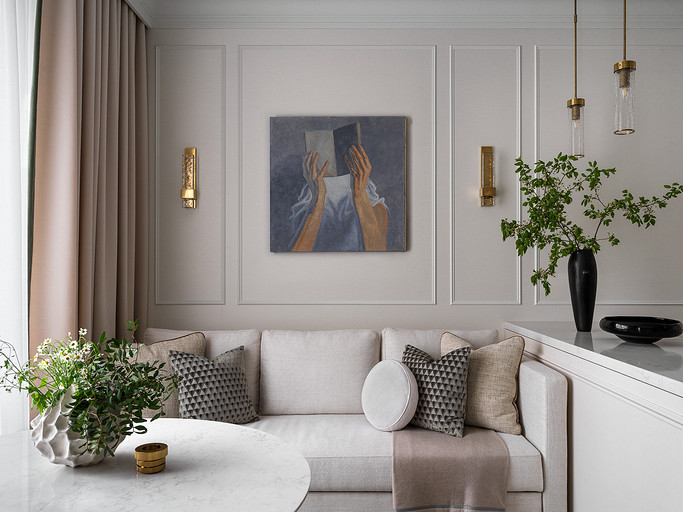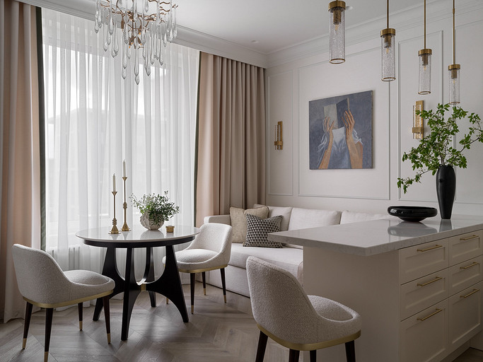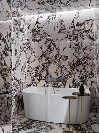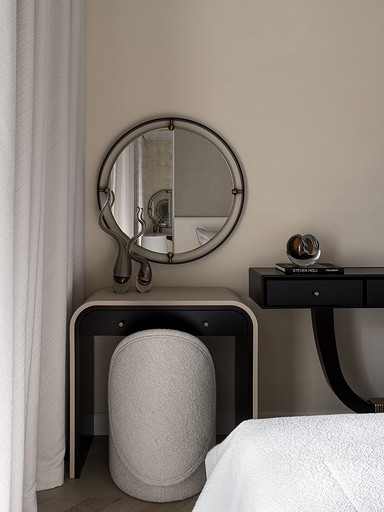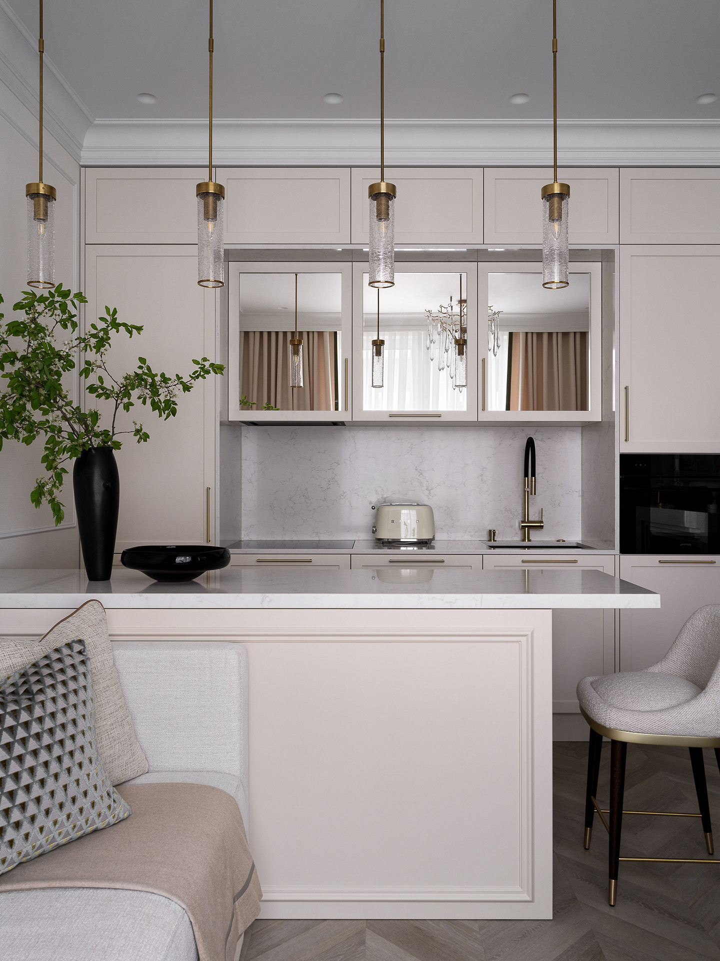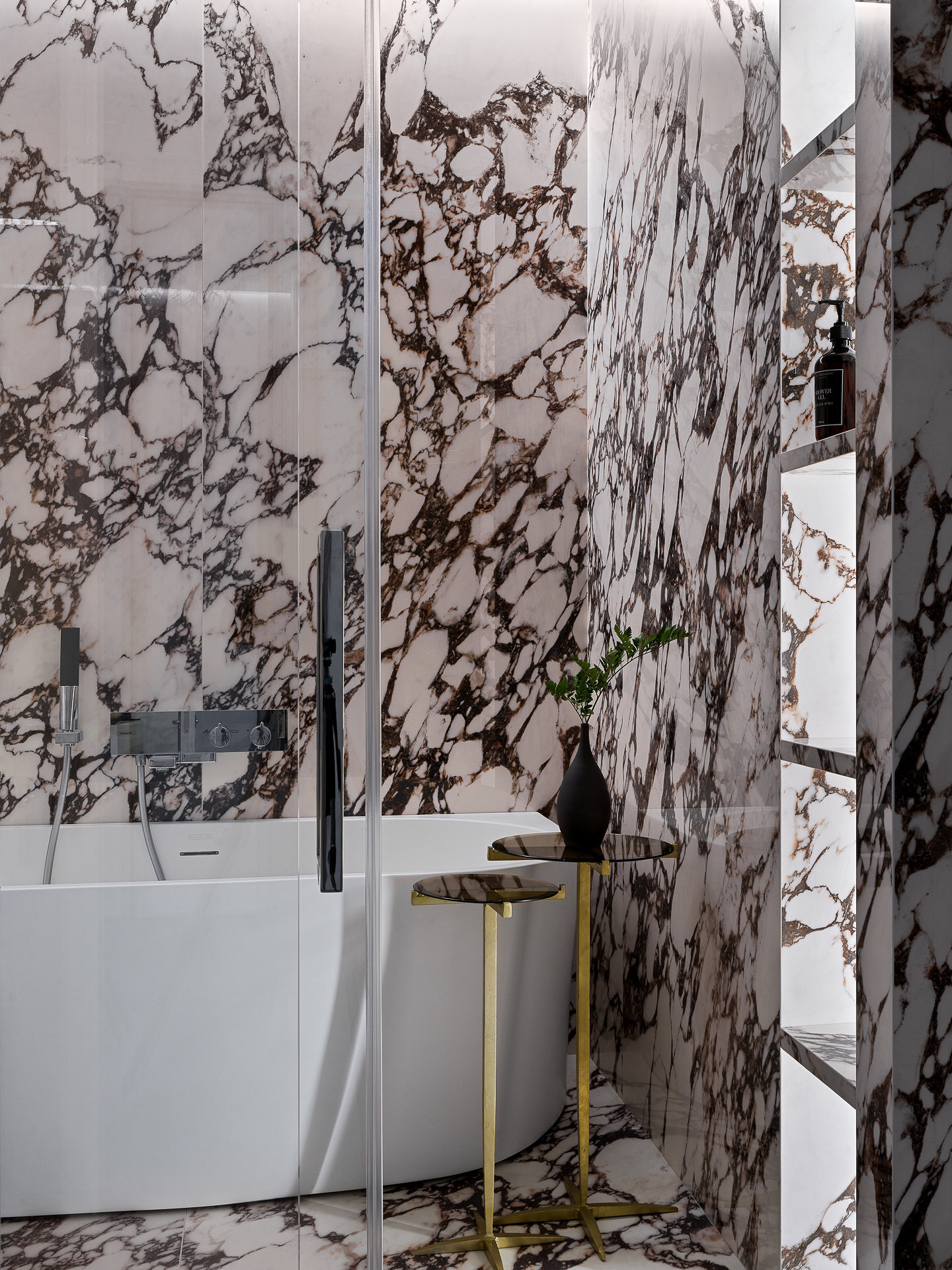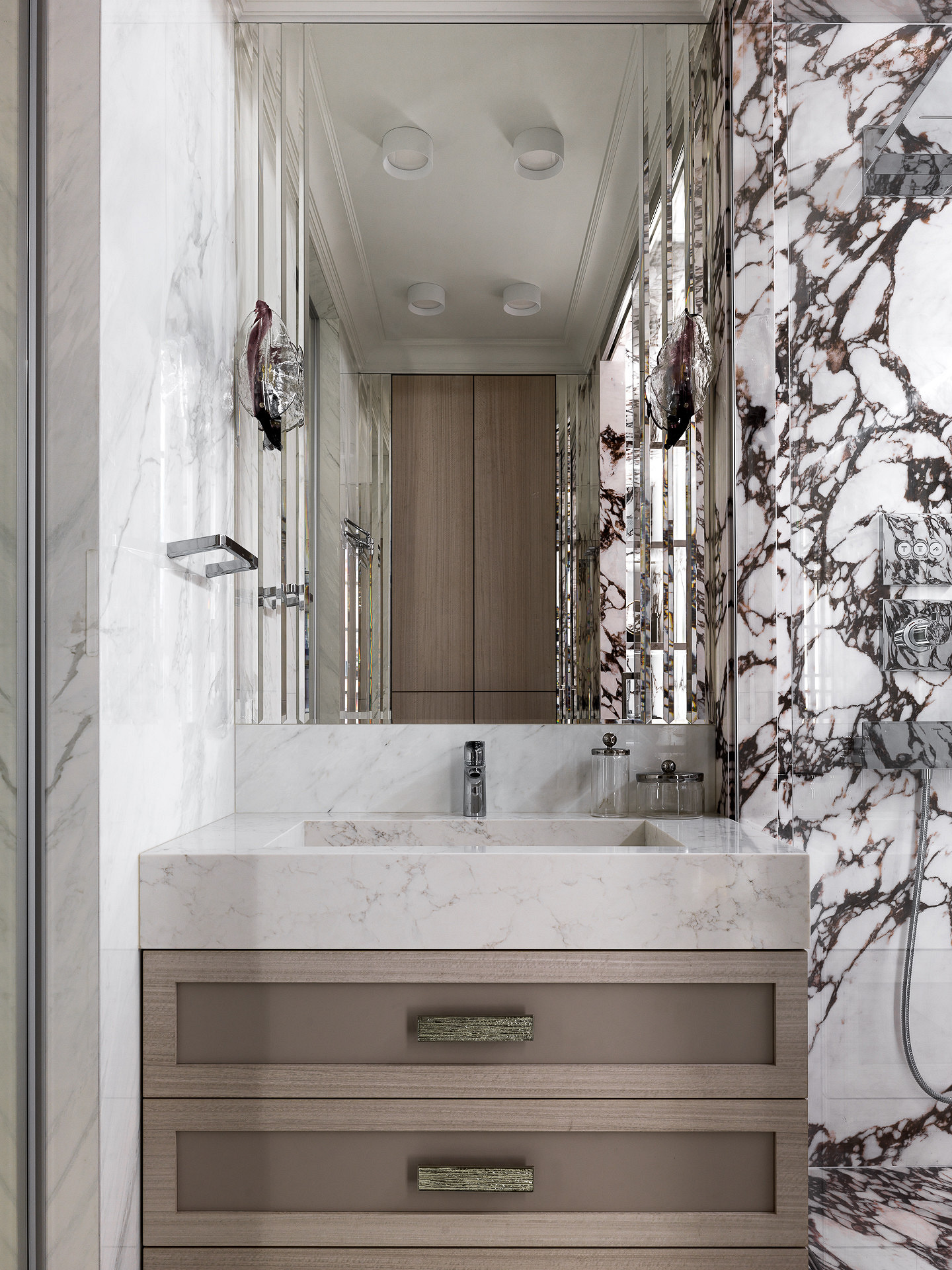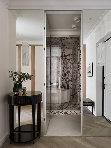 - Мебель: банкетка и консоль в прихожей Polina Pidtsan Maison, диван, стулья, тумбы в спальне, туалетный столик и консоль в спальне Sofas Decor, мрамор Venezia Stone, фурнитура Maru Studio
