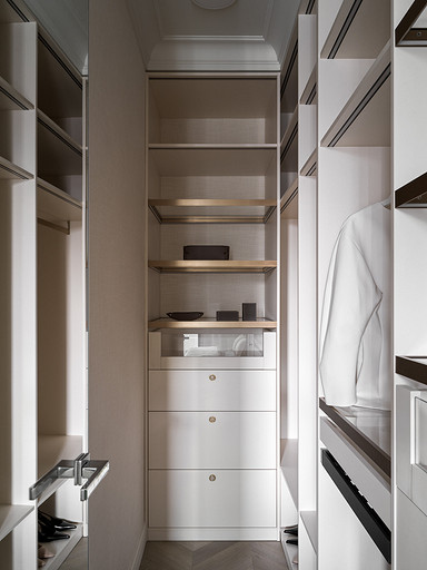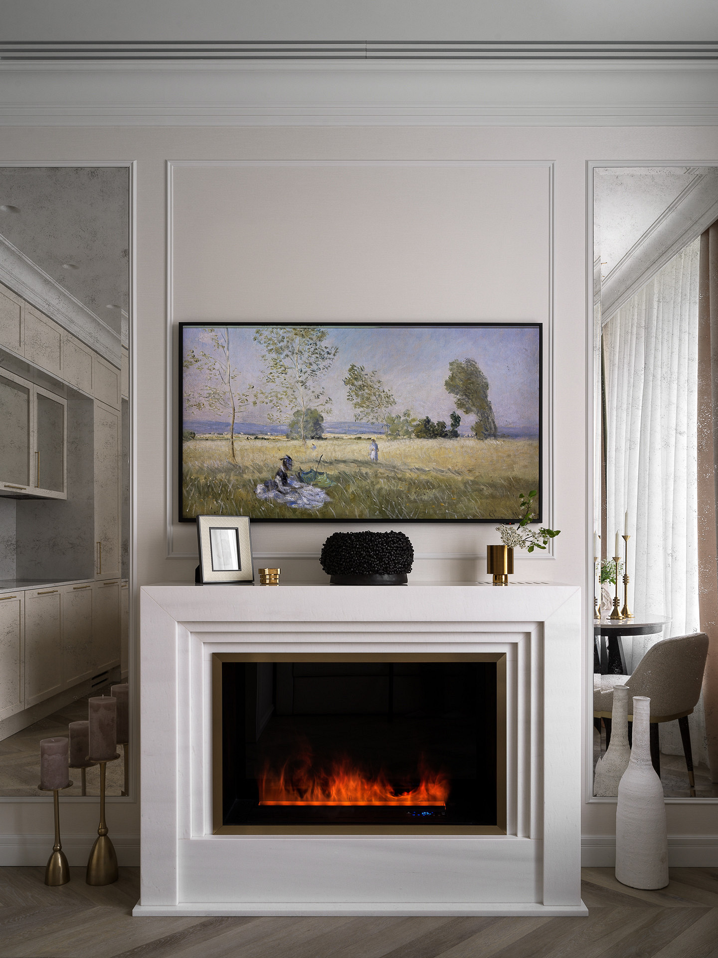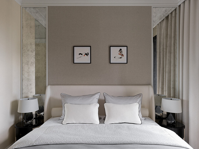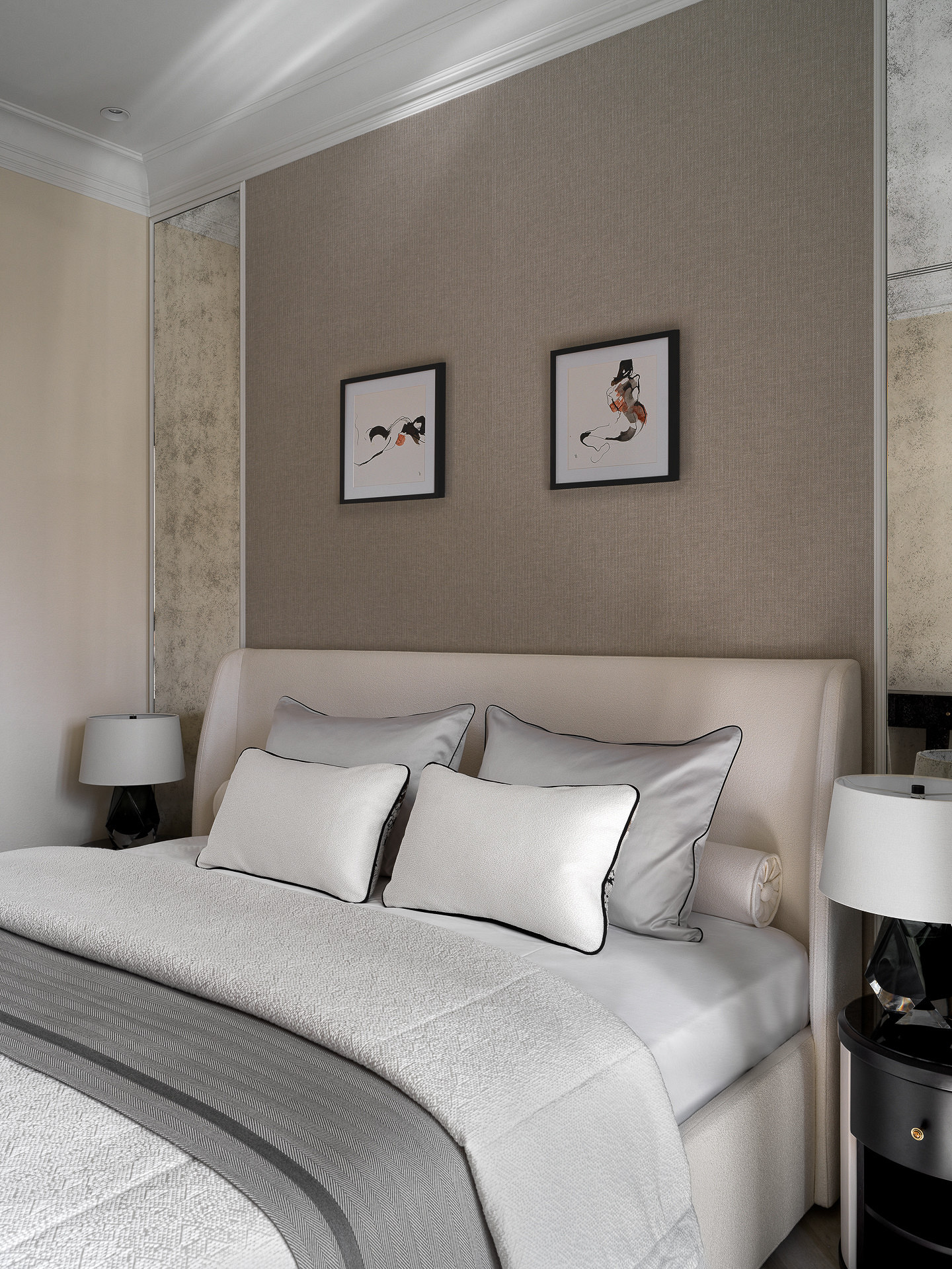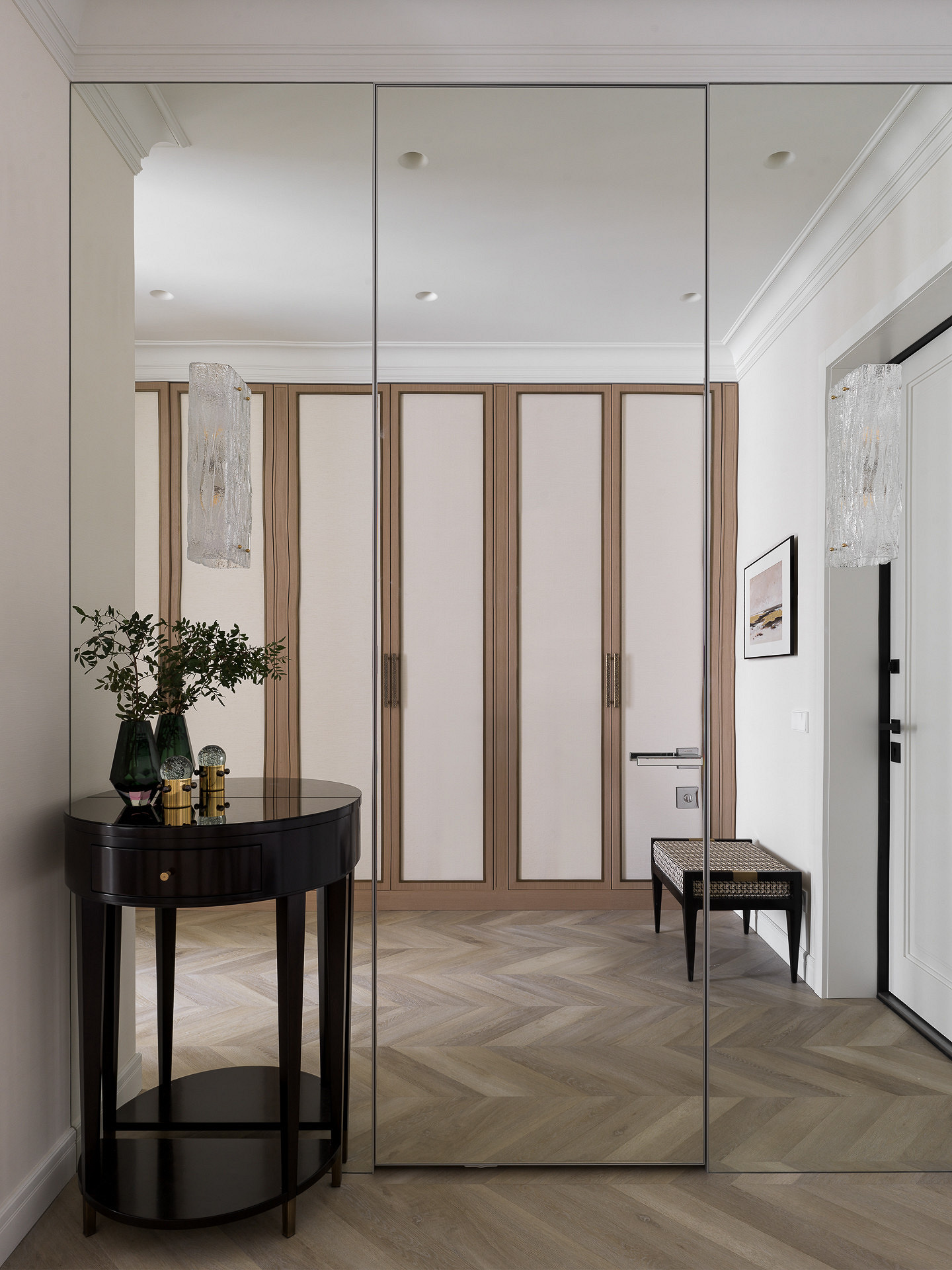 - Стены: текстильные обои на стенах и фасадах шкафа Yana Svetlova, зеркальные панно Papa Carlo