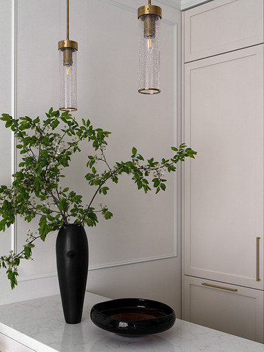 - Освещение: люстра над столом Serip, подвесы на кухне и бра Visual Comfort & Co, люстра в спальне Aerin Lauder, настольные лампы в спальне Chapman & Myers, светильники в санузле — винтаж, технический свет Donolux