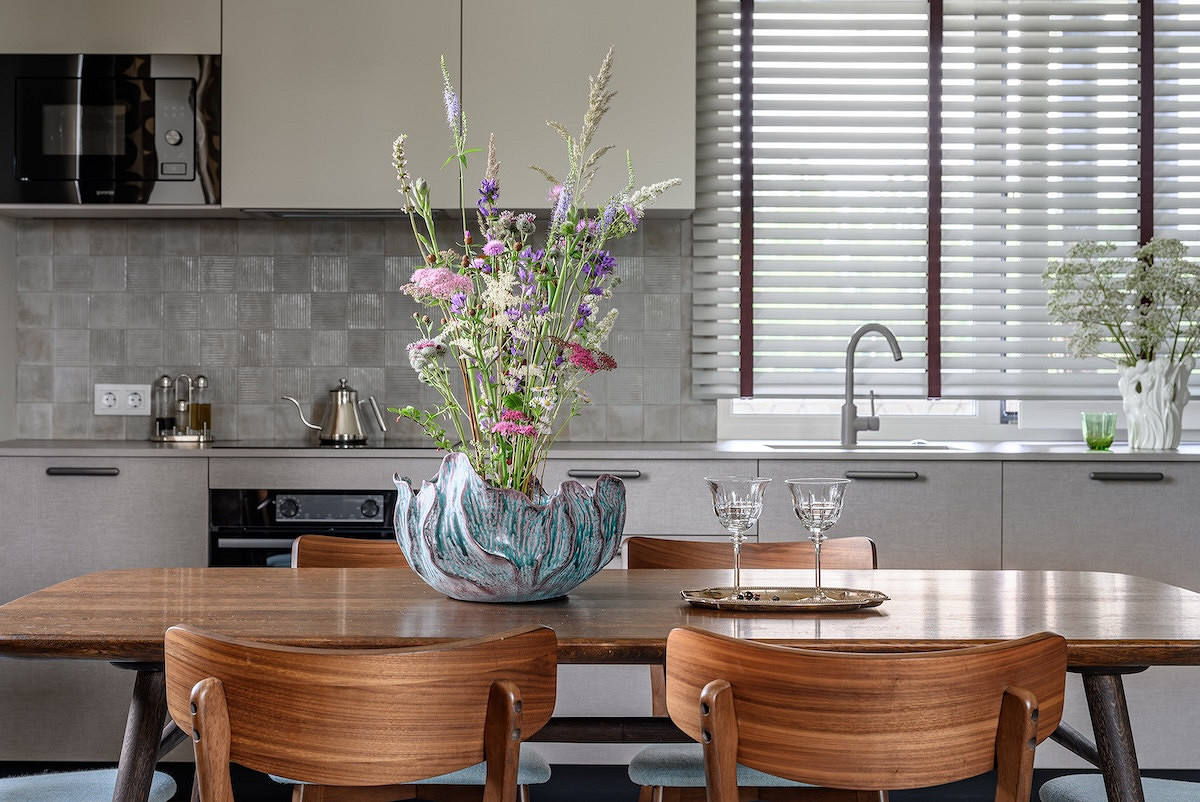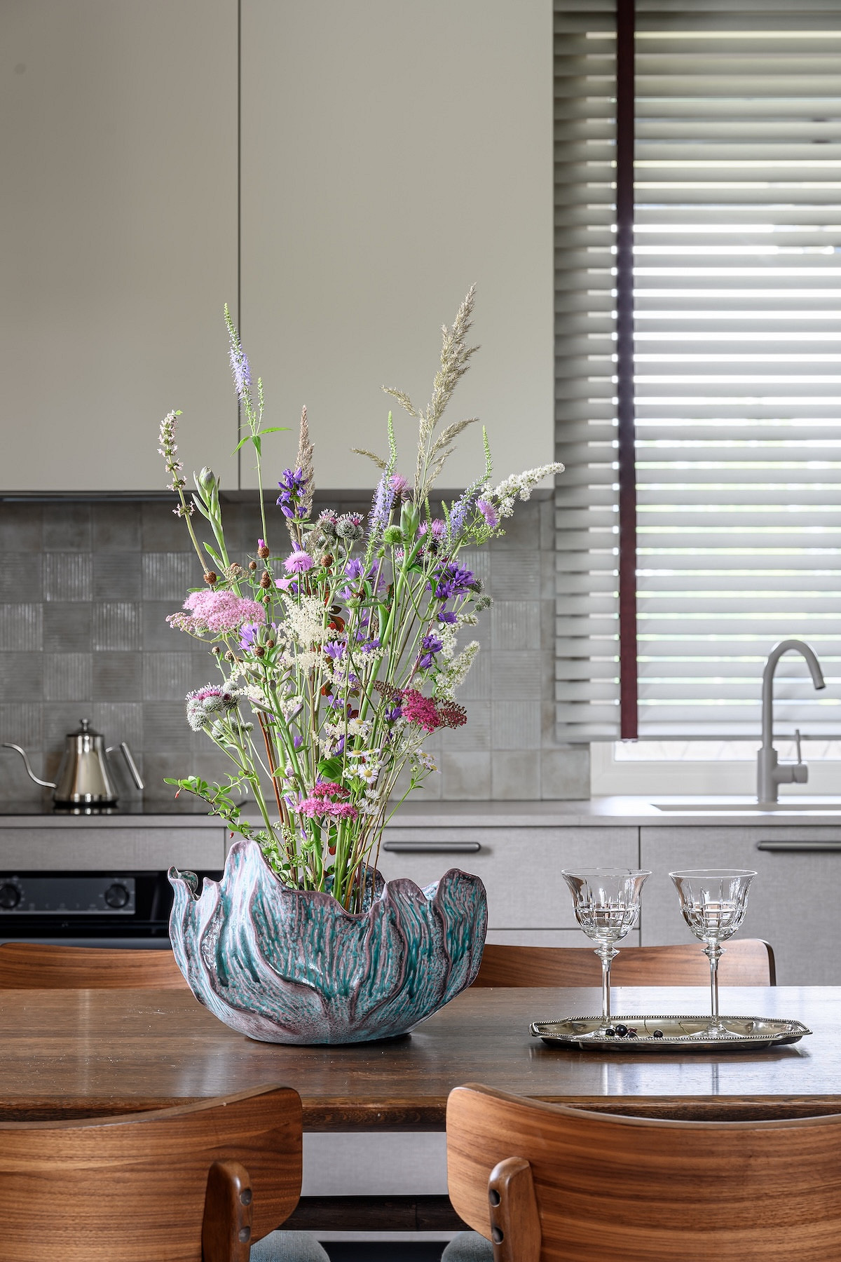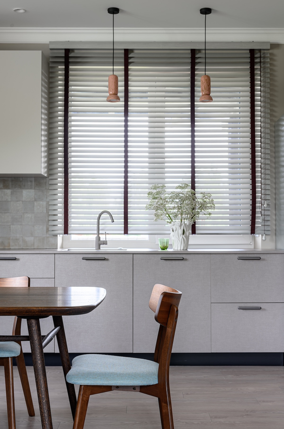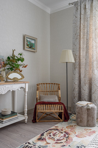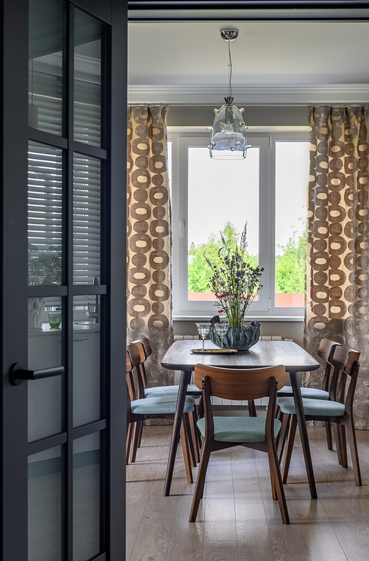 - Мебель: кухня «Стильные кухни», тумба-витрина сделана на заказ, диван «Сонум», кресло divan.ru, столовая группа DeepHouse, плетеные кресла La Redoute