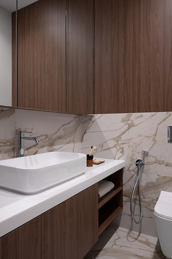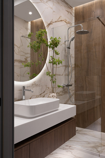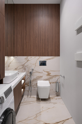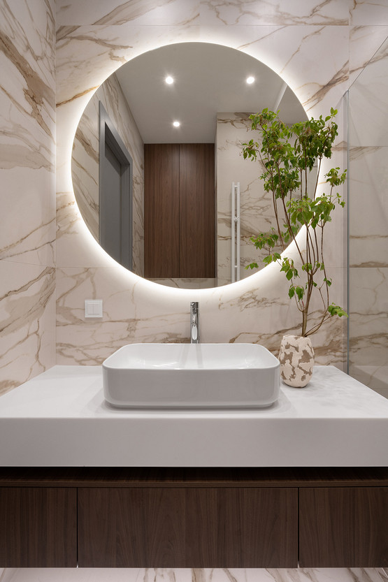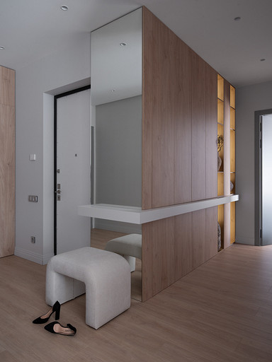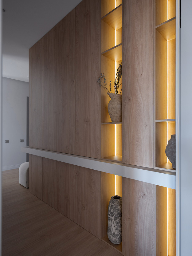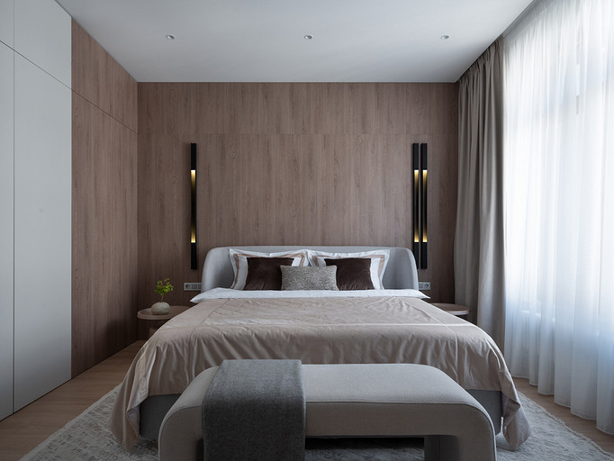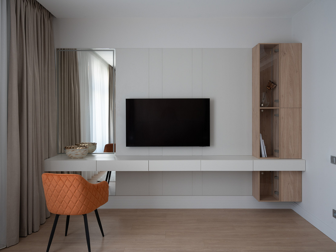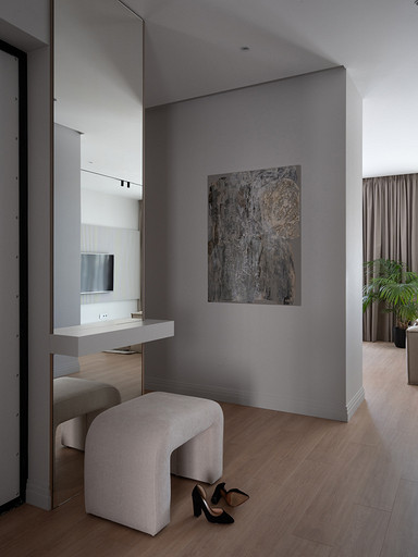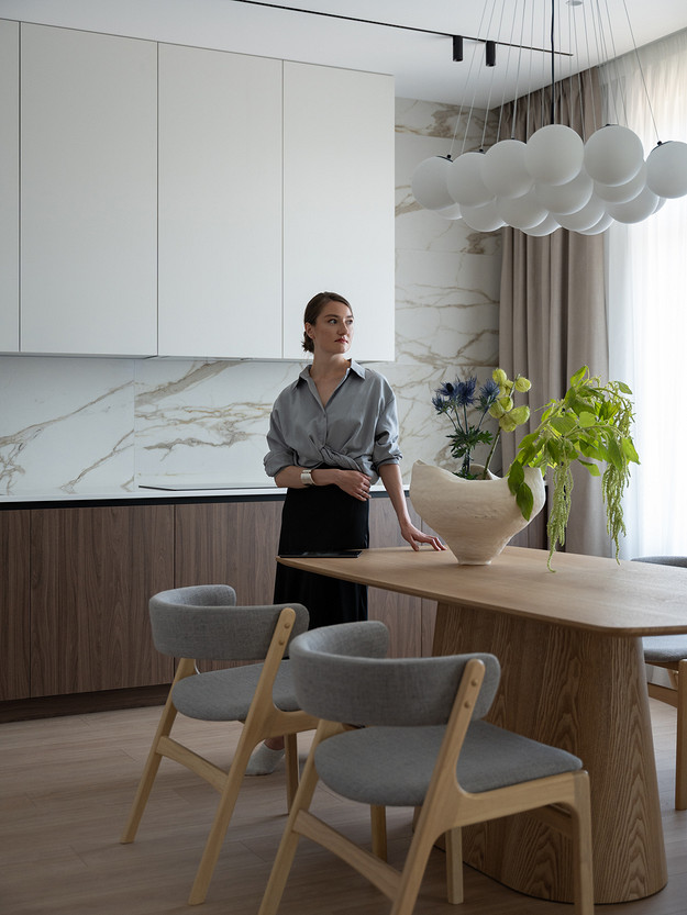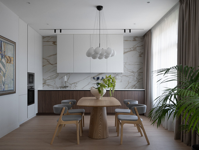 Квартира площадью 106 квадратных метров находится в жилом комплексе бизнес-класса Neva Haus на Петровском острове — в одном из самых живописных и спокойных уголков Санкт-Петербурга. Из её окон открывается вид на историческую солодовню пивомедоваренного завода «Бавария», а по набережной у дома неспешно скользят яхты. Именно этот неторопливый ритм окружающей среды стал интонацией для интерьера. Пространство проектировалось для аренды, но задача стояла не просто в том, чтобы оно было универсальным — важно было создать ощущение дома: сдержанного, продуманного, уютного, способного стать основой для жизни самых разных людей. Вмешательство в структуру пространства было минимальным. Основной задачей стало функциональное зонирование: объединили кухню, столовую и гостиную в единое общесемейное пространство, выделили приватную зону спальни, предусмотрели кабинет (или детскую — в зависимости от будущих арендаторов), два санузла — гостевой совмещённый с постирочной и мастер-санузел с душевой. В каждой зоне предусмотрены удобные системы хранения, интегрированные в архитектуру интерьера. Интерьер выполнен в спокойной, светлой палитре, где доминируют натуральные оттенки и текстуры: тёплое дерево, «мягкий» мрамор, матовая краска на стенах, уютный текстиль. Это база, сквозь которую проходит единая линия — начиная от общесемейных пространств, заканчивая приватными, личными. На этом светлом фоне особенно выразительно звучит работа Бориса Аникина из серии «Модель вселенной» — философский акцент и эмоциональный центр кухни-гостиной. Всё выдержано в балансе: строгие линии уравновешивают радиусные формы мебели — округлые спинки стульев, плавные изгибы кровати, пуфа и банкетки. Это диалог прямого и плавного, где каждая деталь работает на создание спокойной, визуально выверенной композиции — той самой «линии покоя». Интерьер получился сдержанным, но живым, наполненным воздухом, светом и тишиной. Он не требует немедленного наполнения, но готов к жизни — для тех, кто ищет не просто аренду, а ощущение дома.