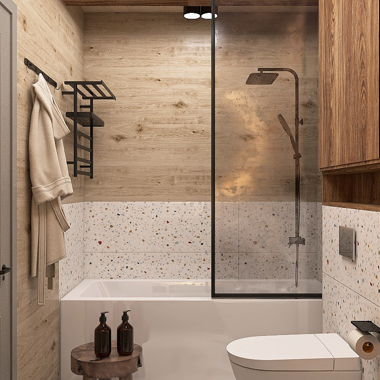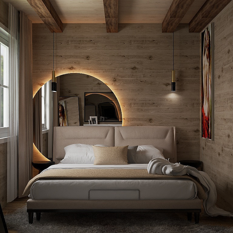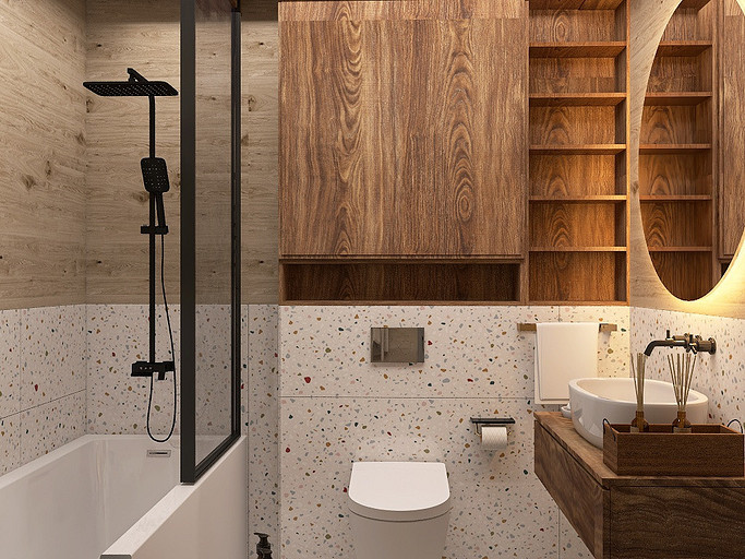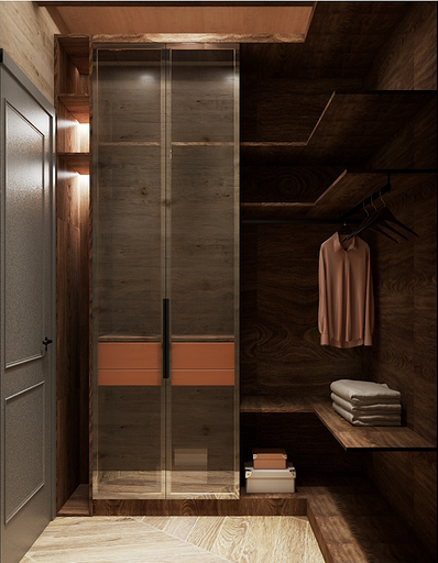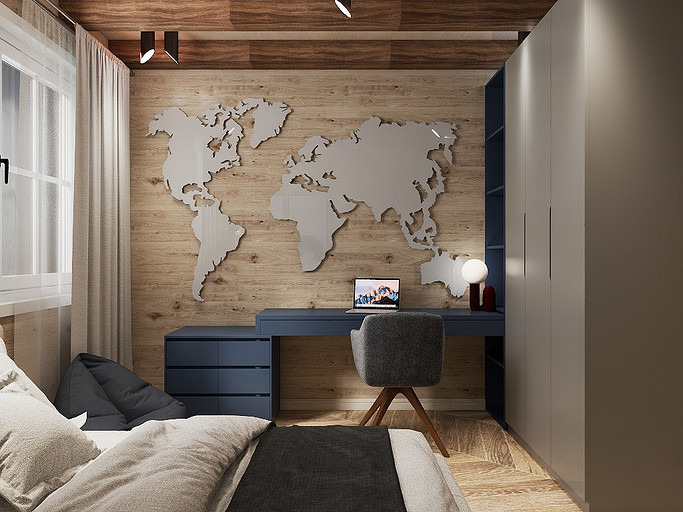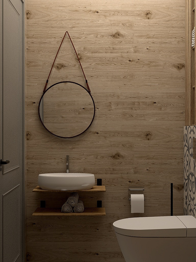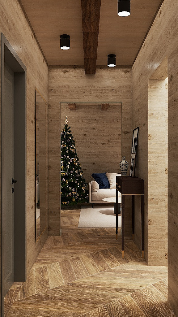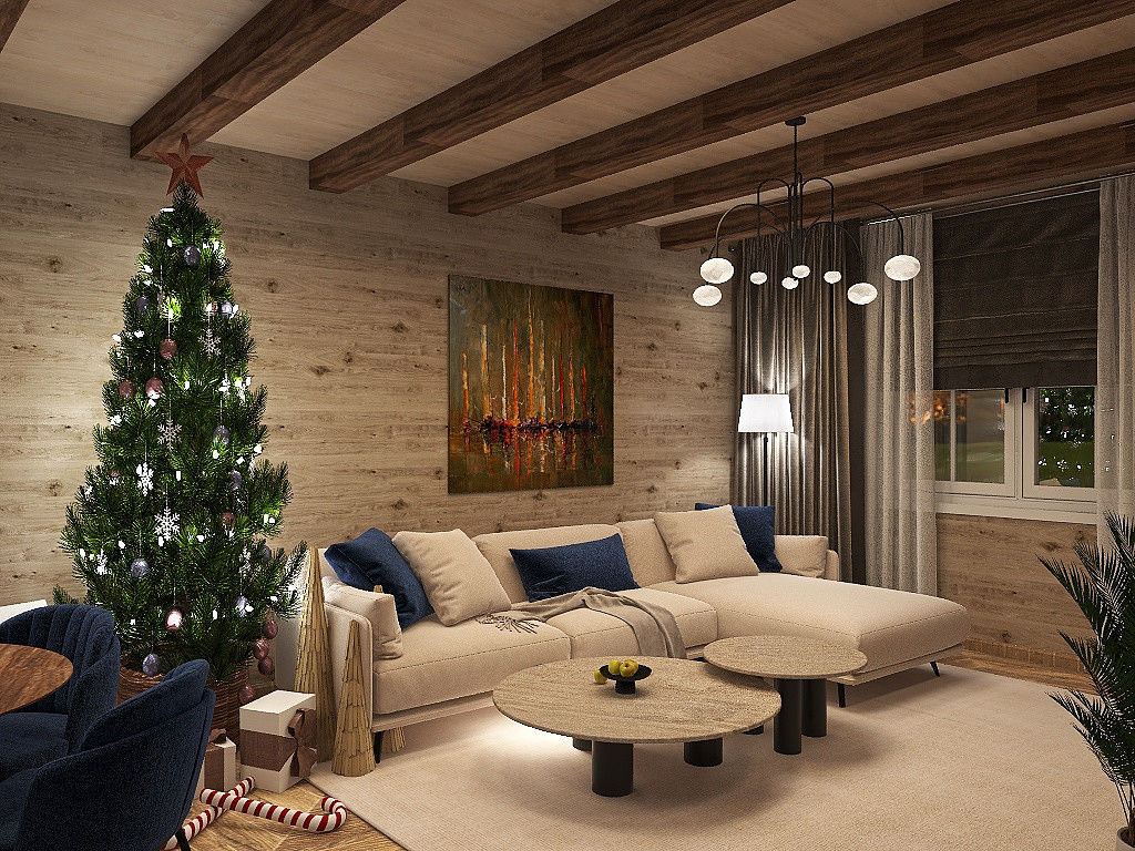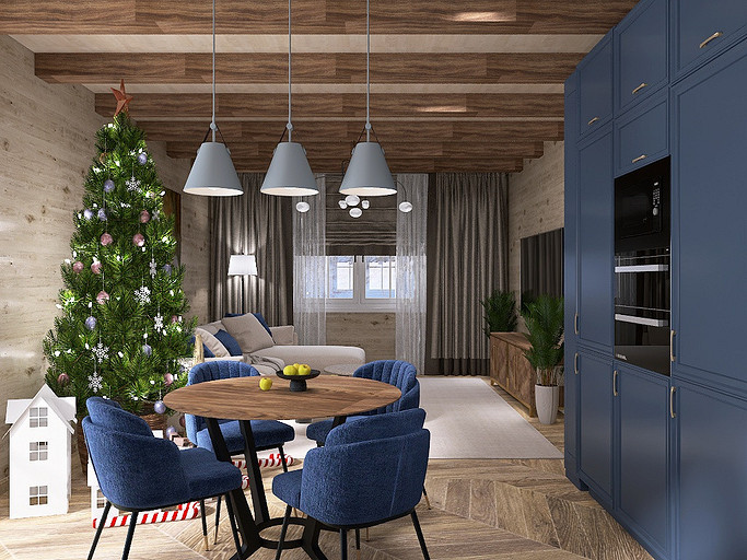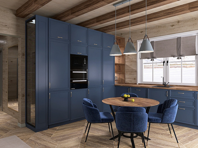 Проект «EcoMood» — дом из сруба площадью 115 кв. м, разработан для семьи, которая ценит комфорт, функциональность и натуральные материалы. Планировка объединяет кухню и гостиную, создавая удобное пространство для готовки, приема гостей и отдыха. Главный акцент — глубокий синий цвет кухни, который подчеркнут теплой текстурой древесины стен и потолочных балок. Использованы экологичные материалы: дерево, переработанная древесина. Для удобства и энергоэффективности внедрены светодиодное освещение и продуманная система хранения для сортировки отходов. «EcoMood» — функциональный, экологичный и комфортный интерьер, где продуманы цвет, свет и материалы, а дом остаётся удобным и гармоничным для повседневной жизни.