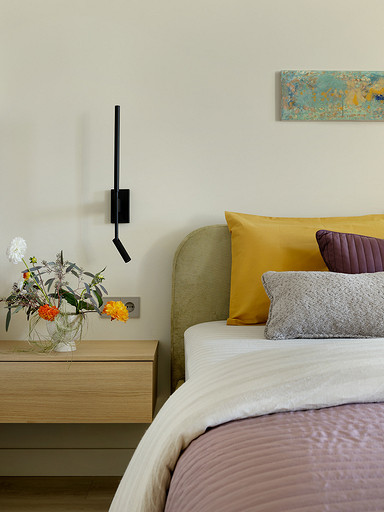 - Освещение: бра у кровати Loft It, торшеры Moderli, Evoluce, светильник над столом Kink Light, треки Elektrostandard, встроенные светильники Maytoni
