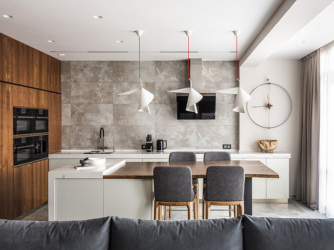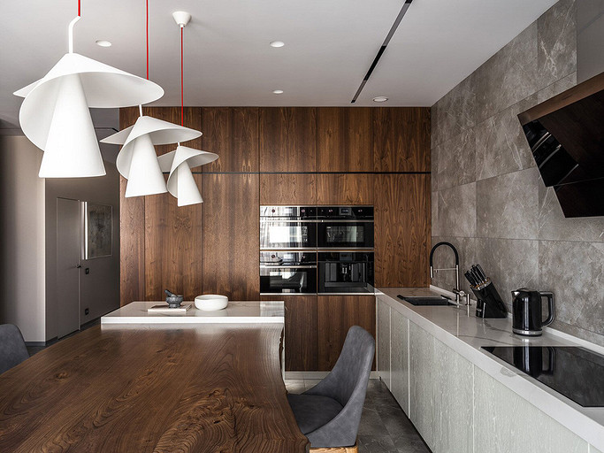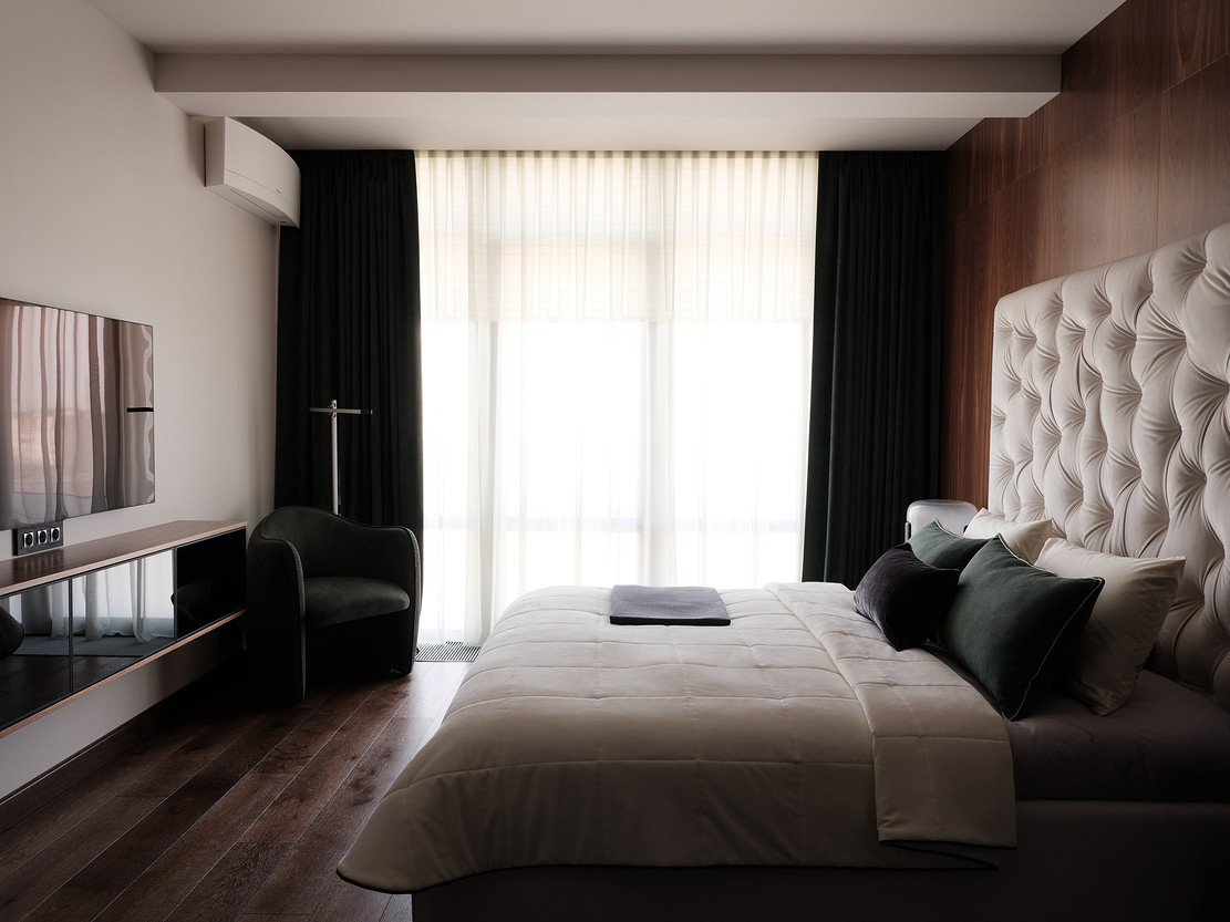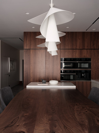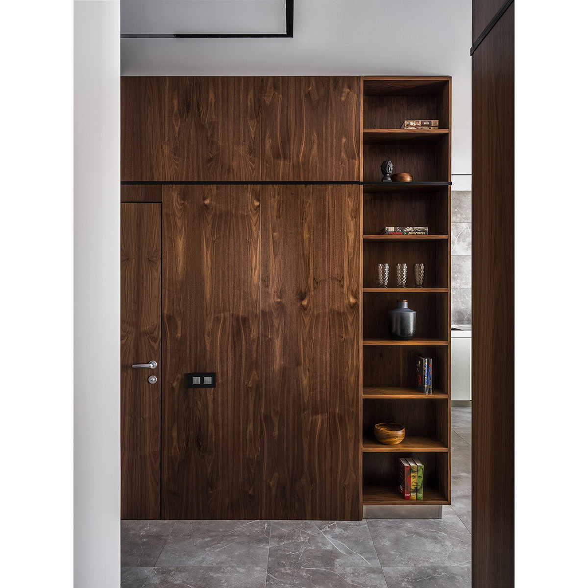 ЗАПРОС ЗАКАЗЧИКА. В ходе реализации проекта была приобретена смежная однокомнатная квартира, которую необходимо было концептуально объединить в единое пространство с большой квартирой, сохранив возможность по необходимости «отсоединить» в самостоятельную квартиру. Предусмотреть зоны хранения вещей. Концептуально выстроить все логично и лаконично. НАШИ РЕШЕНИЯ С целью сохранения независимости присоединённой квартиры мы предложили в смежной стене между квартирами сделать дверной проем и в новой зоне предусмотреть хозяйскую зону. В смежной комнате между квартирами организовали кабинет, детскую комнату перенесли на предыдущее место спальни, а в хозяйской зоне предусмотрели спальню, дополнительную кухню, санузел с душевой. Таким образом, квартира стала общей площадью 160 м2, но при необходимости перекрыв дверной проем между ними, заказчики получили две равновеликих квартир рядом. Сложность этого объекта заключалась еще и в том, что не смотря на большую площадь квартиры, разместить полноценные гардеробные не представлялось возможным, так как по центру квартиры проходила несущая стена. Поэтому было принято решение при разработке планировочного решения все зоны хранения «интегрировать» в стены и «спрятать» их за стеновыми панелями. Концепция интерьера сложилась вокруг главных принципов: лаконичность, предельная функциональность, натуральные материалы. Используемые материалы: стены и потолок краска; пол инженерная доска, керамогранит; дерево, металл, стекло, керамика, натуральные ткани- лен.