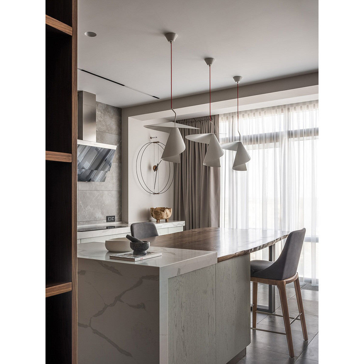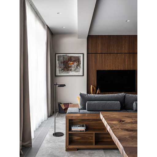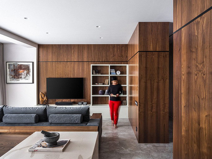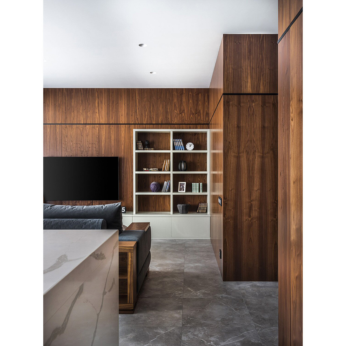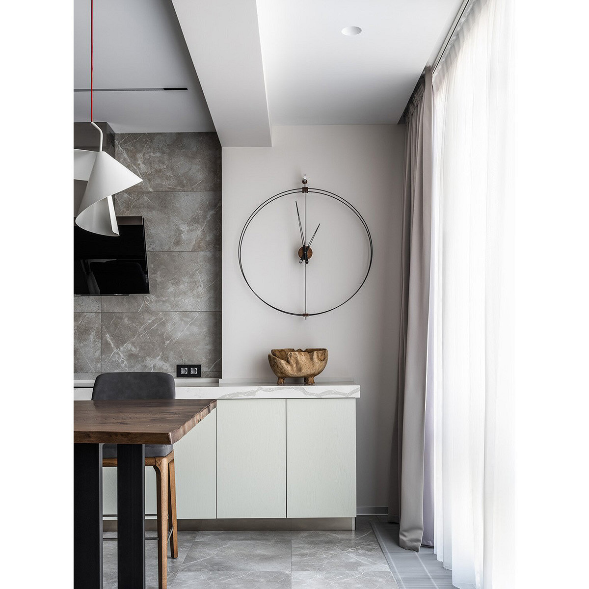 ЗАПРОС ЗАКАЗЧИКА. В ходе реализации проекта была приобретена смежная однокомнатная квартира, которую необходимо было концептуально объединить в единое пространство с большой квартирой, сохранив возможность по необходимости «отсоединить» в самостоятельную квартиру. Предусмотреть зоны хранения вещей. Концептуально выстроить все логично и лаконично. НАШИ РЕШЕНИЯ С целью сохранения независимости присоединённой квартиры мы предложили в смежной стене между квартирами сделать дверной проем и в новой зоне предусмотреть хозяйскую зону. В смежной комнате между квартирами организовали кабинет, детскую комнату перенесли на предыдущее место спальни, а в хозяйской зоне предусмотрели спальню, дополнительную кухню, санузел с душевой. Таким образом, квартира стала общей площадью 160 м2, но при необходимости перекрыв дверной проем между ними, заказчики получили две равновеликих квартир рядом. Сложность этого объекта заключалась еще и в том, что не смотря на большую площадь квартиры, разместить полноценные гардеробные не представлялось возможным, так как по центру квартиры проходила несущая стена. Поэтому было принято решение при разработке планировочного решения все зоны хранения «интегрировать» в стены и «спрятать» их за стеновыми панелями. Концепция интерьера сложилась вокруг главных принципов: лаконичность, предельная функциональность, натуральные материалы. Используемые материалы: стены и потолок краска; пол инженерная доска, керамогранит; дерево, металл, стекло, керамика, натуральные ткани- лен.