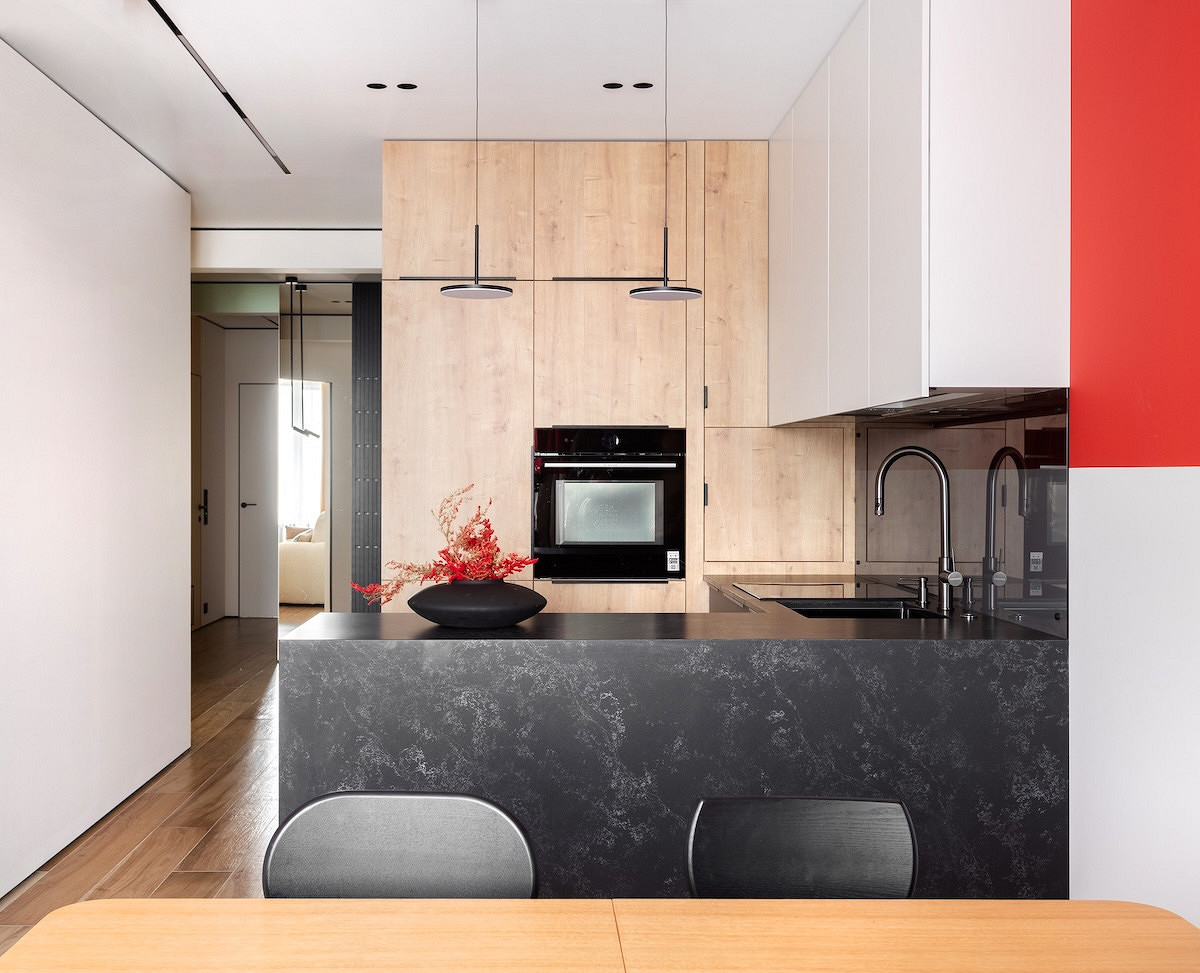- Освещение: треки ST Luce, точечный свет и бра в гостиной Maytoni, точечные светильники в ванной и постирочной Denkis, светильник над обеденным столом Imperium Loft, светильник в прихожей iLedex, подвесы над полуостровом «Центрсвет»