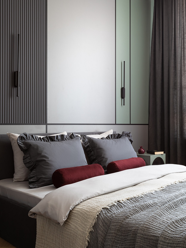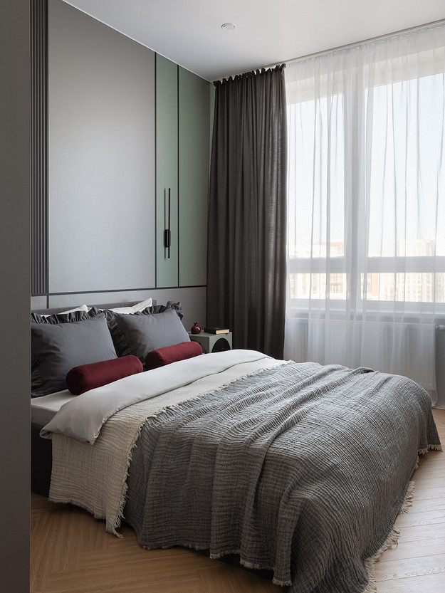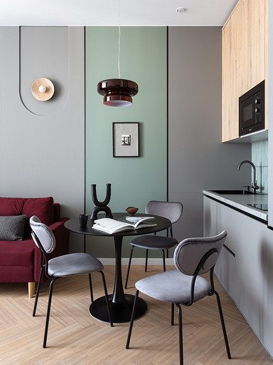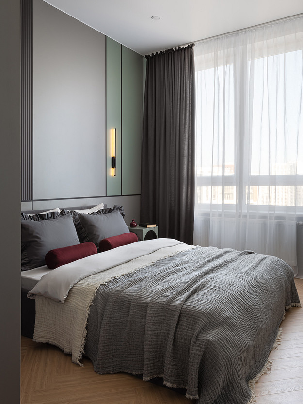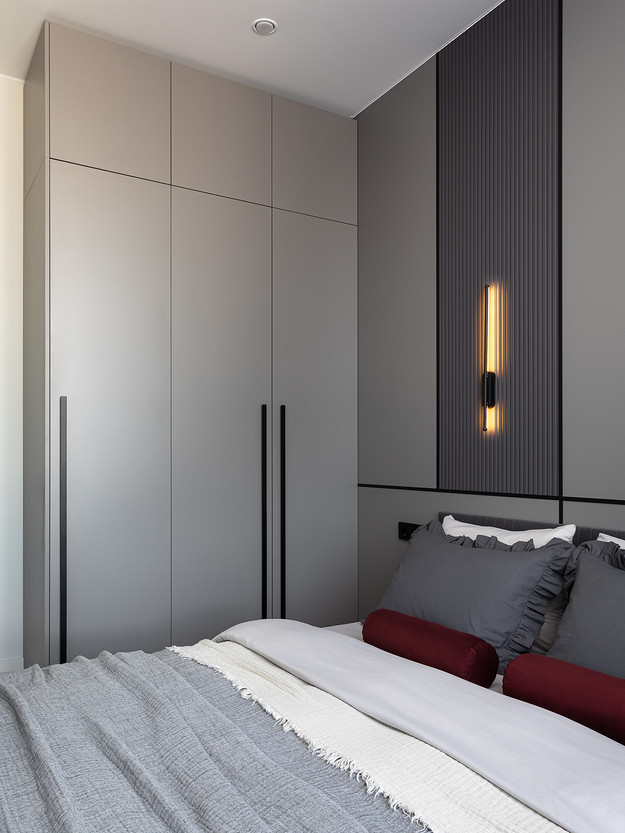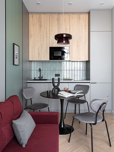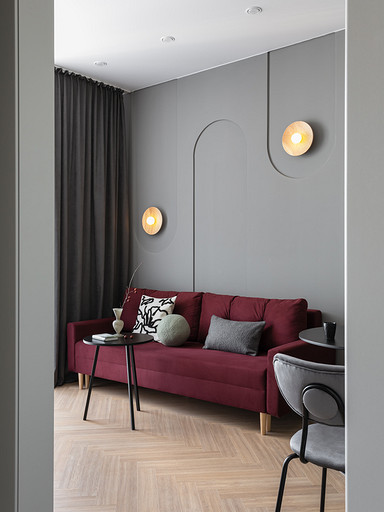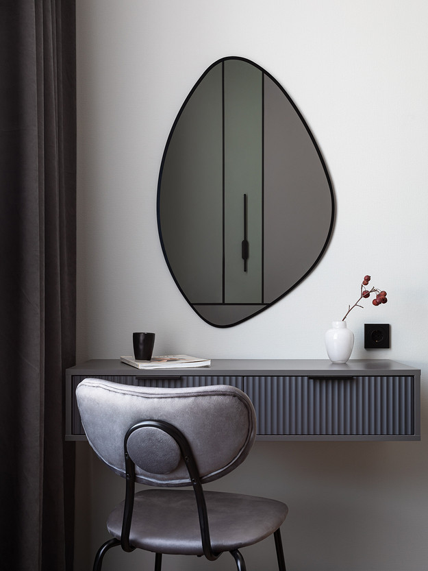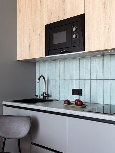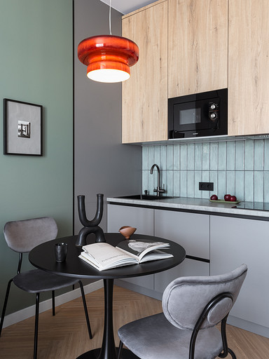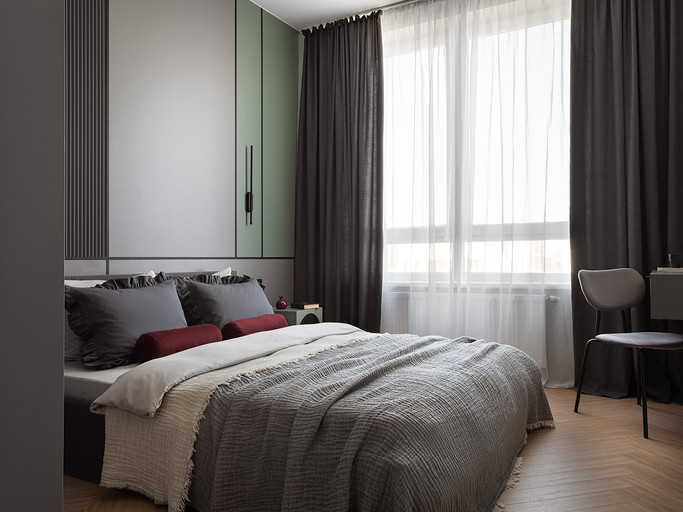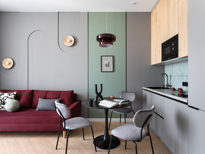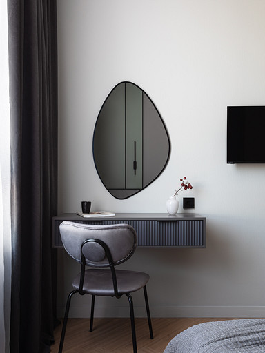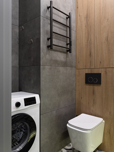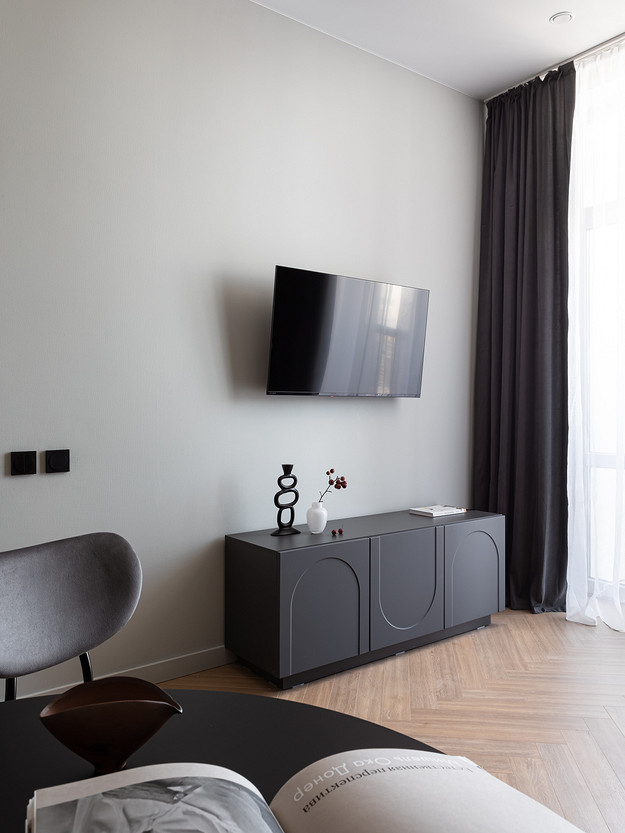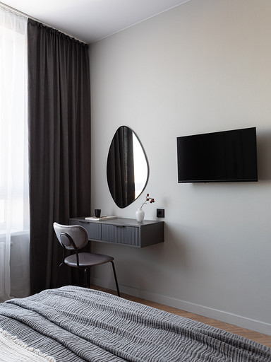 Проект для посуточной аренды с перспективой «для жизни». Когда интерьер делается не только под аренду, а под будущих хозяев, подход становится совсем другим. Здесь было важно не просто сделать красиво, а создать пространство, в котором будет комфортно жить. Пожелания заказчицы: «не как у всех» , максимум стен закрыть ЛДСП-панелями, предусмотреть место для сушки белья. Мы продумывали каждый сантиметр, каждую фактуру, каждый оттенок. Проект был непростым, но результат получился именно таким, каким и должен быть: стильным, функциональным и очень уютным. 3-метровые потолки, 25-й этаж и потрясающий вид из окна добавили проекту особого характера и вау-эффекта.