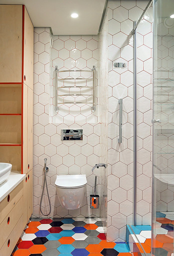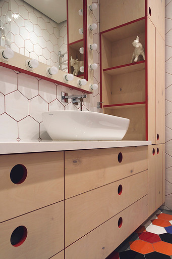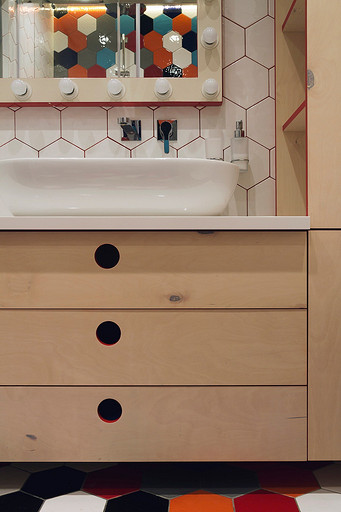 Шестиугольный формат плитки выбран как способствующий позитивному восприятию небольшого пространства. Гримёрное зеркало с лампочками по периметру обеспечивает оптимально реалистичное отражение, без теней. Читать далее...