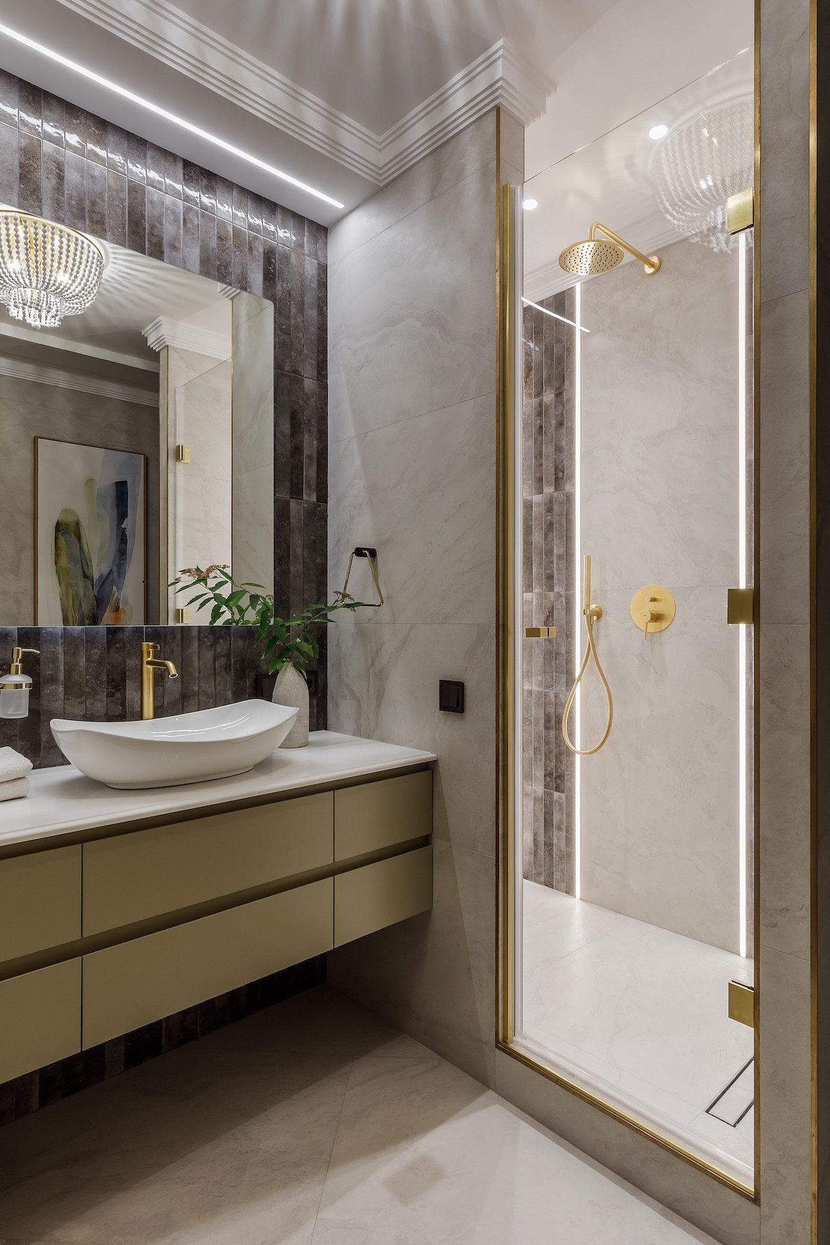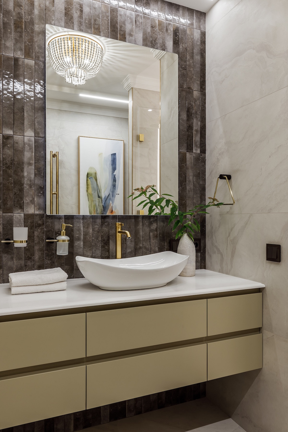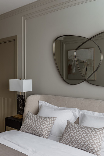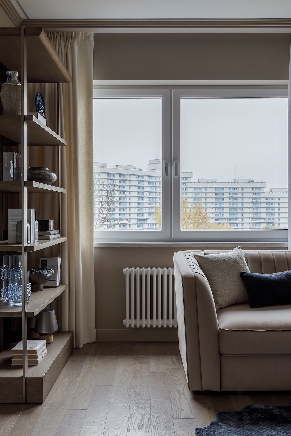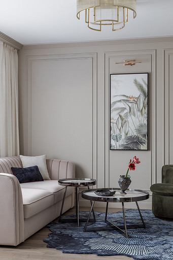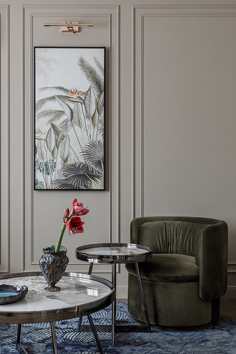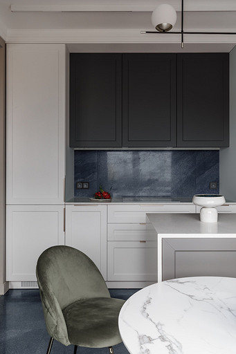 - Мебель: кухня «ЗОВ», обеденный стол и стулья, ТВ-тумба, стеллаж, кресло, журнальные столики и пуф в прихожей Гарда Декор, диван в гостиной, кресло и пуф на лоджии Миланский Дом, консоль в прихожей Loft Concept, столик на лоджии Cosmorelax