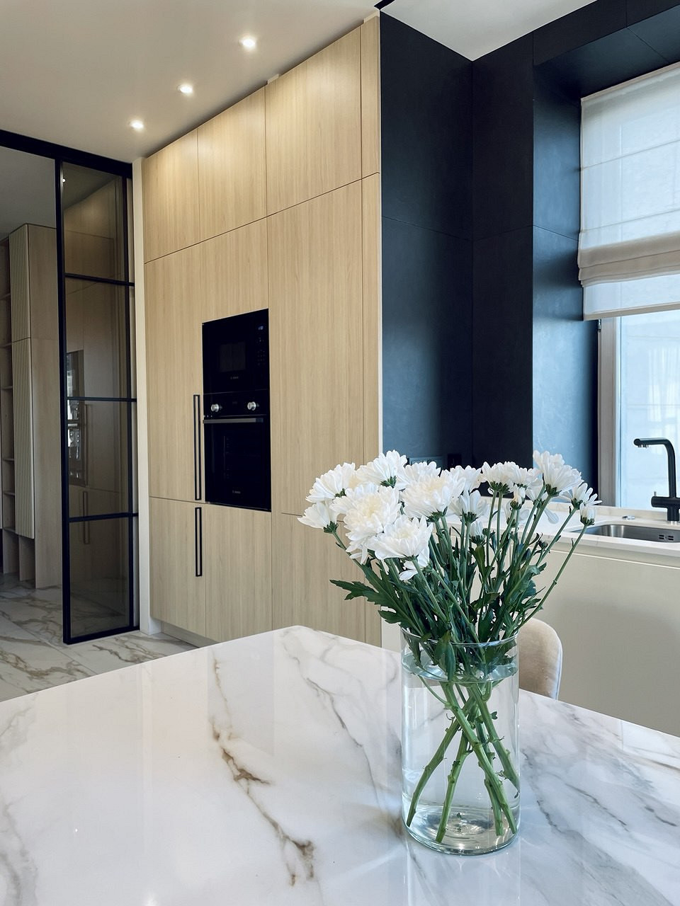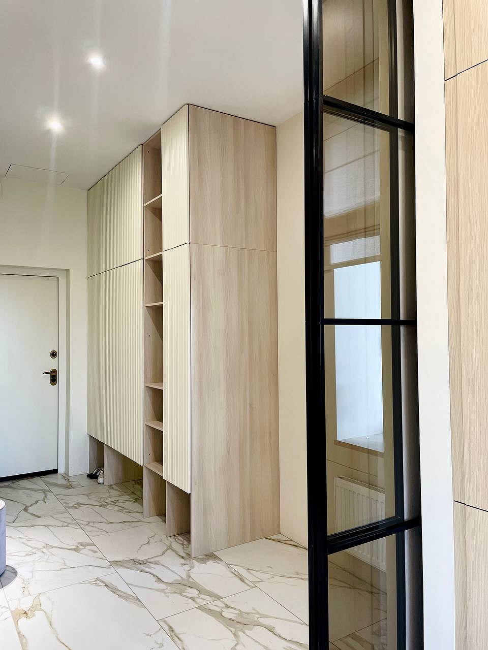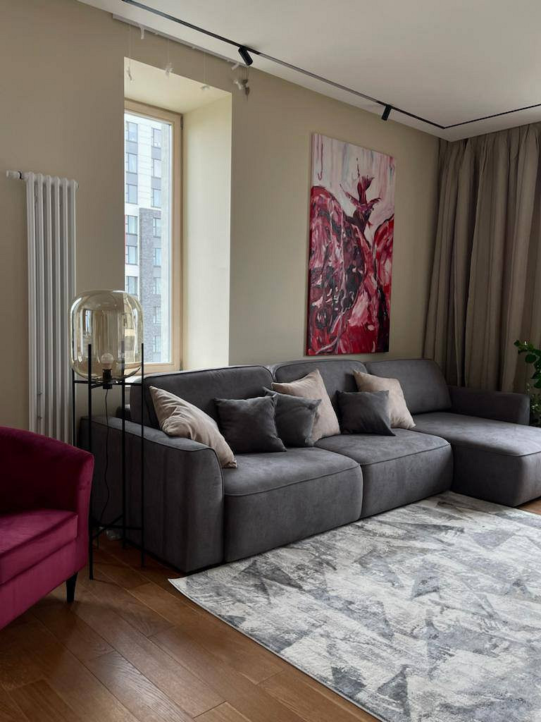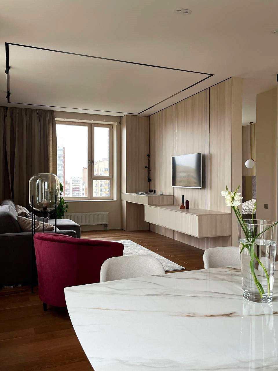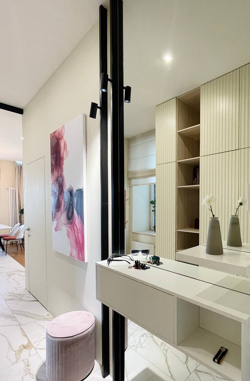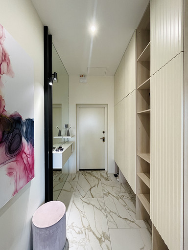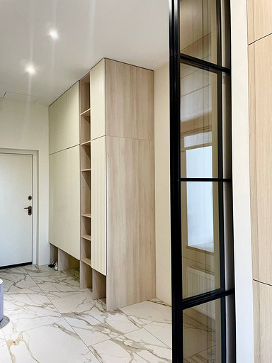 Отличительной чертой этого пространства было обилие окон — 7 окон на 64 кв.м. Для того чтобы создать уютное пространство, необходимо было грамотно продумать общую концепцию и эргономичную планировку. Квартира выполнена в обволакивающем белом цвете, который разбавлен деревянными элементами в отделке и мебели, в контрасте с черными элементами и акцентным винным цветом. Вся корпусная мебель в квартире выполнена на заказ по моим эскизам и чертежам, специально разработанным для этого проекта. Приятным бонусом прихожей стало окно, наличие естественного освещения в таких помещениях редкость для квартир. При входе внимание привлекает большое зеркало, которое является элементом отделки и хорошо расширяет пространство. Две вертикальные полосы слева — это трековые светильники, которые гармонично соединяют два материала и подчеркивают высоту потолков. Напротив расположился вместительный шкаф с фрезерованными фасадами, где большая часть отдана под хранение обуви и одежды в прихожей, а другая, напротив санузла, задействована под хозяйственный блок. В изножье шкафа предусмотрено открытое хранение с частично теплым полом, где можно разместить обувь и спрятать робот-пылесос. Входная группа и кухня-гостиная разделены стеклянной перегородкой в потолок, и таким образом в прихожую еще больше попадает естественного света. Для отделки пола в зоне прихожей и кухни использовался один широкоформатный керамогранит, и при открытой перегородке пространство смотрится единым. Рабочая зона кухни выделена темным керамогранитом и дополнена трековым освещением, что связало композицию в единую форму куба. Деревянные откосы и подоконники хорошо подчеркивают окна и гармонируют с левой частью кухни, где размещен холодильник и система хранения. Основное освещение в кухне-гостиной выполнено трековыми системами. Столовая группа разделяет кухню и зону гостиной визуально, а функционально позволяют хозяйке общаться с гостями во время готовки или просто смотреть телевизор. В процессе реализации заказчики отказались от острова, т.к. решили сдавать квартиру в аренду. Спальня компактная по размерам и в то же время вмещает в себя все необходимое, — удобная кровать с изголовьем во всю стену, прикроватные тумбы с хранением и двухметровый гардеробный шкаф с рифлеными стеклами. В этом помещении были добавлены латунные элементы, которые придают помещению элегантности. В шкафу была реализована подсветка, которая в сочетании с полупрозрачными фасадами добавляет простора и визуально растворяет его в помещении. Дверь реализована в потолок, при открытии которой пространство плавно перетекает в гостиную и за счет этого кажется больше, чем есть на самом деле. Многослойность изголовья добавляет глубины пространству и придает интерьеру законченный вид. Мягкое изголовье кровати выполнено во всю стену, чтобы расширить помещение. За изголовьем панели из шпона, которым добавлен ритм с помощью латунных профилей. Мокрая зона, предназначенная застройщиком для санузла, площадью 4,6 кв.м оказалась очень вытянутая, к тому же планировка оказалась ограничена техническими нюансами. Но несмотря на все это мне удалось реализовать все запросы заказчиков и при этом эргономично их разместить в помещении. В таких помещениях важно сохранять пространство, а так как взгляд чело