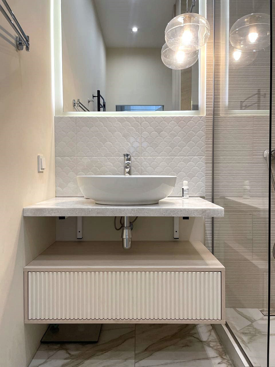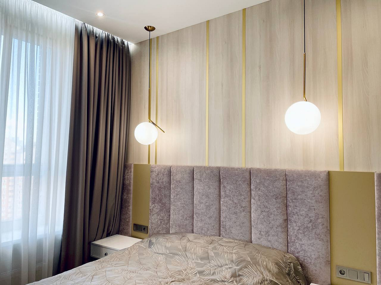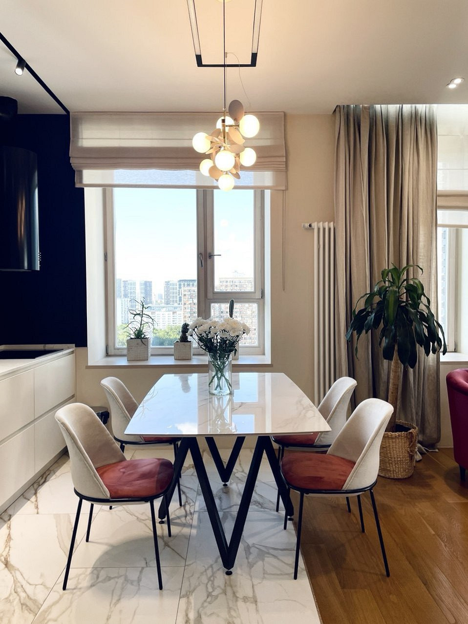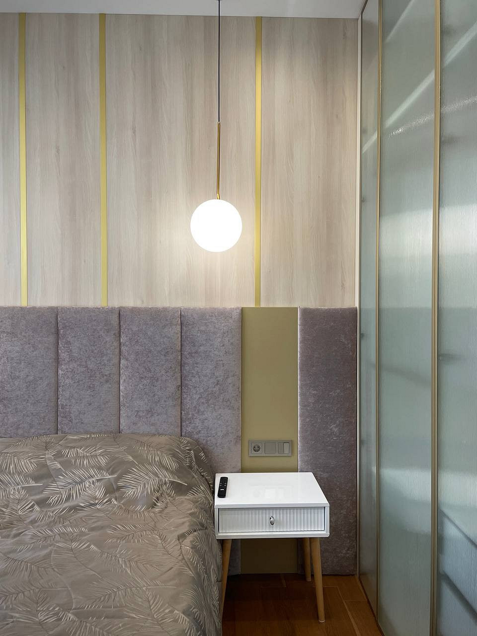 Отличительной чертой этого пространства было обилие окон — 7 окон на 64 кв.м. Для того чтобы создать уютное пространство, необходимо было грамотно продумать общую концепцию и эргономичную планировку. Квартира выполнена в обволакивающем белом цвете, который разбавлен деревянными элементами в отделке и мебели, в контрасте с черными элементами и акцентным винным цветом. Вся корпусная мебель в квартире выполнена на заказ по моим эскизам и чертежам, специально разработанным для этого проекта. Приятным бонусом прихожей стало окно, наличие естественного освещения в таких помещениях редкость для квартир. При входе внимание привлекает большое зеркало, которое является элементом отделки и хорошо расширяет пространство. Две вертикальные полосы слева — это трековые светильники, которые гармонично соединяют два материала и подчеркивают высоту потолков. Напротив расположился вместительный шкаф с фрезерованными фасадами, где большая часть отдана под хранение обуви и одежды в прихожей, а другая, напротив санузла, задействована под хозяйственный блок. В изножье шкафа предусмотрено открытое хранение с частично теплым полом, где можно разместить обувь и спрятать робот-пылесос. Входная группа и кухня-гостиная разделены стеклянной перегородкой в потолок, и таким образом в прихожую еще больше попадает естественного света. Для отделки пола в зоне прихожей и кухни использовался один широкоформатный керамогранит, и при открытой перегородке пространство смотрится единым. Рабочая зона кухни выделена темным керамогранитом и дополнена трековым освещением, что связало композицию в единую форму куба. Деревянные откосы и подоконники хорошо подчеркивают окна и гармонируют с левой частью кухни, где размещен холодильник и система хранения. Основное освещение в кухне-гостиной выполнено трековыми системами. Столовая группа разделяет кухню и зону гостиной визуально, а функционально позволяют хозяйке общаться с гостями во время готовки или просто смотреть телевизор. В процессе реализации заказчики отказались от острова, т.к. решили сдавать квартиру в аренду. Спальня компактная по размерам и в то же время вмещает в себя все необходимое, — удобная кровать с изголовьем во всю стену, прикроватные тумбы с хранением и двухметровый гардеробный шкаф с рифлеными стеклами. В этом помещении были добавлены латунные элементы, которые придают помещению элегантности. В шкафу была реализована подсветка, которая в сочетании с полупрозрачными фасадами добавляет простора и визуально растворяет его в помещении. Дверь реализована в потолок, при открытии которой пространство плавно перетекает в гостиную и за счет этого кажется больше, чем есть на самом деле. Многослойность изголовья добавляет глубины пространству и придает интерьеру законченный вид. Мягкое изголовье кровати выполнено во всю стену, чтобы расширить помещение. За изголовьем панели из шпона, которым добавлен ритм с помощью латунных профилей. Мокрая зона, предназначенная застройщиком для санузла, площадью 4,6 кв.м оказалась очень вытянутая, к тому же планировка оказалась ограничена техническими нюансами. Но несмотря на все это мне удалось реализовать все запросы заказчиков и при этом эргономично их разместить в помещении. В таких помещениях важно сохранять пространство, а так как взгляд чело