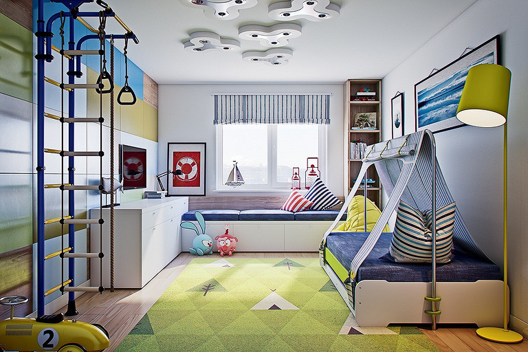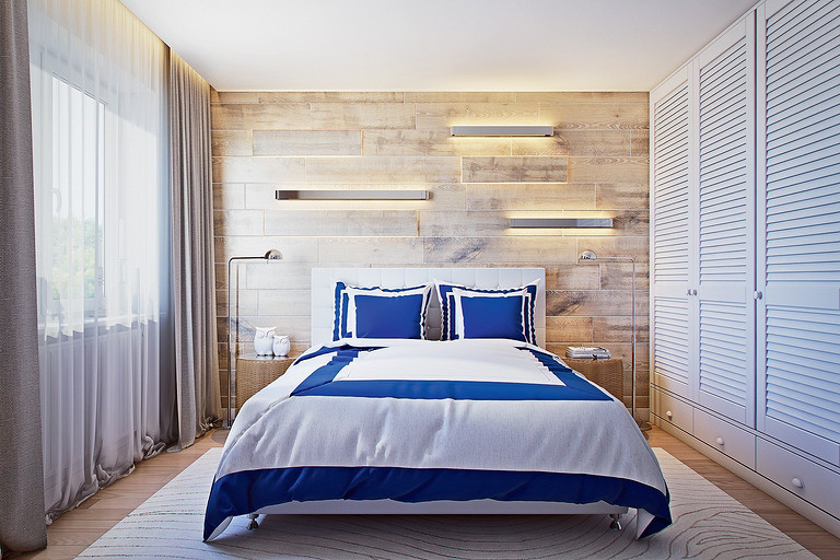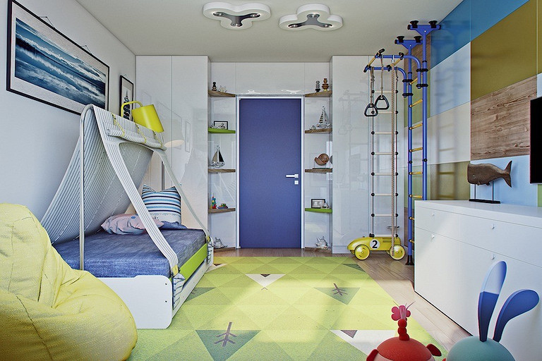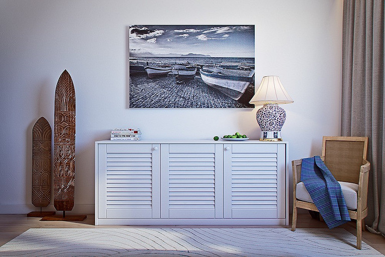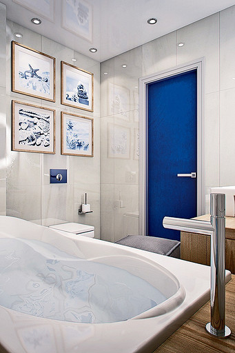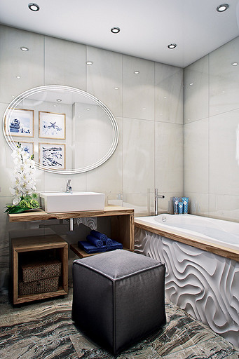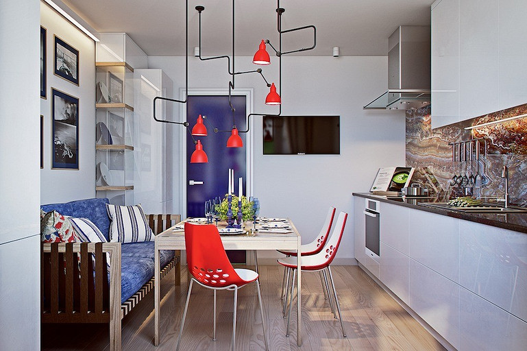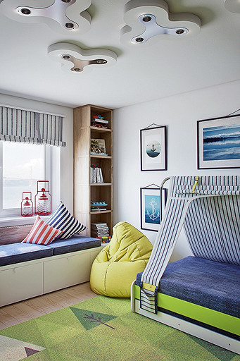 Современный интерьер выполнен по мотивам летнего отдыха на берегу моря, для чего использованы морские цвета — от пенно-белого до разнообразных оттенков синего и голубого, а также акценты ярко-красного и золотистого. Читать далее...