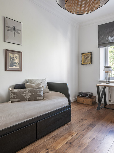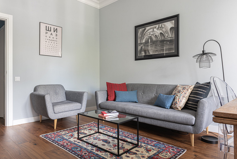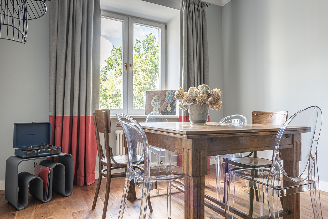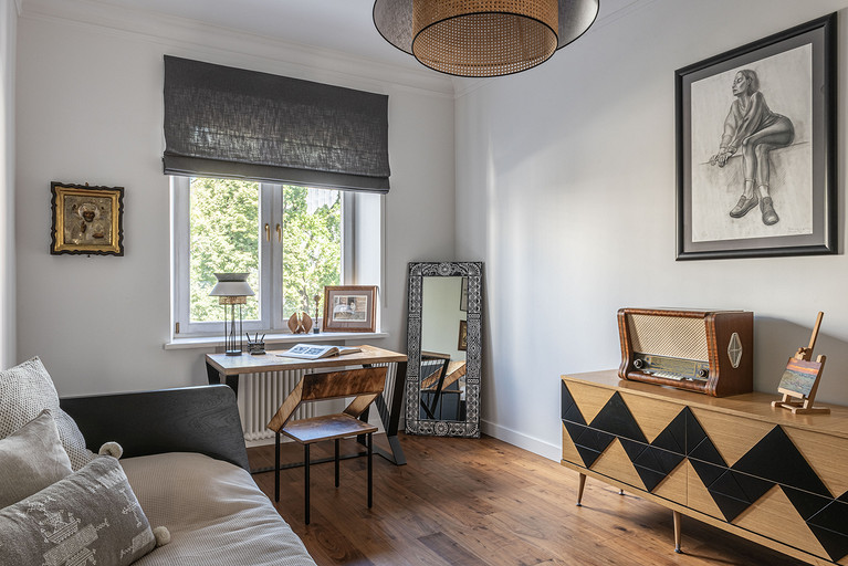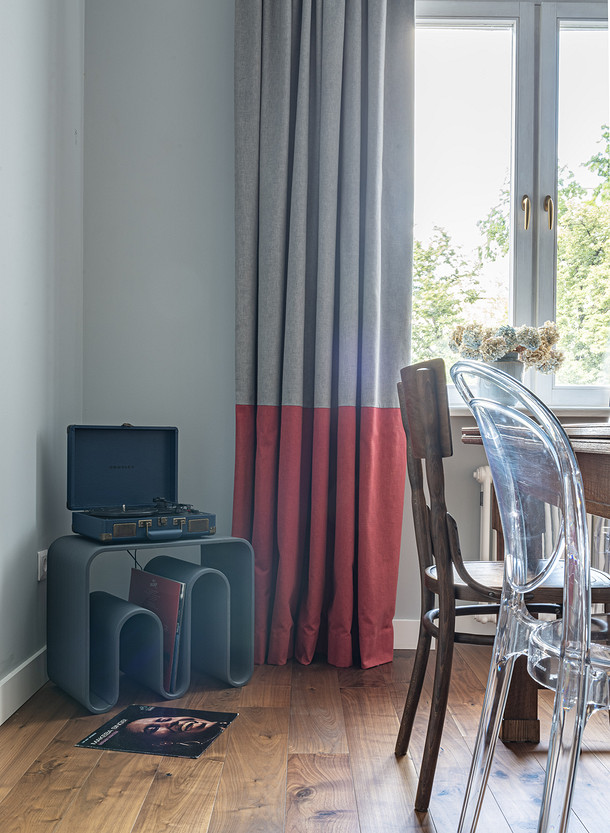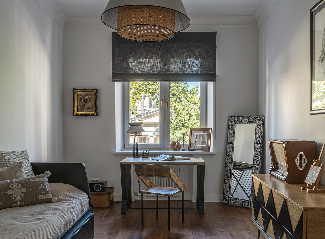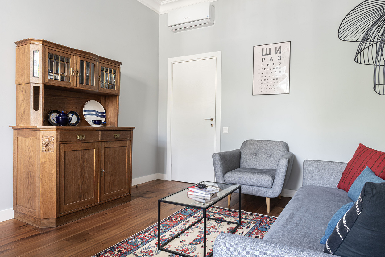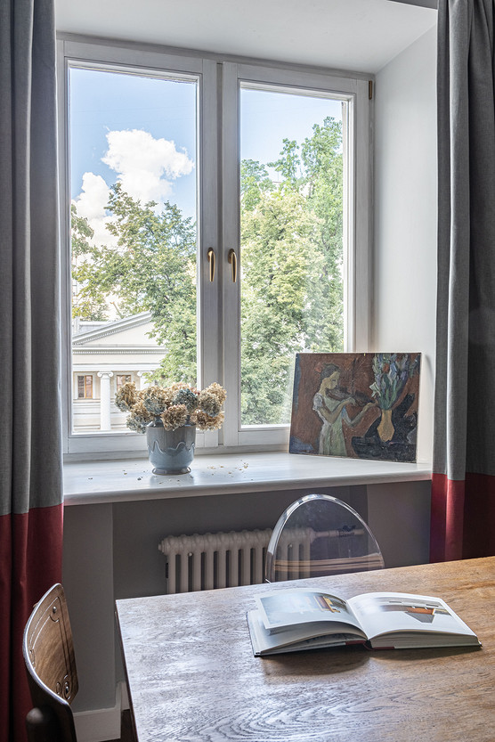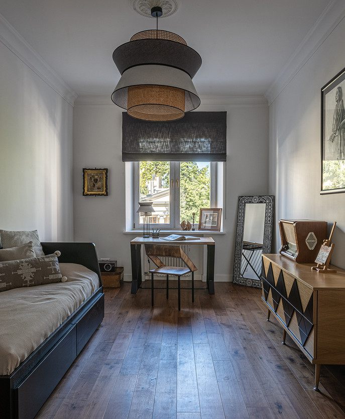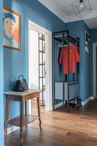 От предыдущих хозяев в квартире осталось множество вещей с историей: антикварная мебель, коллекция книг по искусствоведению, ретро радиоприёмники. Заказчице хотелось сохранить «дух» сталинки, ощущение, как будто бы в доме живёт уже несколько поколений, освежив при этом интерьер современными деталями и яркими акцентами.