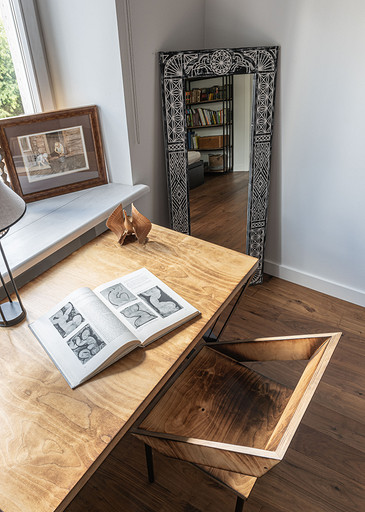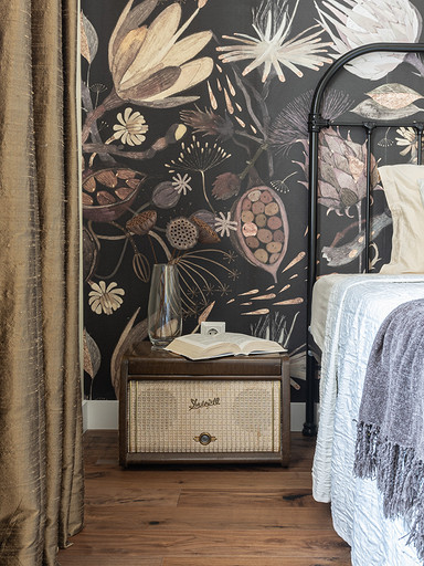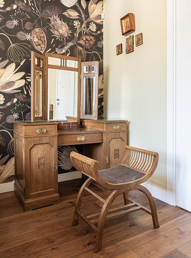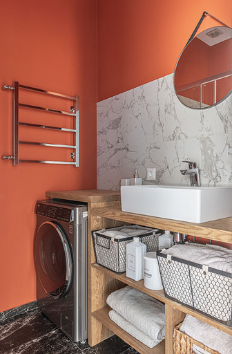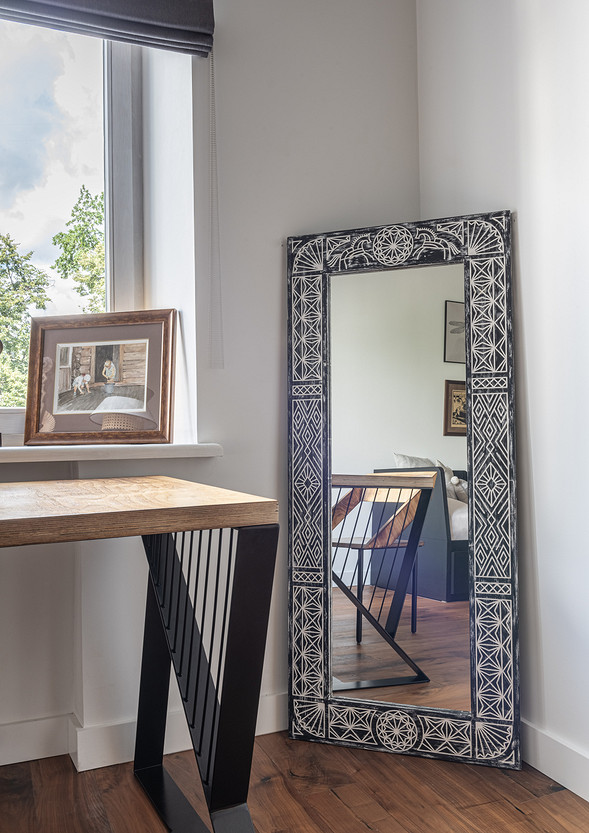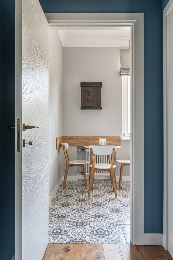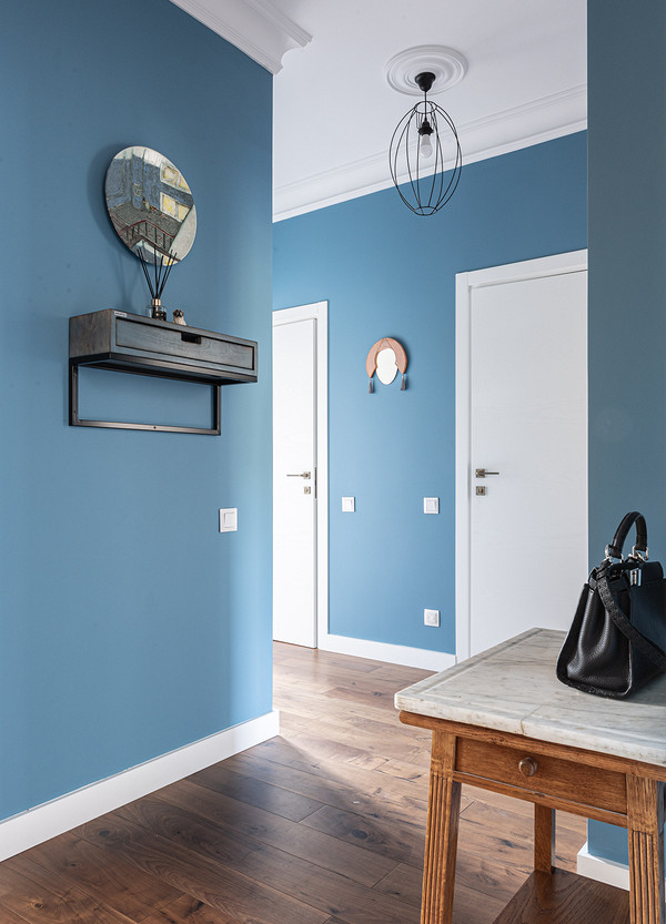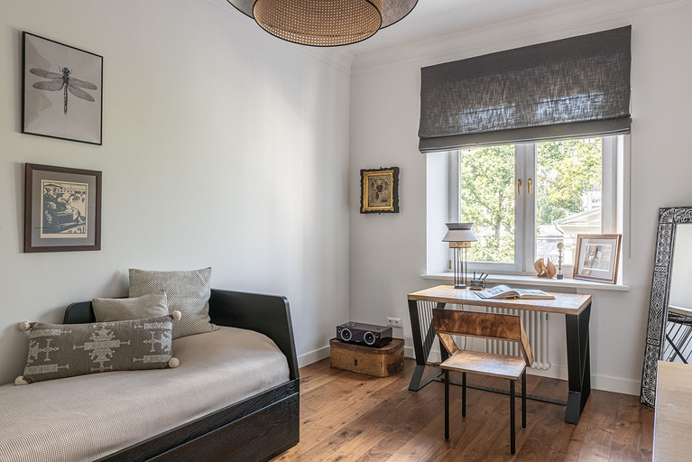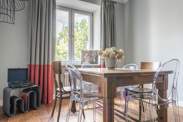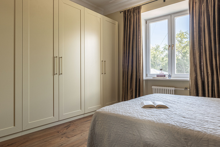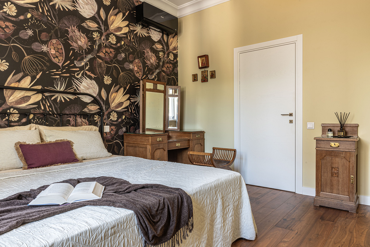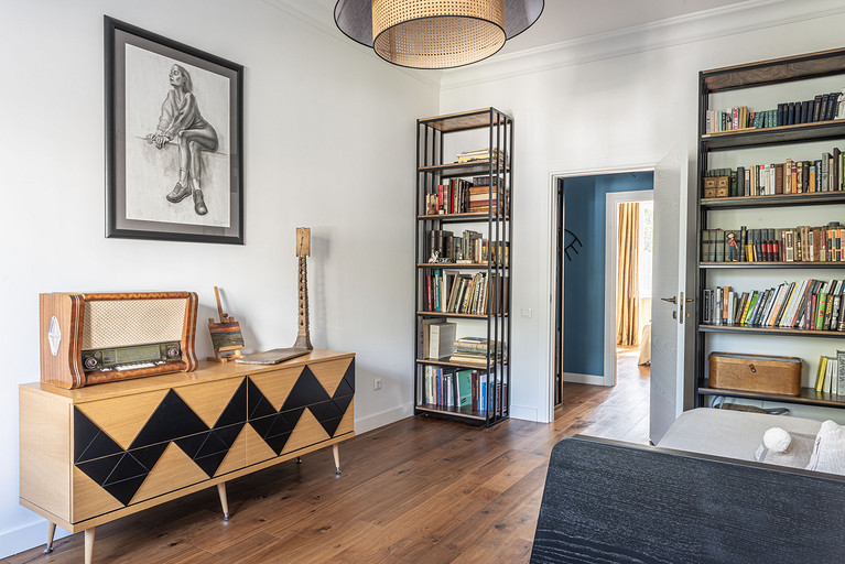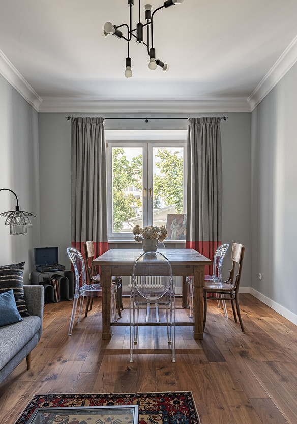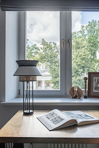 От предыдущих хозяев в квартире осталось множество вещей с историей: антикварная мебель, коллекция книг по искусствоведению, ретро радиоприёмники. Заказчице хотелось сохранить «дух» сталинки, ощущение, как будто бы в доме живёт уже несколько поколений, освежив при этом интерьер современными деталями и яркими акцентами.