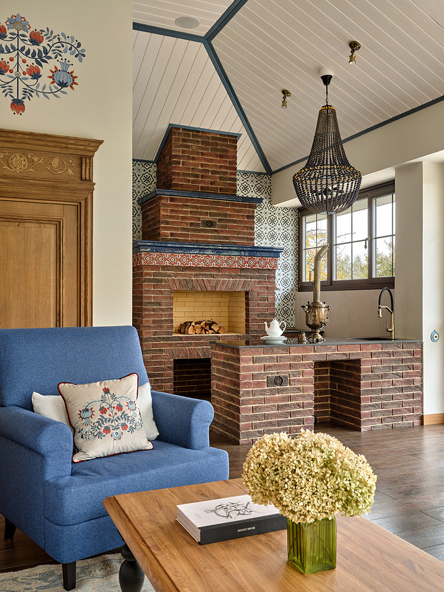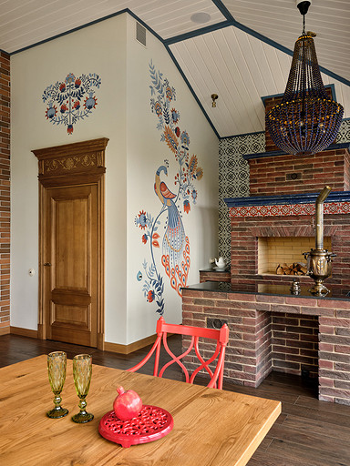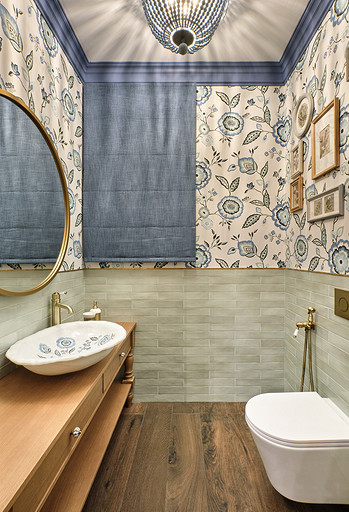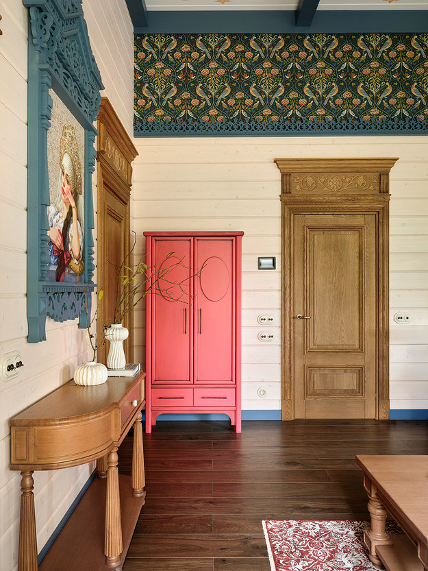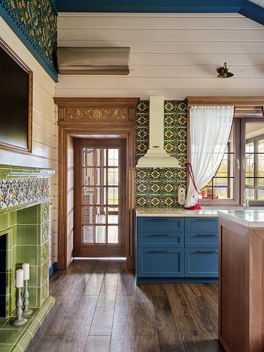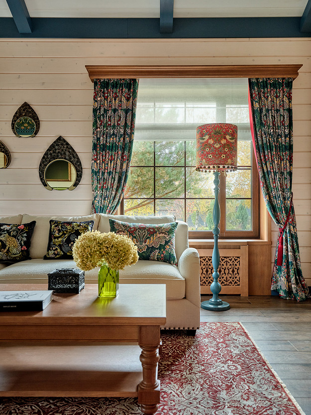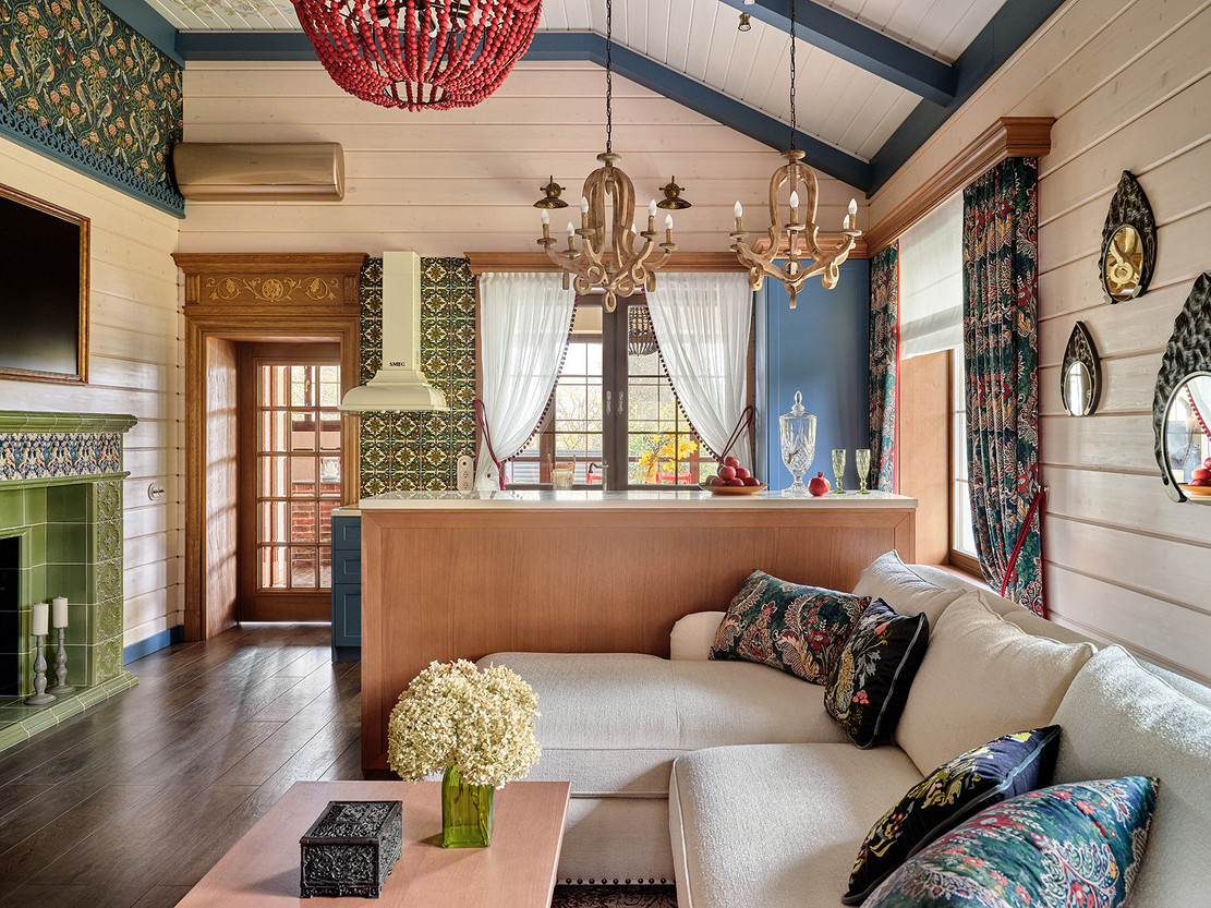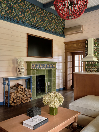 - Стены: имитация бруса, краска «Биофа», обои «Моррис и Ко», «Йорк», изразцы Ceramica Decor, ручная мозаика «Ардо Студио», плитка «Эквип»