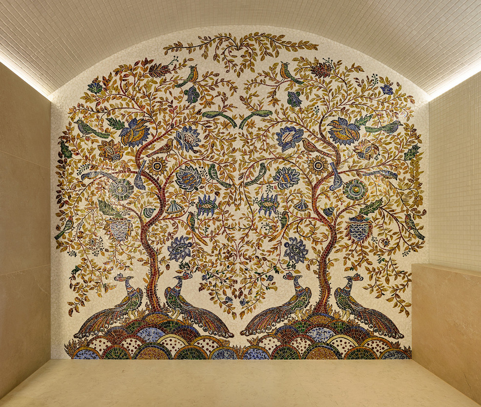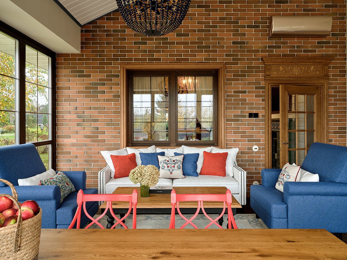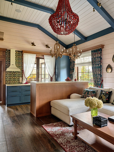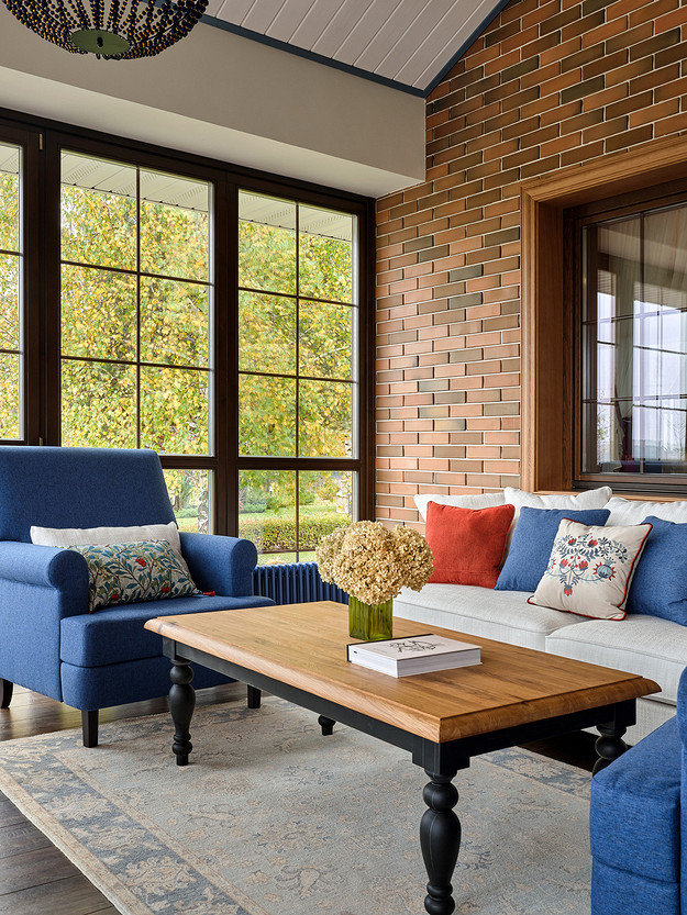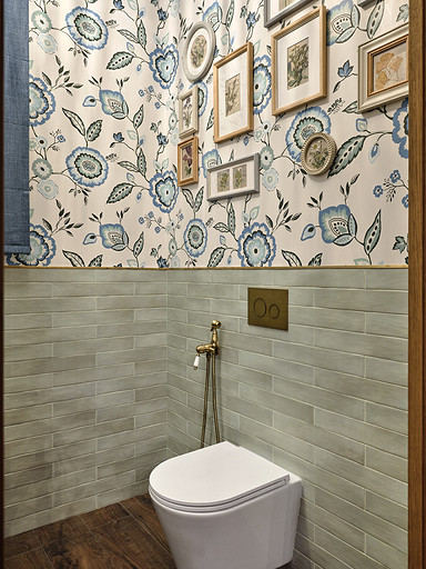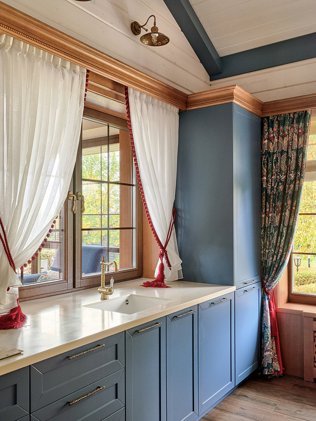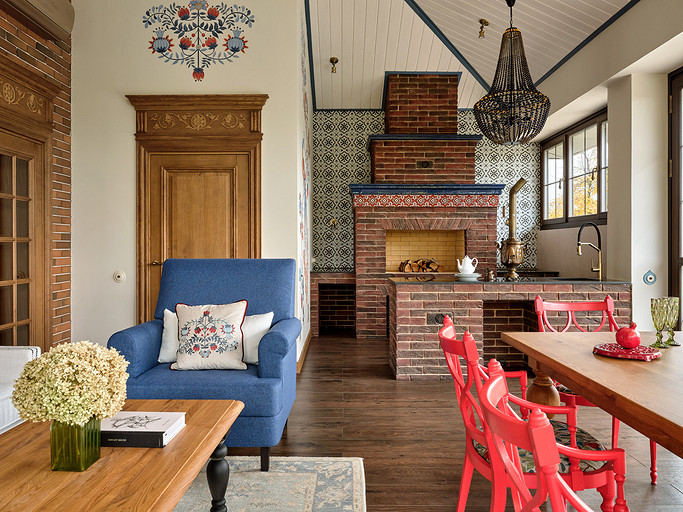 - Стены: имитация бруса, краска «Биофа», обои «Моррис и Ко», «Йорк», изразцы Ceramica Decor, ручная мозаика «Ардо Студио», плитка «Эквип»