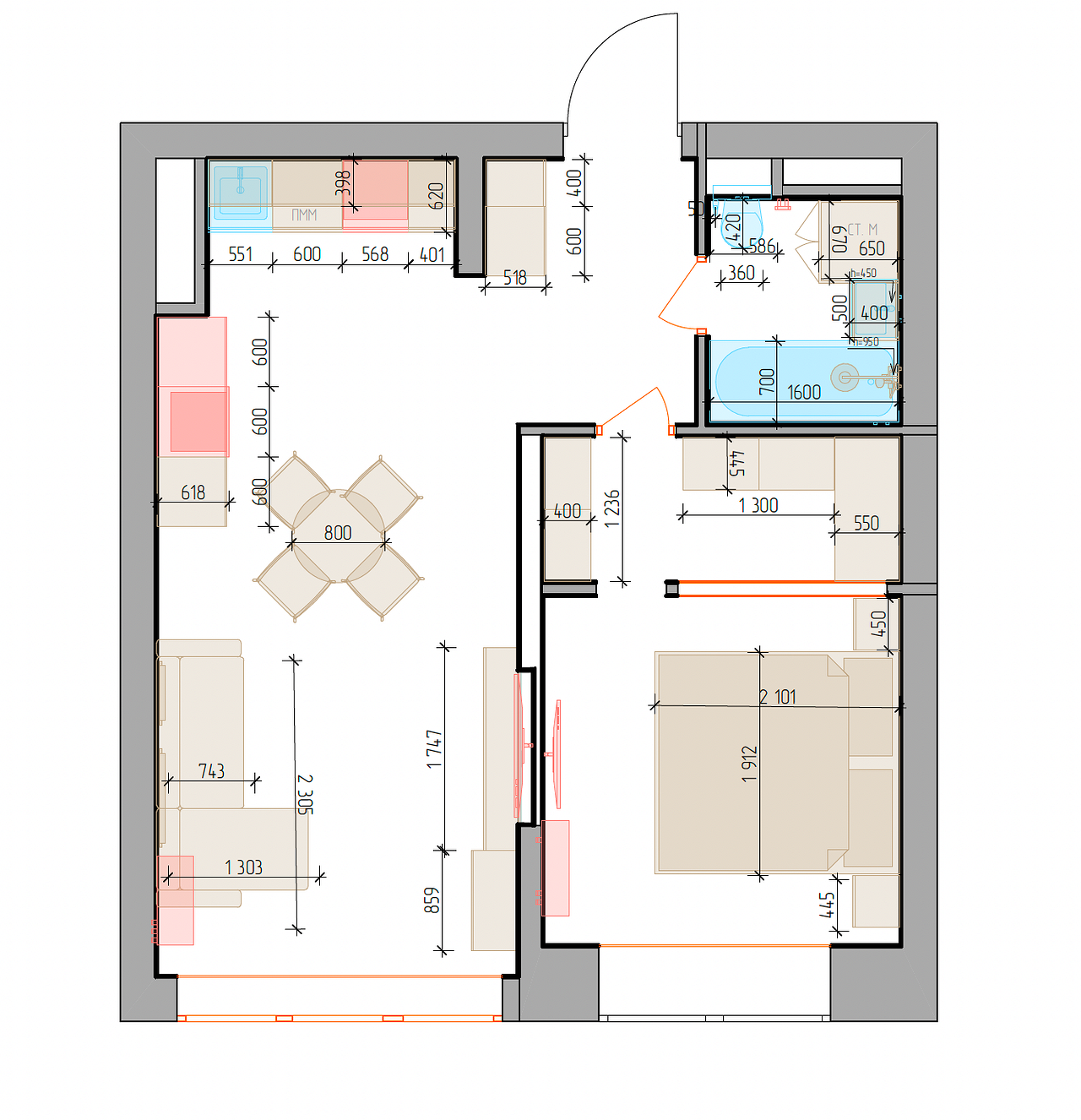 Реализованный проект однокомнатной квартиры площадью 40,4 м2