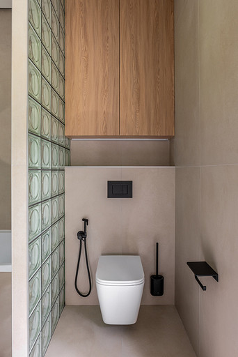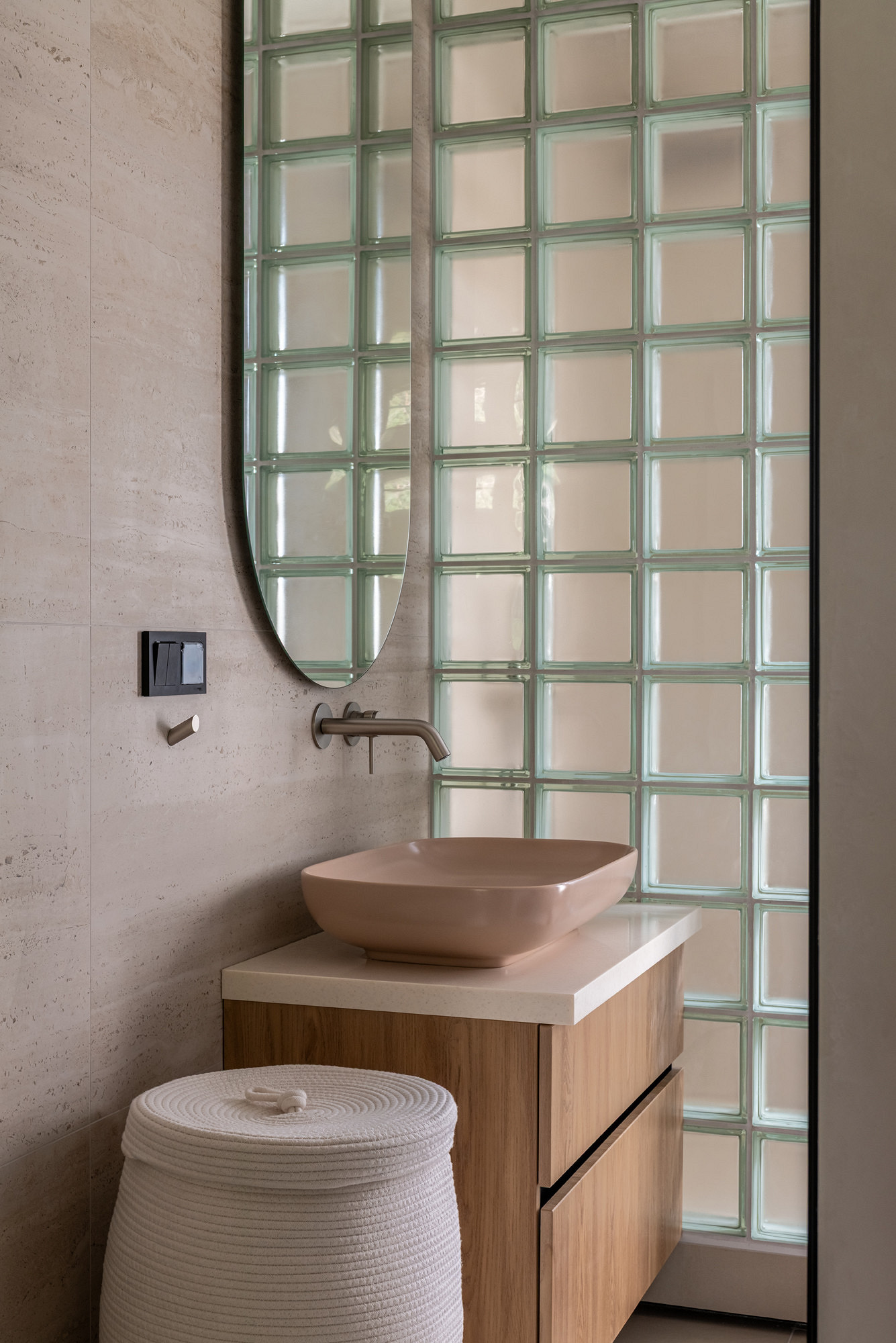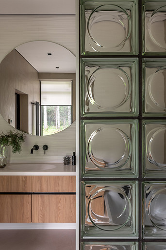 - Стены: декоративная штукатурка Italica, плитка Atlas Concorde, стеклоблоки Vitrablok