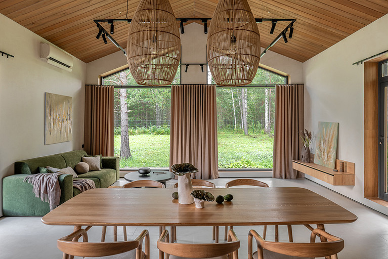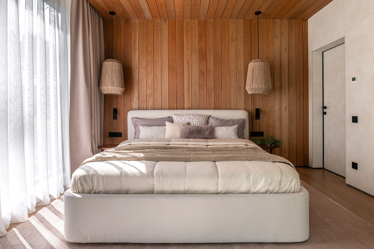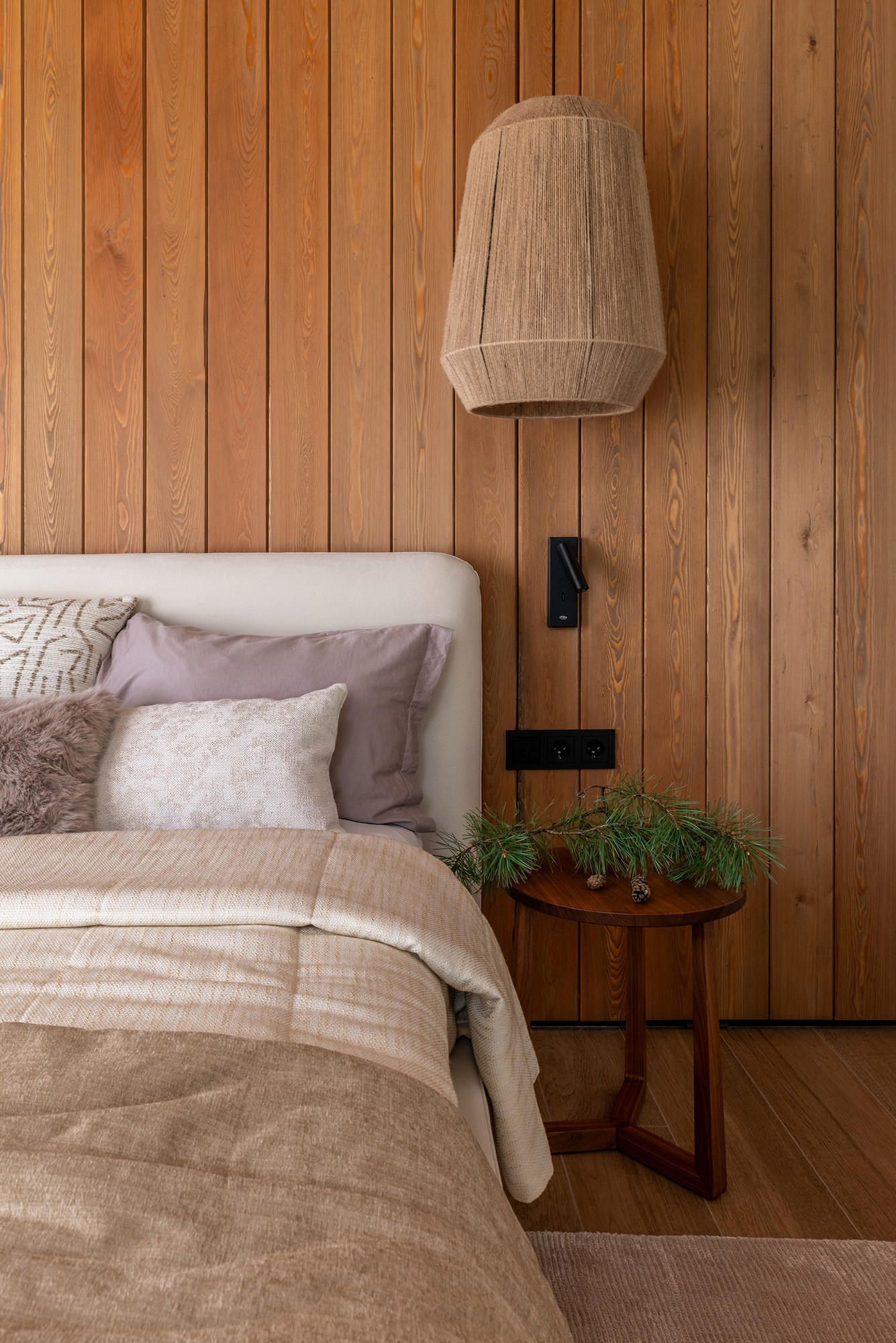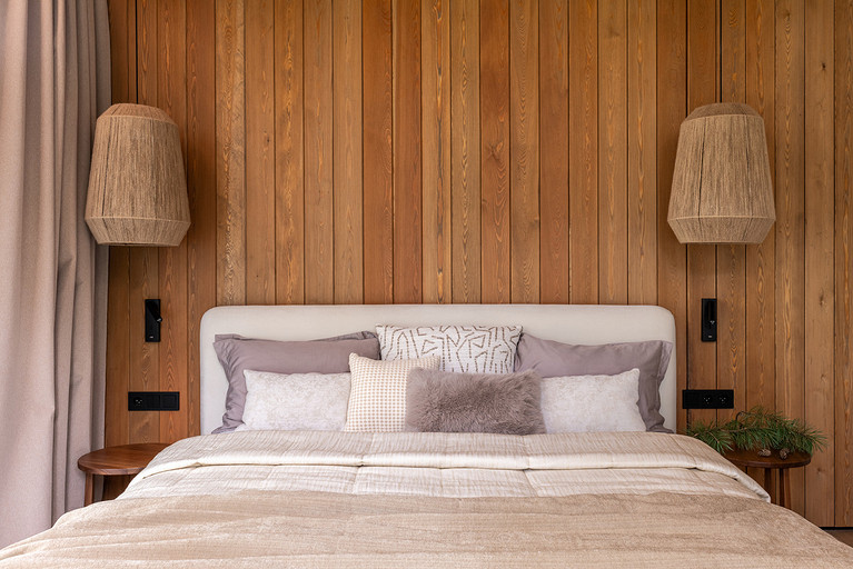 - Стены и потолок: вагонка из лиственницы, тонированное масло «Осмо»