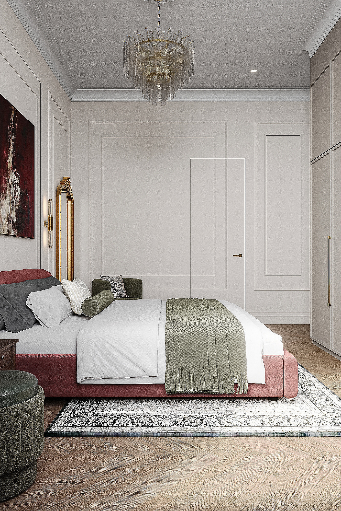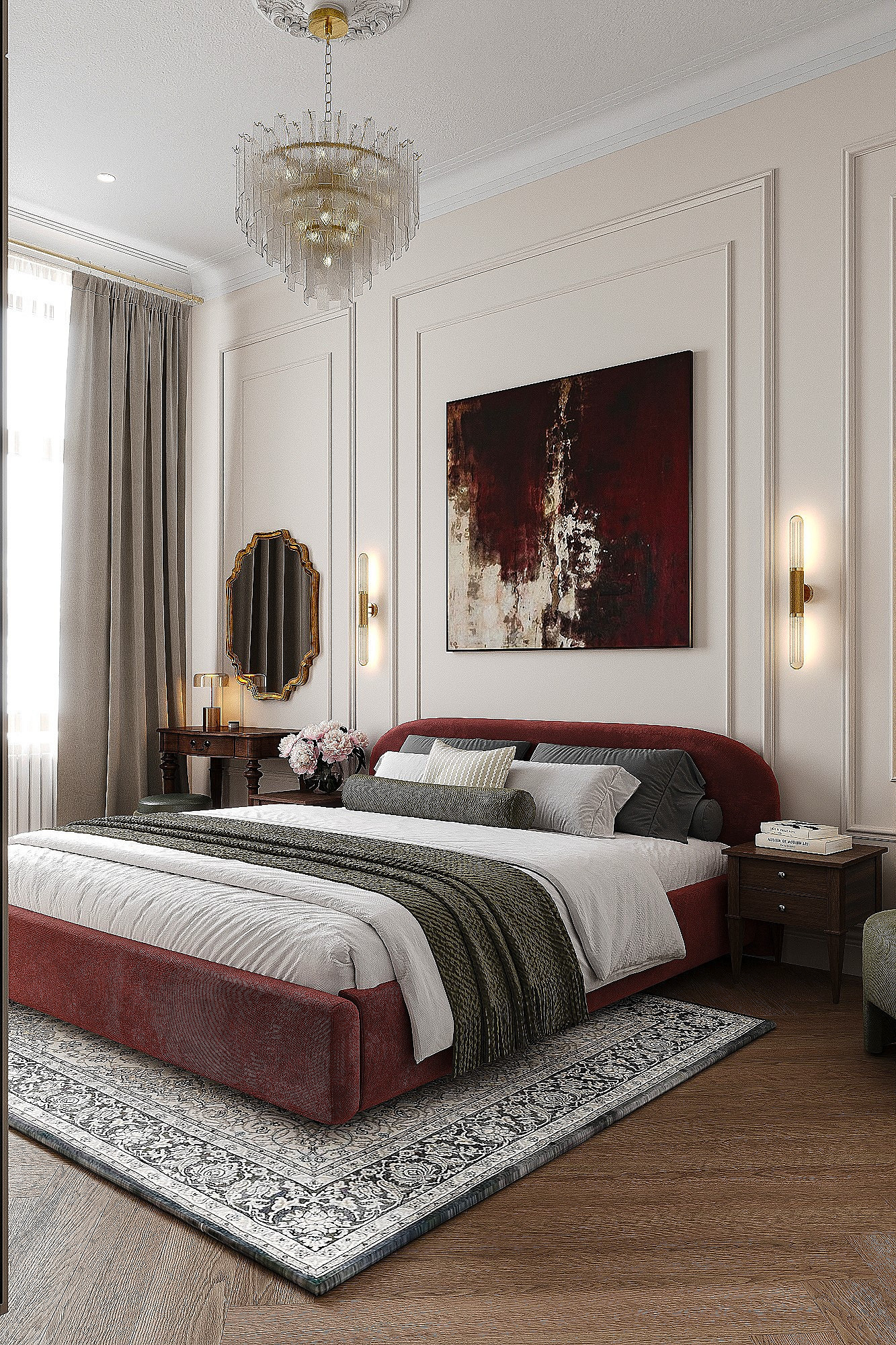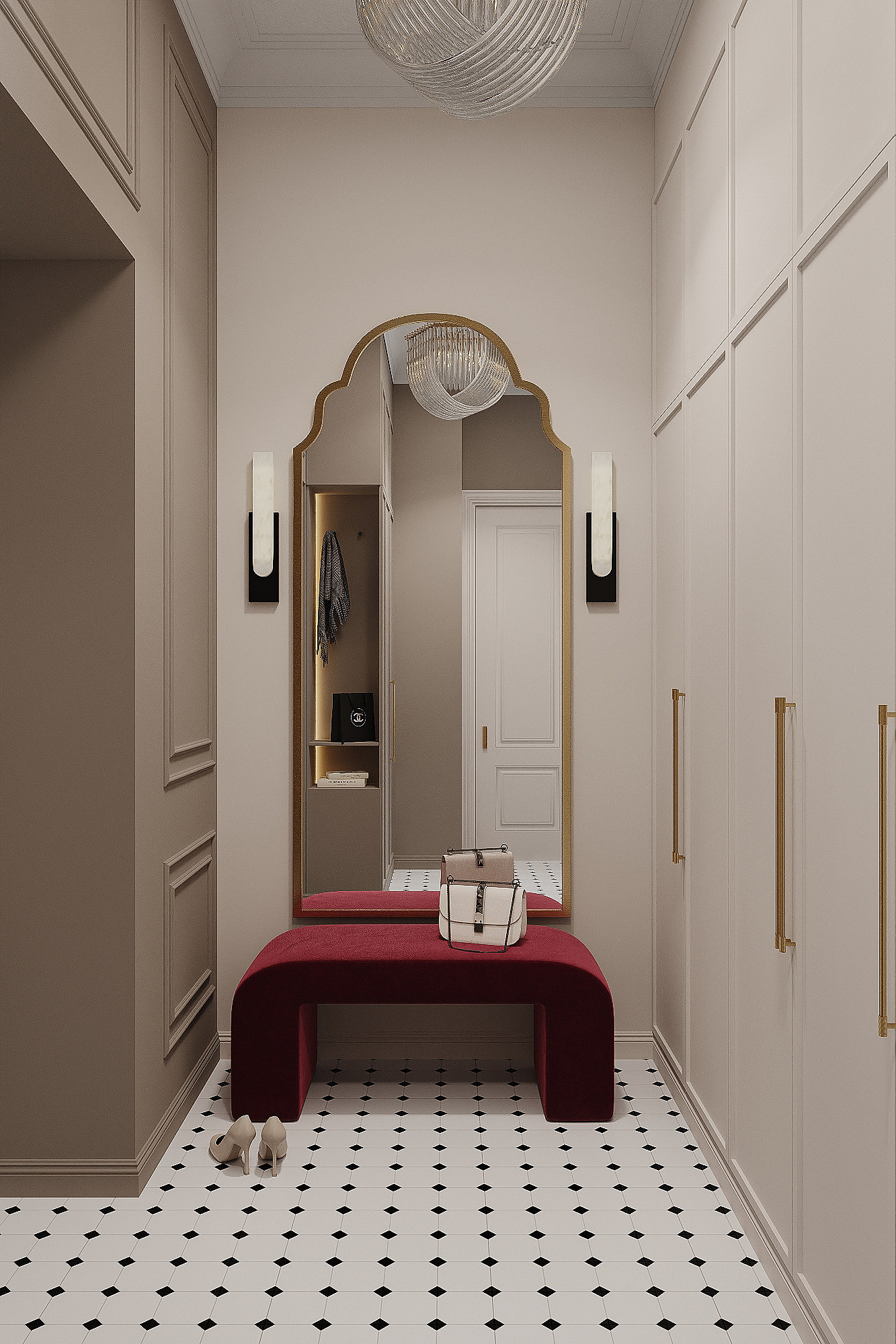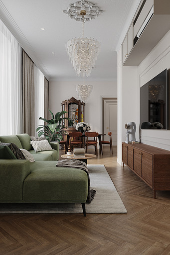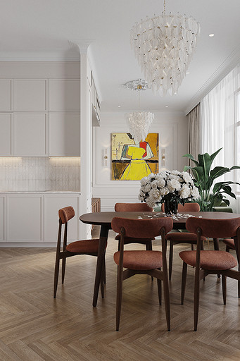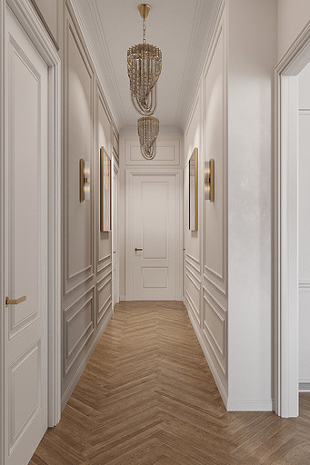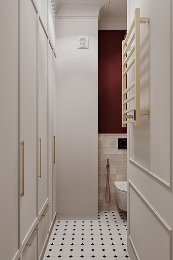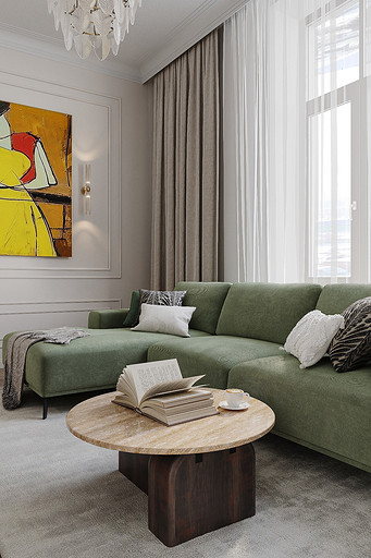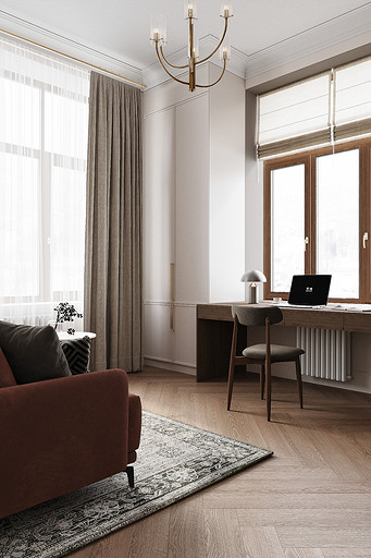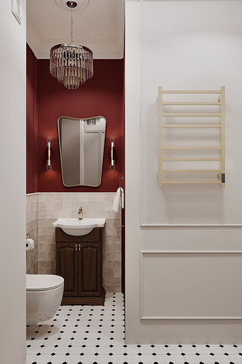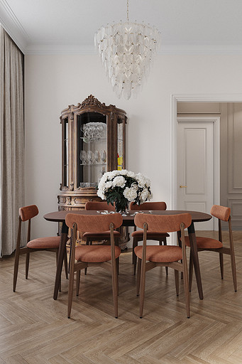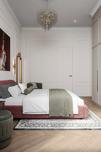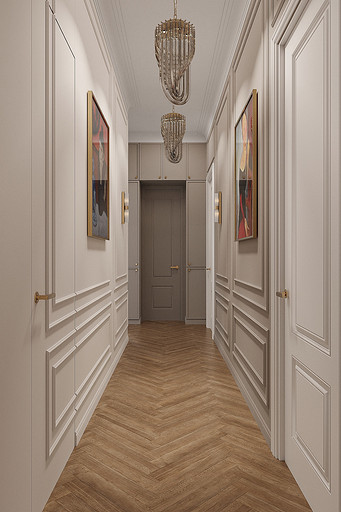 Высокие потолки в 3,4 метра стали идеальным холстом для создания утонченного интерьера в стиле французской классики, приправленного пикантными акцентами. Сердцем концепции является гармония: правильные формы, симметрия и композиционное единство пронизывают каждый уголок пространства. Цветовая палитра построена на изысканных сочетаниях, где нежные оттенки серого и бежевого переплетаются с глубокими акцентами золота и бордо. Особое внимание уделено функциональности. Зоны, деликатно интегрированные в пространство, остаются практически незаметными при первом взгляде, не нарушают ощущение легкости и воздушности. Винтажные элементы играют ключевую роль в создании неповторимого шарма. Антикварные зеркала, изящная мебель с изогнутыми ножками и люстра с хрустальными подвесками добавляют интерьеру исторической глубины и аутентичности. Этот интерьер – не просто место для жизни, а настоящее произведение искусства, где французская классика обретает новую жизнь в современном исполнении.