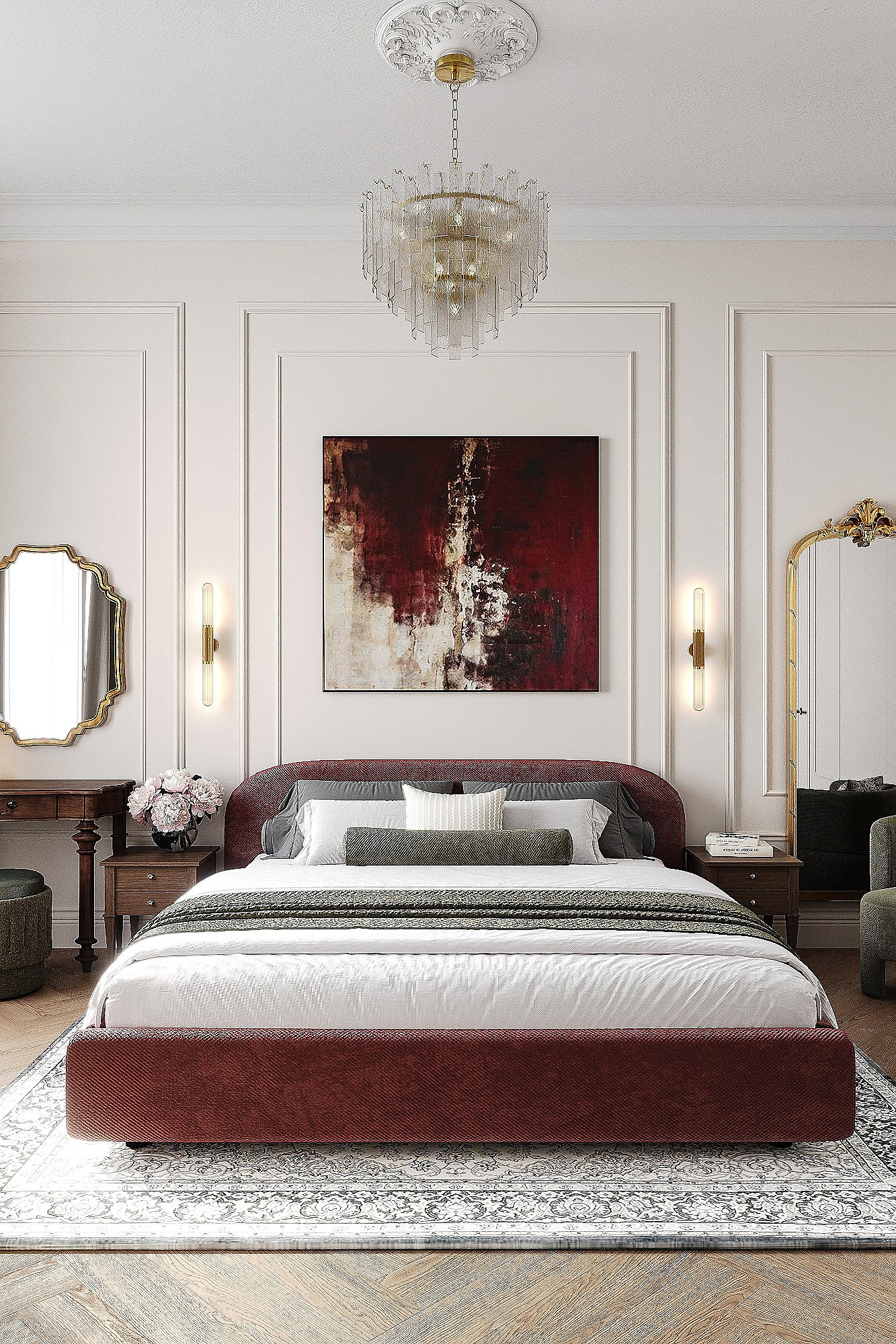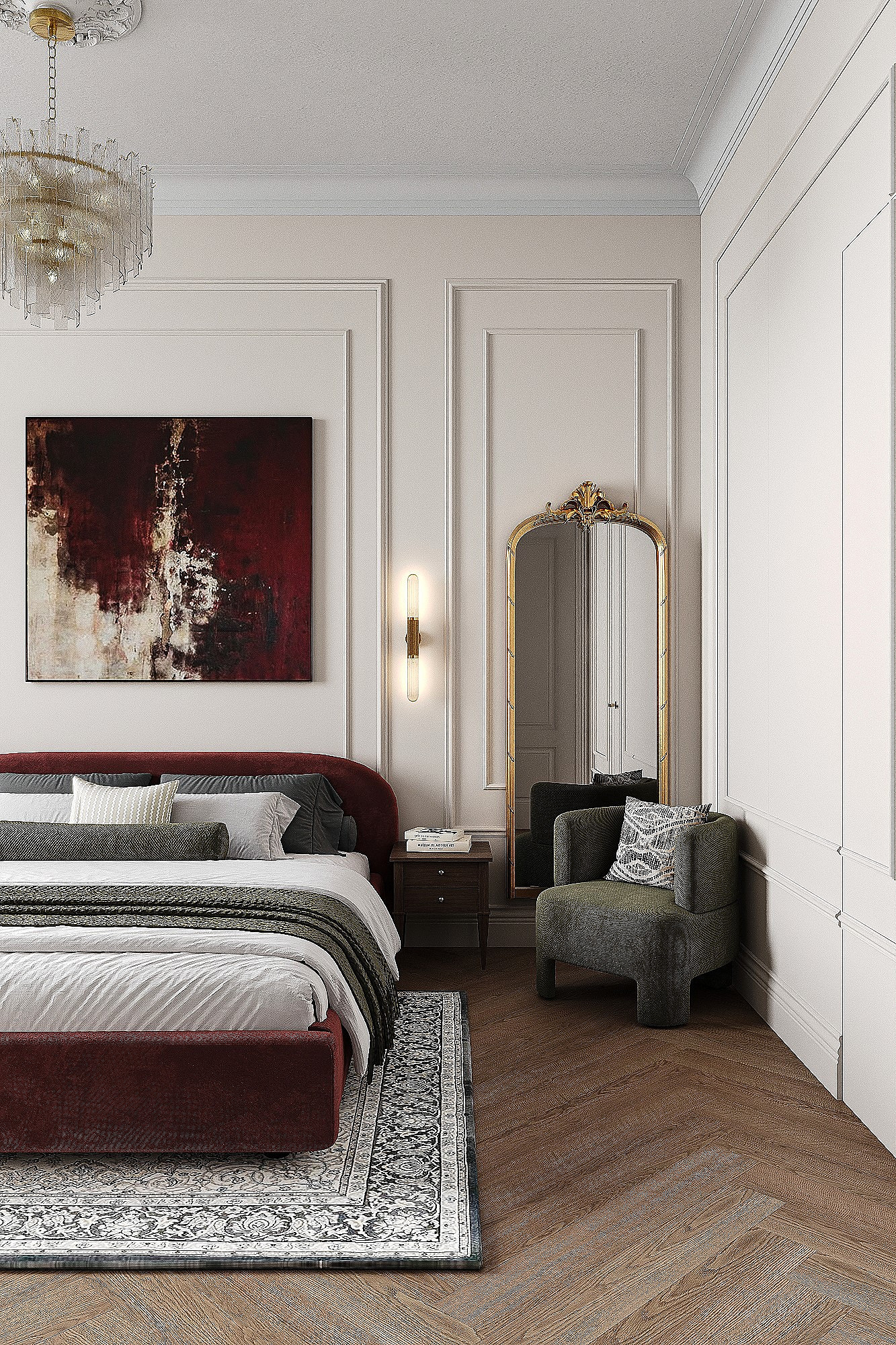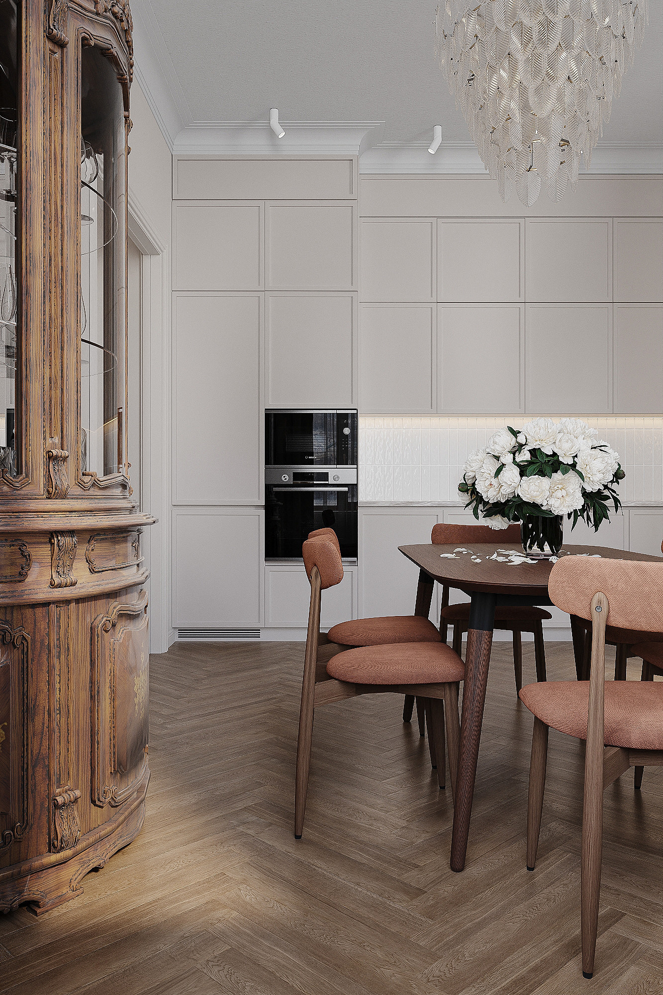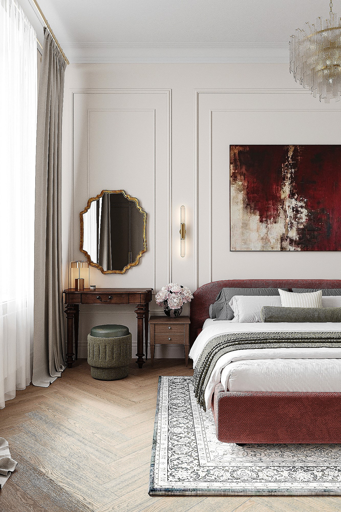 Высокие потолки в 3,4 метра стали идеальным холстом для создания утонченного интерьера в стиле французской классики, приправленного пикантными акцентами. Сердцем концепции является гармония: правильные формы, симметрия и композиционное единство пронизывают каждый уголок пространства. Цветовая палитра построена на изысканных сочетаниях, где нежные оттенки серого и бежевого переплетаются с глубокими акцентами золота и бордо. Особое внимание уделено функциональности. Зоны, деликатно интегрированные в пространство, остаются практически незаметными при первом взгляде, не нарушают ощущение легкости и воздушности. Винтажные элементы играют ключевую роль в создании неповторимого шарма. Антикварные зеркала, изящная мебель с изогнутыми ножками и люстра с хрустальными подвесками добавляют интерьеру исторической глубины и аутентичности. Этот интерьер – не просто место для жизни, а настоящее произведение искусства, где французская классика обретает новую жизнь в современном исполнении.