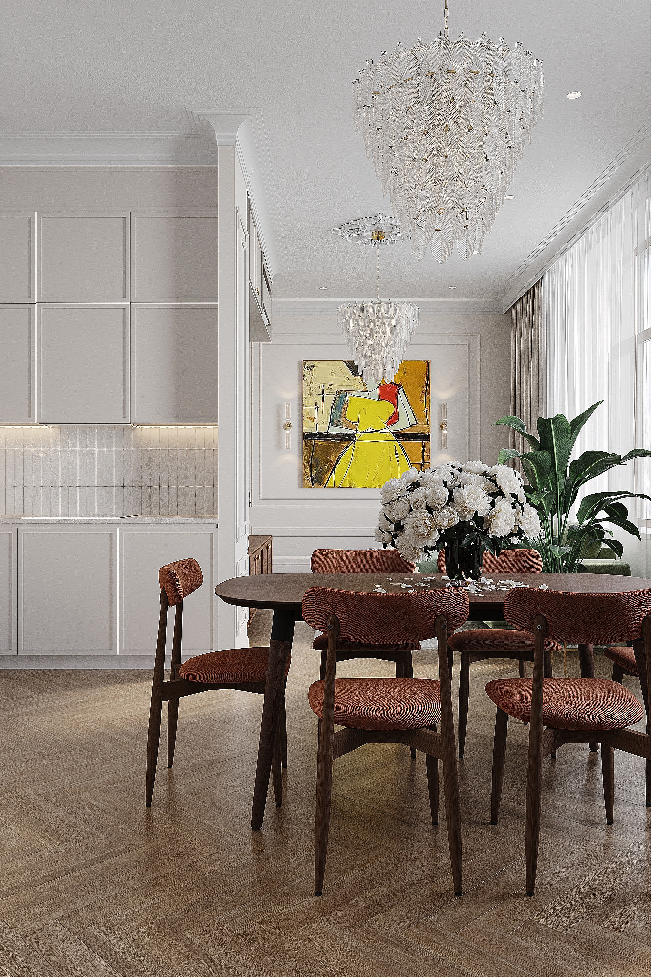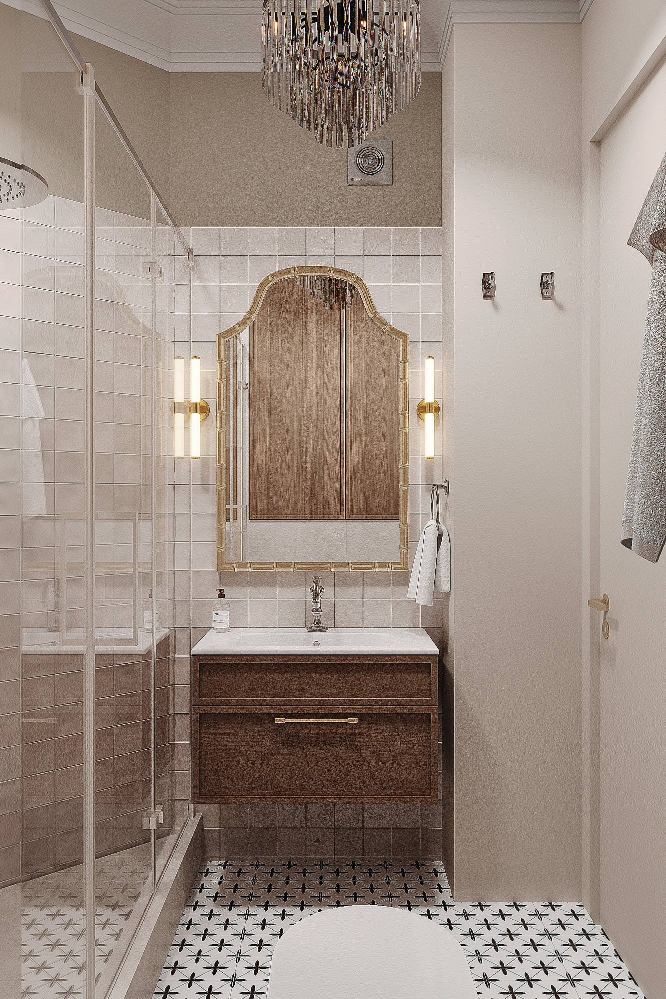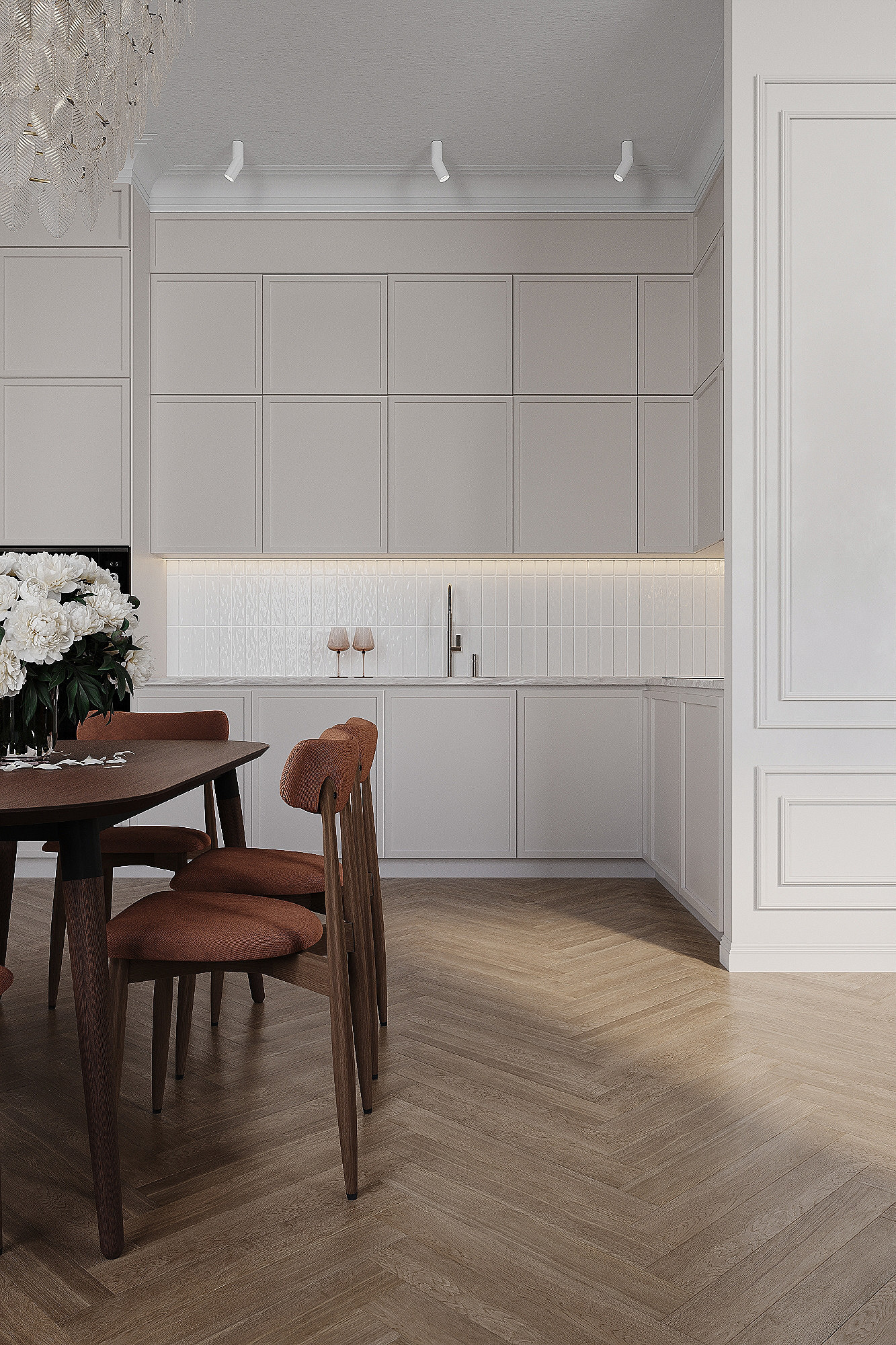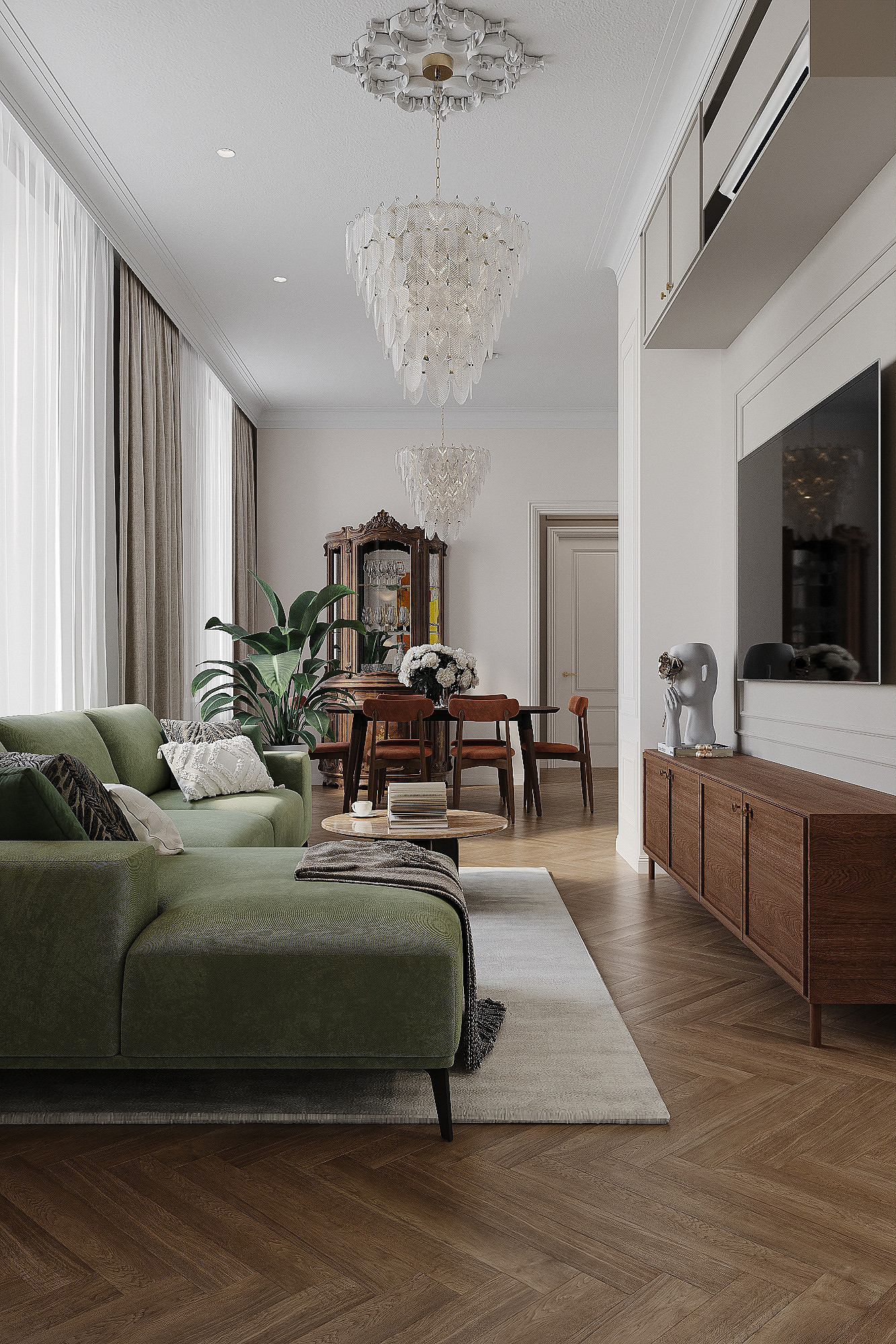Высокие потолки в 3,4 метра стали идеальным холстом для создания утонченного интерьера в стиле французской классики, приправленного пикантными акцентами. Сердцем концепции является гармония: правильные формы, симметрия и композиционное единство пронизывают каждый уголок пространства. Цветовая палитра построена на изысканных сочетаниях, где нежные оттенки серого и бежевого переплетаются с глубокими акцентами золота и бордо. Особое внимание уделено функциональности. Зоны, деликатно интегрированные в пространство, остаются практически незаметными при первом взгляде, не нарушают ощущение легкости и воздушности. Винтажные элементы играют ключевую роль в создании неповторимого шарма. Антикварные зеркала, изящная мебель с изогнутыми ножками и люстра с хрустальными подвесками добавляют интерьеру исторической глубины и аутентичности. Этот интерьер – не просто место для жизни, а настоящее произведение искусства, где французская классика обретает новую жизнь в современном исполнении.
