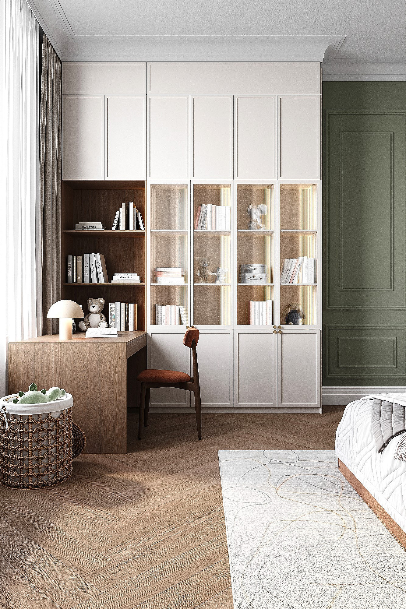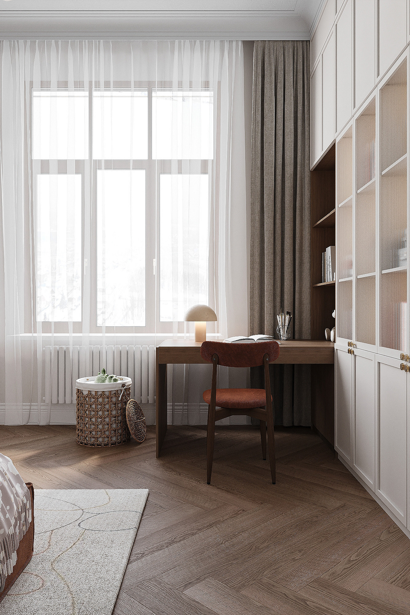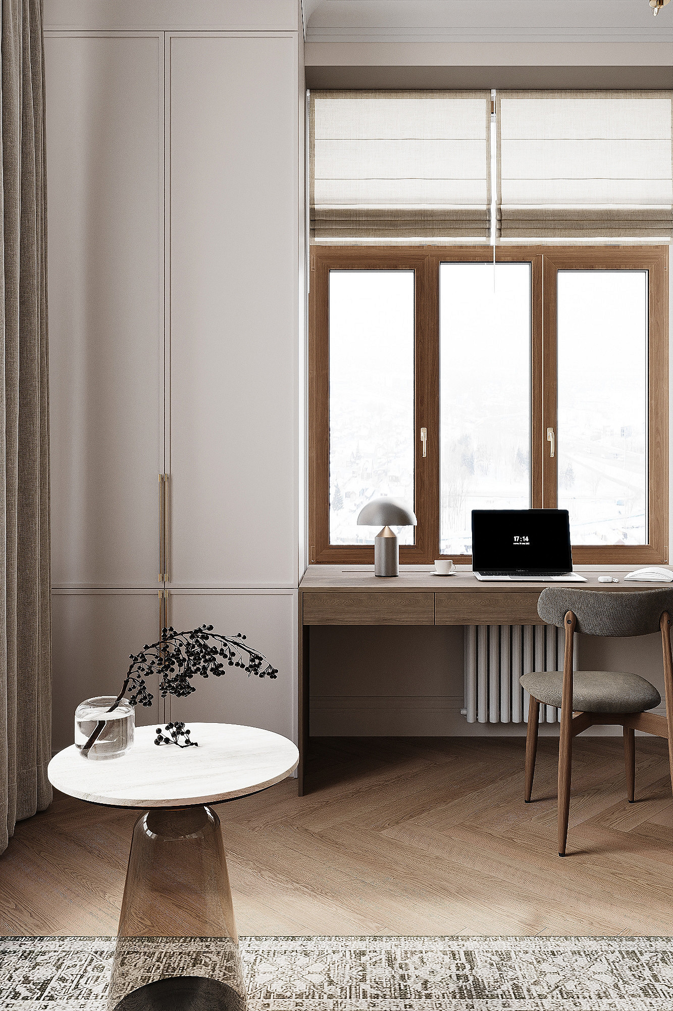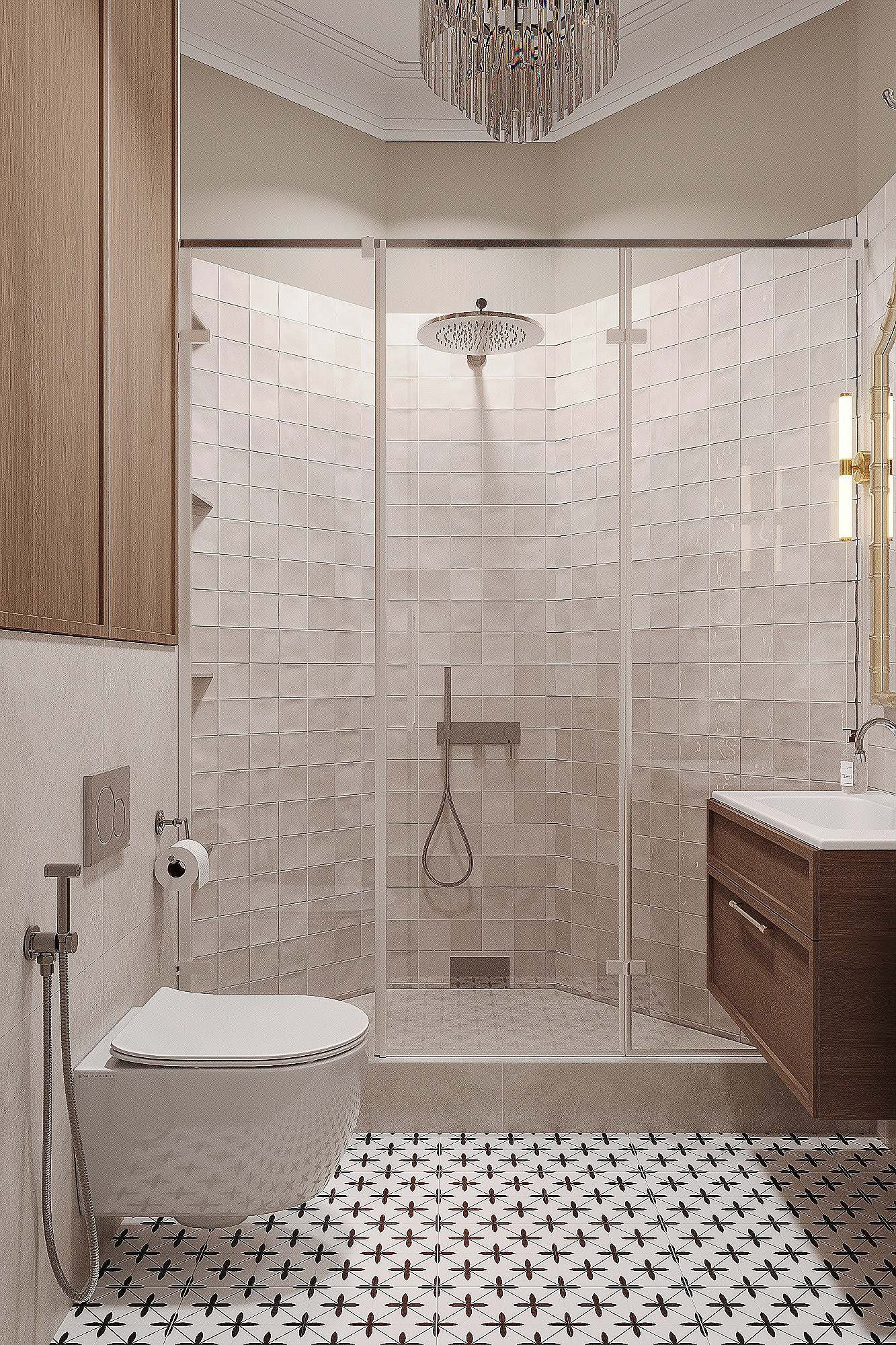Высокие потолки в 3,4 метра стали идеальным холстом для создания утонченного интерьера в стиле французской классики, приправленного пикантными акцентами. Сердцем концепции является гармония: правильные формы, симметрия и композиционное единство пронизывают каждый уголок пространства. Цветовая палитра построена на изысканных сочетаниях, где нежные оттенки серого и бежевого переплетаются с глубокими акцентами золота и бордо. Особое внимание уделено функциональности. Зоны, деликатно интегрированные в пространство, остаются практически незаметными при первом взгляде, не нарушают ощущение легкости и воздушности. Винтажные элементы играют ключевую роль в создании неповторимого шарма. Антикварные зеркала, изящная мебель с изогнутыми ножками и люстра с хрустальными подвесками добавляют интерьеру исторической глубины и аутентичности. Этот интерьер – не просто место для жизни, а настоящее произведение искусства, где французская классика обретает новую жизнь в современном исполнении.