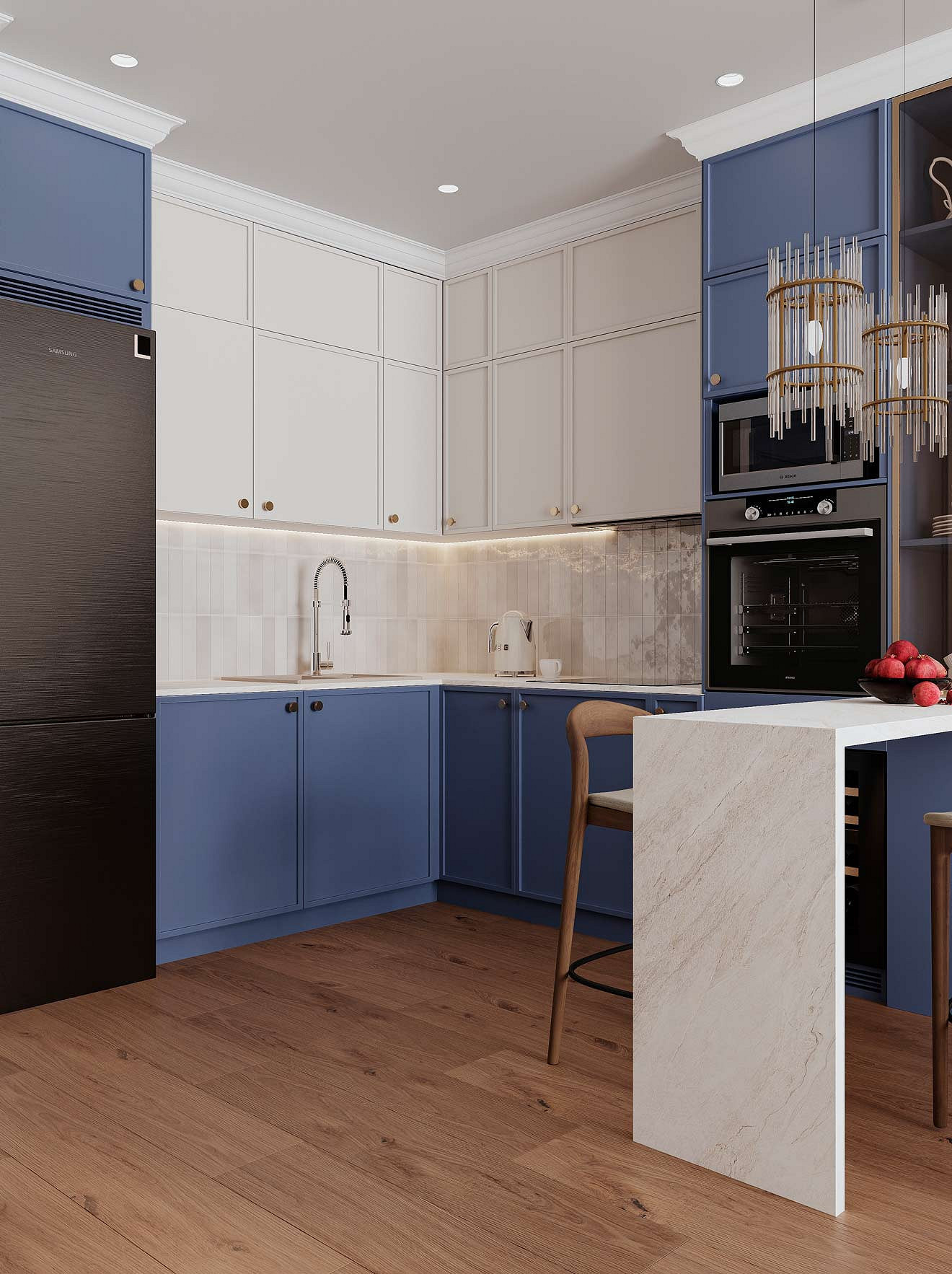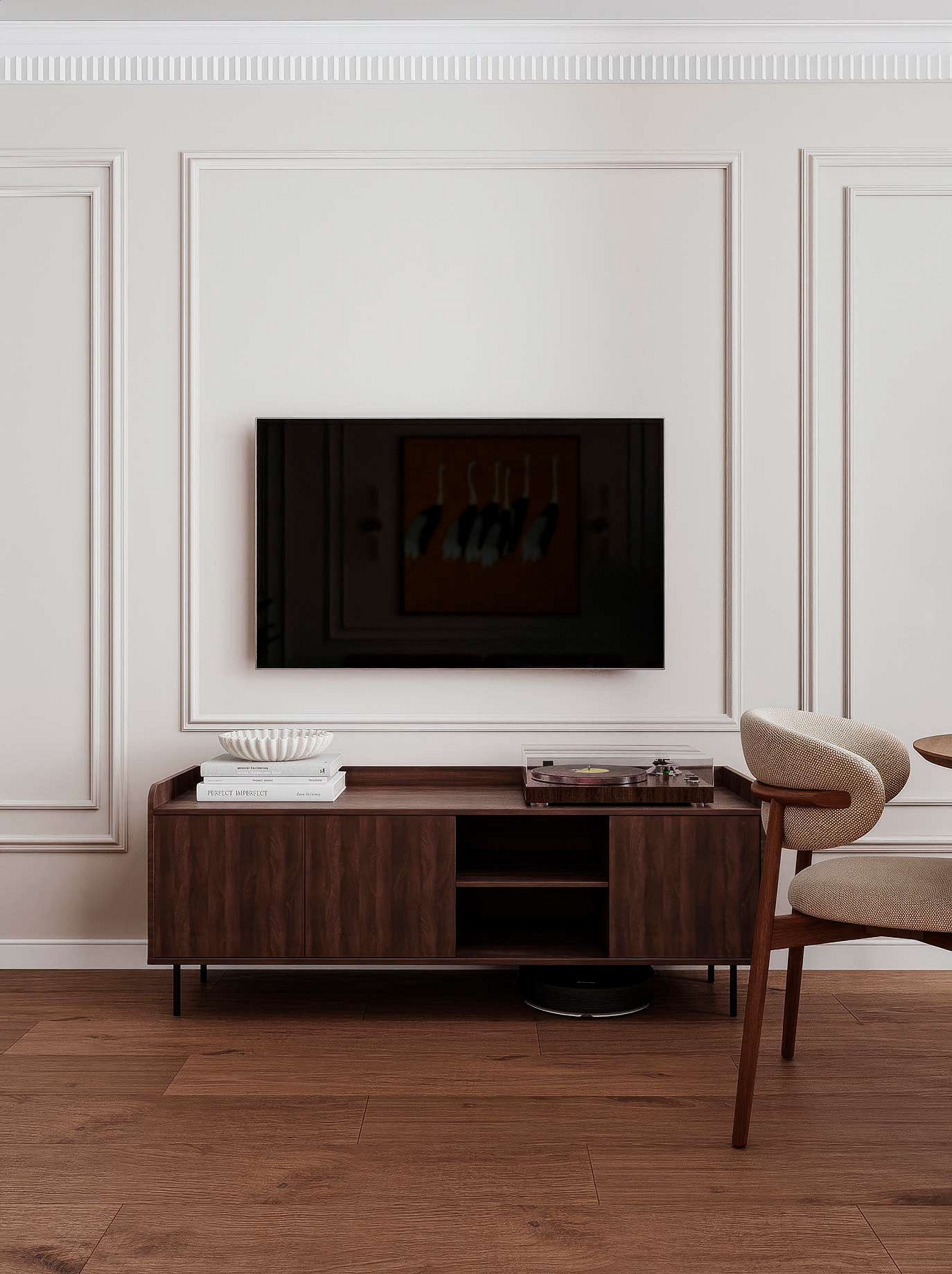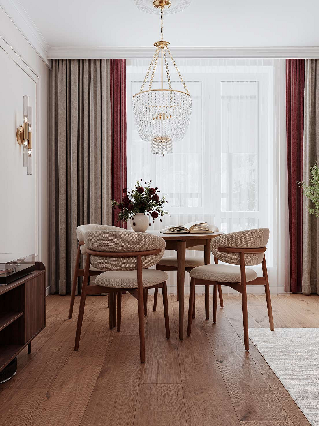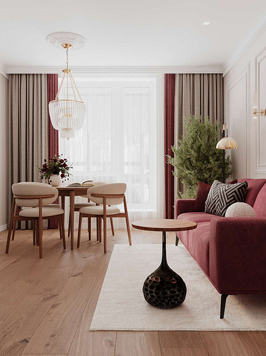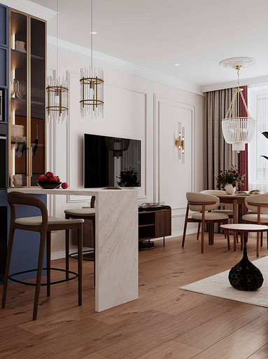 Стильный и элегантный интерьер квартиры в стиле французская классика с элементами винтажа, который сочетает в себе роскошь, утонченность и уют. Основная идея — подчеркнуть изысканность французского шика, добавив нотки винтажной романтики и драматизма, что достигается использованием декоративных деталей, антикварных элементов и мягких пастельных тонов.