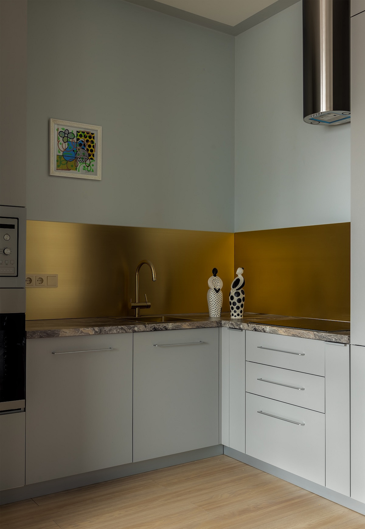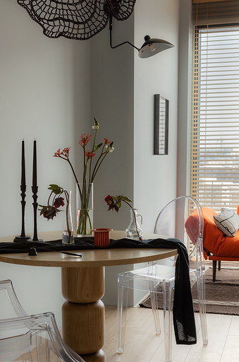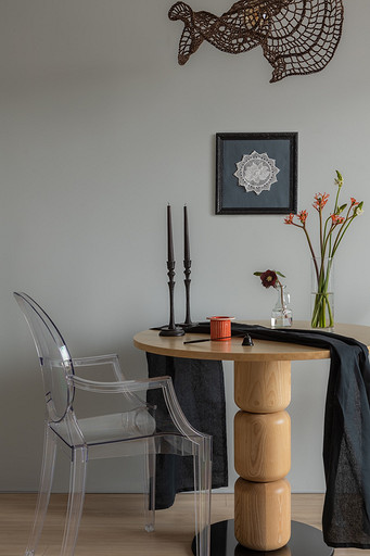 - Мебель: стол Anni Haus, стулья Kartell, диван Innovation Living, металлический стул «Манэр Мэтэр», кухня и шкафы сделаны на заказ, кресло и тумба H&M Home