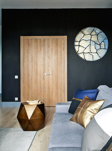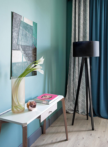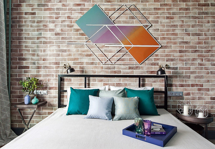 - Аксессуары: панно над кроватью Ирины Маркман, галерея современного искусства ArtBrut Moscow, декор Crate and Barrel, декор Naf-Naf house, декор H&M Home, шторы IKEA