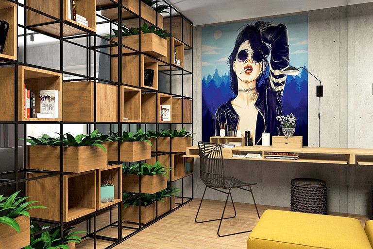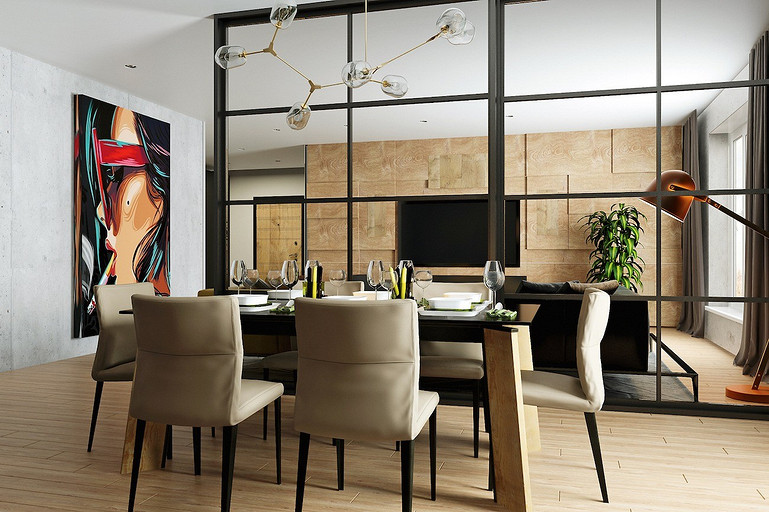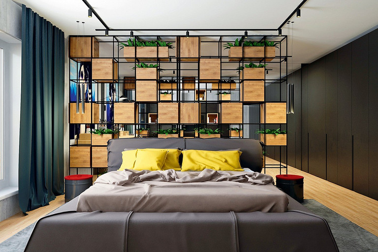 Лофт, в котором стены заменили стеклянной перегородкой и стеллажом