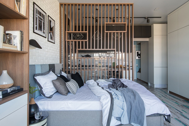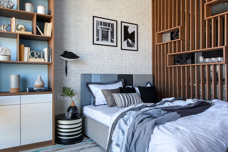 - Мебель: кухонная мебель, шкафы, перегородка — на заказ, стулья полубарные Ghost, кровать с подъёмным механизмом Hoff, стул Eames