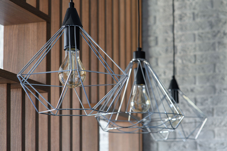 - Светильники: потолочные точечные встраиваемые, трековые в зоне кухни SWG, подвесы над барной стойкой Lucide, бра и настольная лампа Cosmorеlax