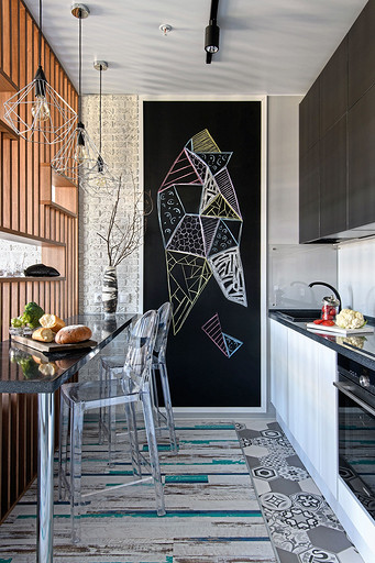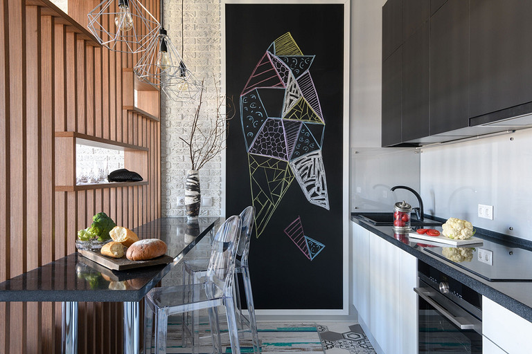 - Стены: краска Derufa, декоративный кирпич «Сен-Жермен 100» («Леонардо Стоун»), матовая краска для школьных досок Tikkurila