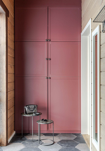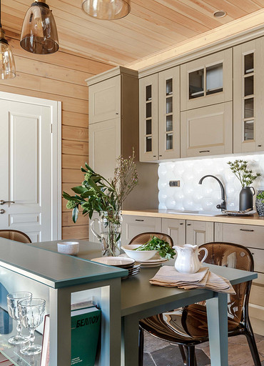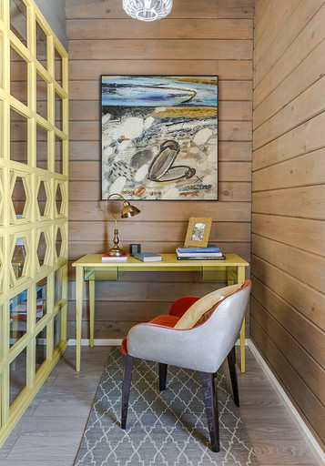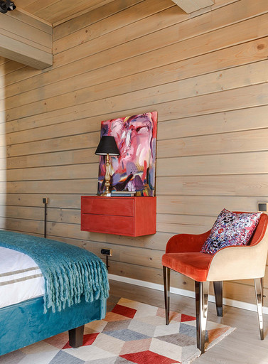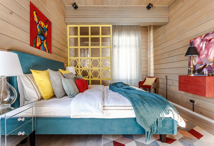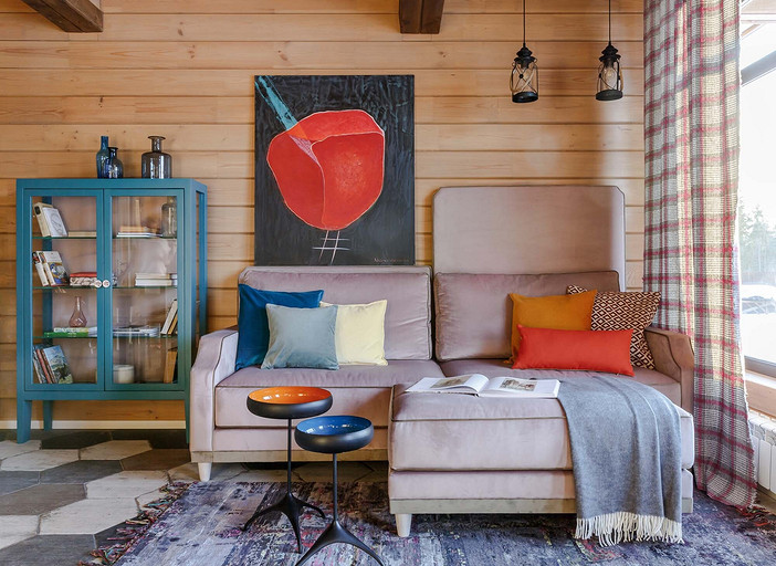 Деревянные стены, яркая мебель и современная живопись: интерьер маленького дома в деревне