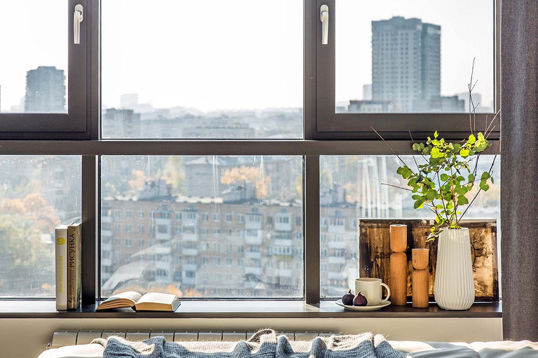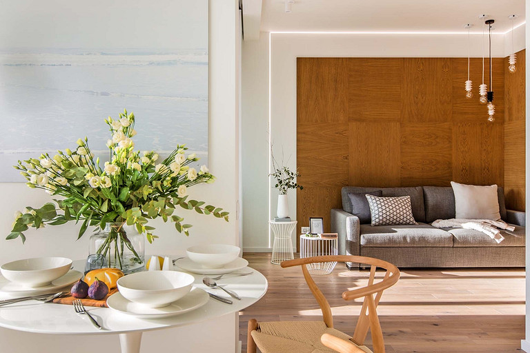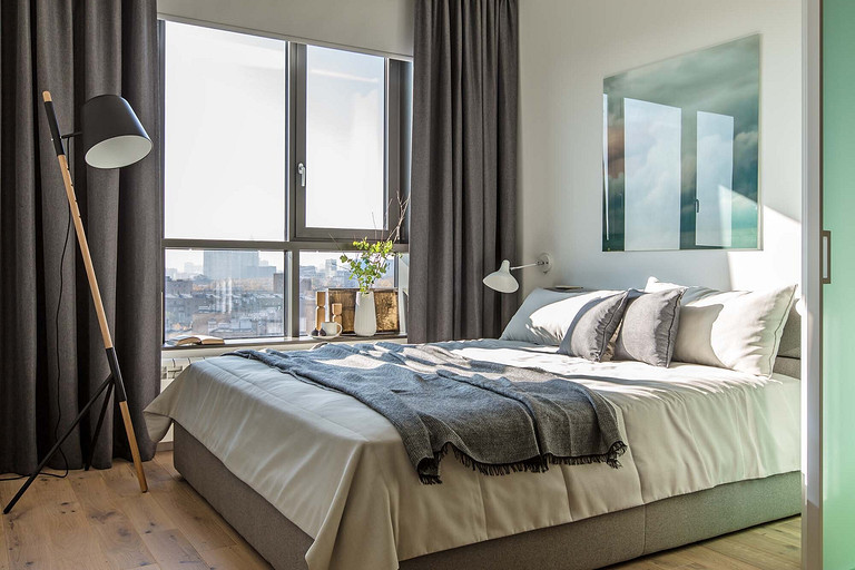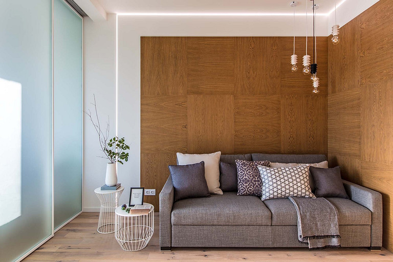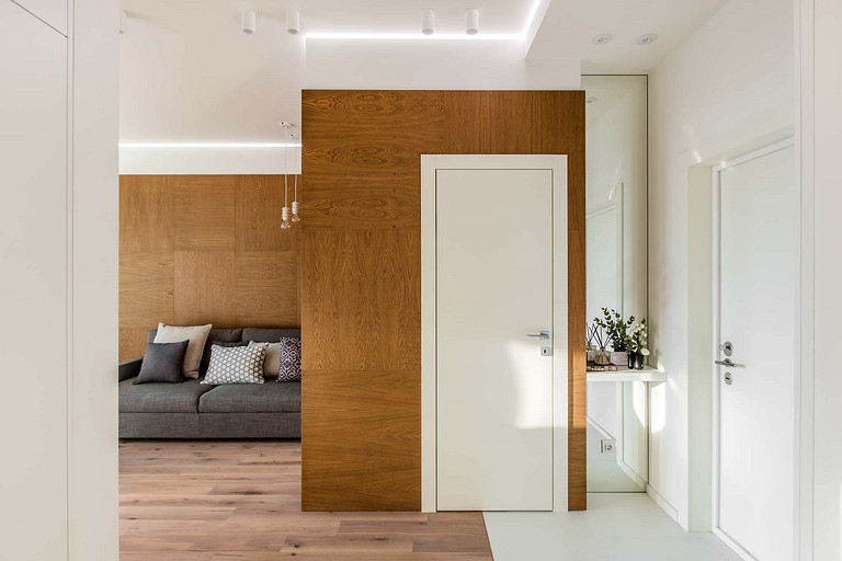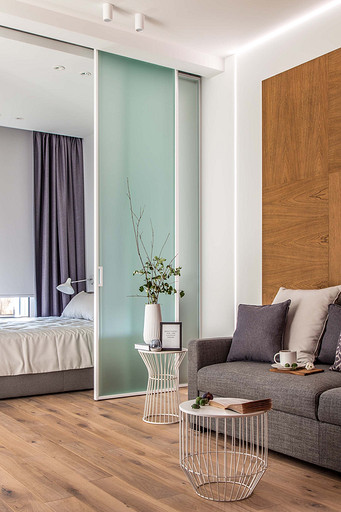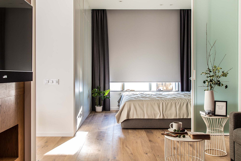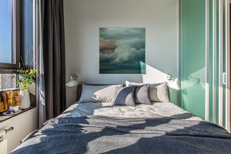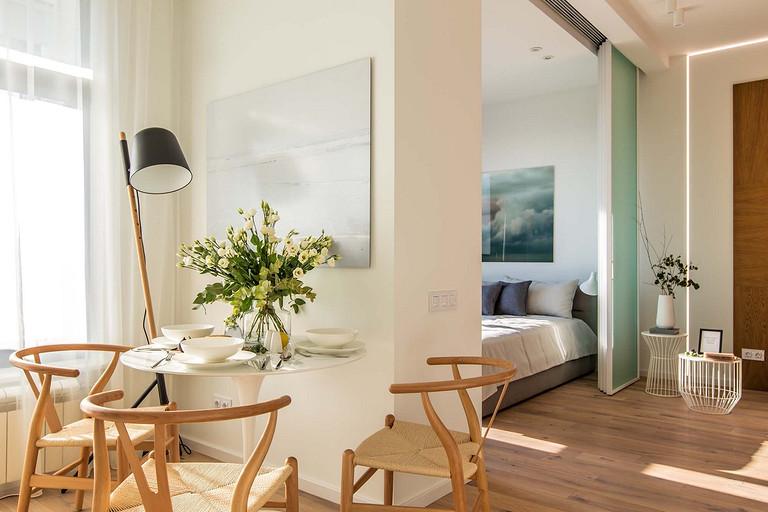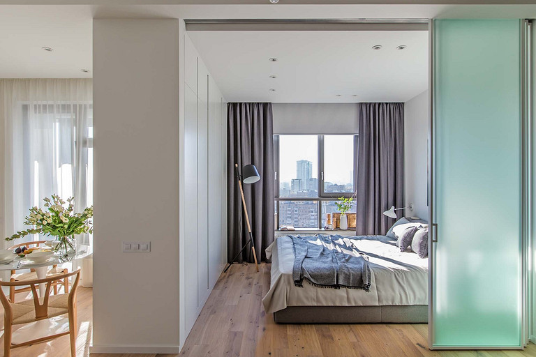 Маленькая квартира свободной планировки с отдельными спальней, гостиной и гардеробной