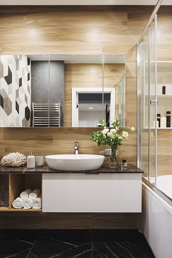 - Пол: керамическая плитка Bestile, переходящая в паркет (без бренда)