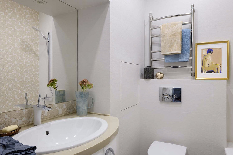 - Сантехника: ванна, унитаз, раковина — все Villeroy & Boch, тумба под раковину — на заказ, столешница — искусcтвенный камень, смесители Hansgrohe