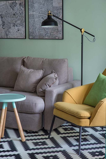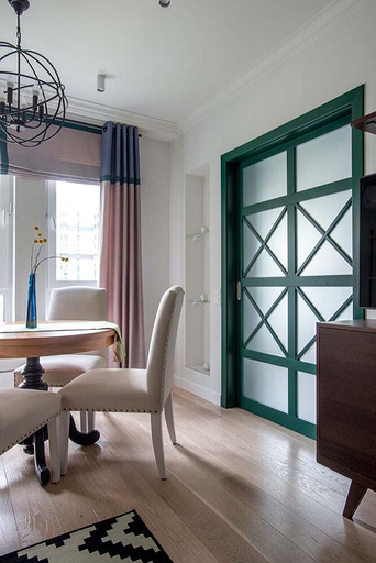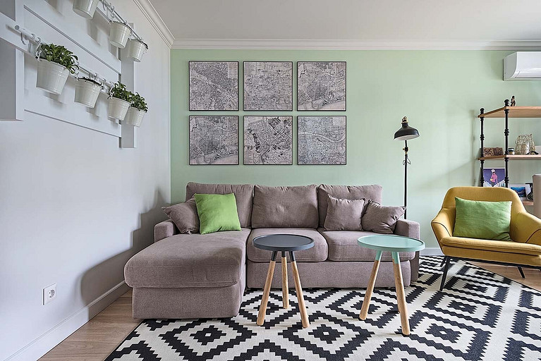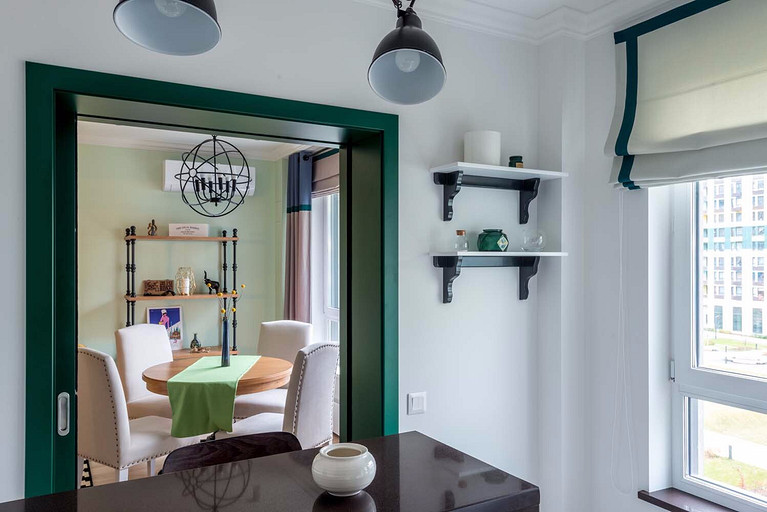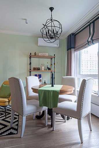 - Мебель: этажерка, стол обеденный «Арт-стиль», стулья Enjoy Home, кресло Gramercy Home, полка для цветов — на заказ по эскизам автора проекта («Арт-стиль»), столики кофейные Cosmorelax, комод Thimon (The Idea)