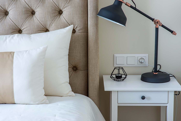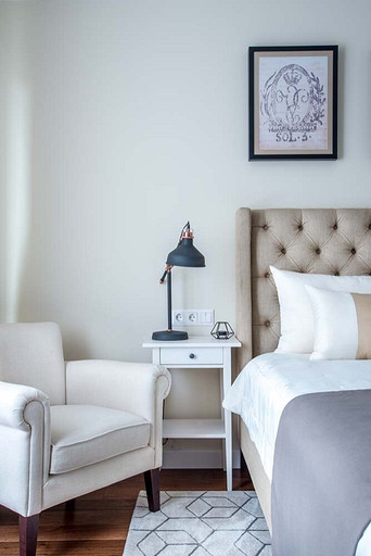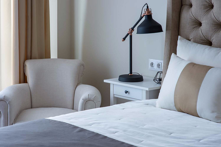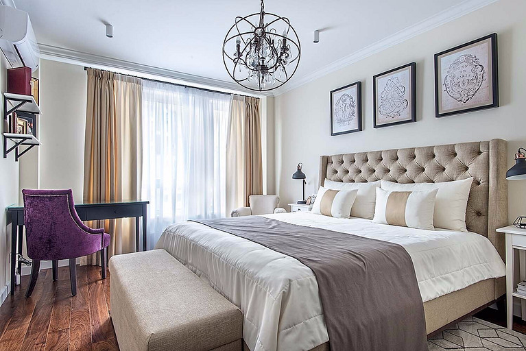 - Мебель: кровать, кресло Enjoy Home, тумбочки ИКЕА, стол «Арт-стиль», кресло Enjoy Home