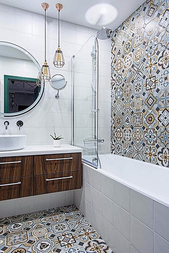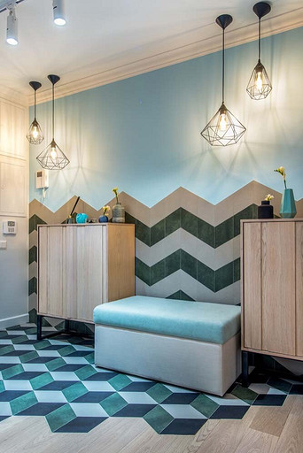 - Пол: керамогранит One Diamond Krea Green, One Diamond Concrete Smoke (Gigacer Play)