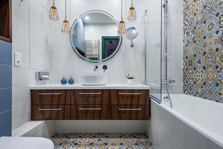 - Сантехника: умывальник, унитаз — GSI, ванна чугунная Jacob Delafon, смесители Ideal Standard, душевая стойка Megliore